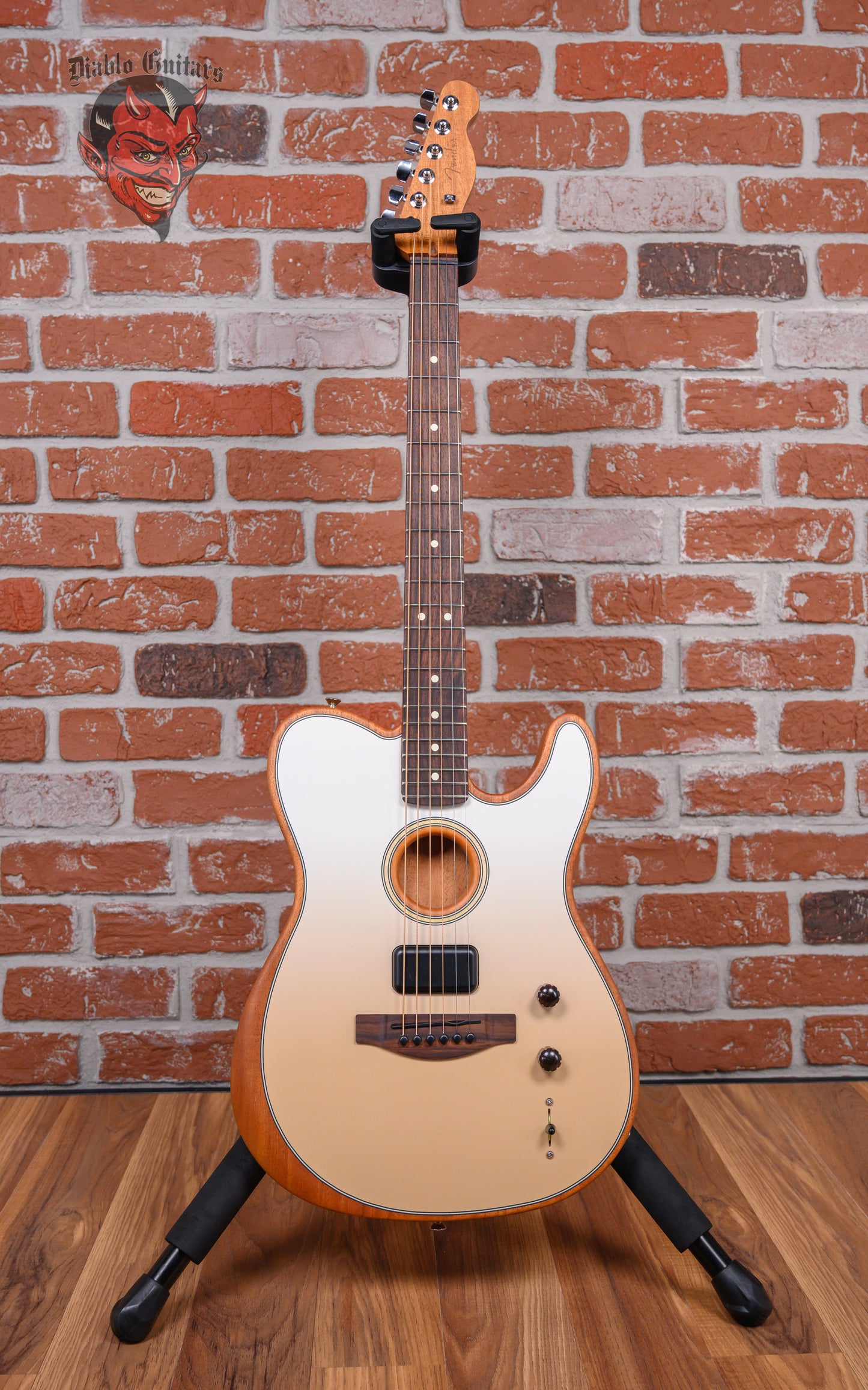 Fender FINNEAS Acoustasonic Player Telecaster in Cappuccino Fade finish made in 2023 with Original Gigbag. This guitar features a hollow mahogany back & sides body with a mahogany top, mahogany neck and rosewood fingerboard with an engraved FINNEAS signature headstock. Equipped with a Fender Acoustasonic Shawbucker in the bridge position and a Fishman Under-saddle Piezo. Controlled by one master volume pot, one "Blend" pot and a 3-way blade switch. The 25.5" scale length neck has white dot inlays and white side markers with 22 narrow tall frets on a 12" radius with a Modern "Deep C" profile. The hardware is comprised of chrome Fender Standard Staggered Sealed die-cast tuning machines with cloche heads, a Graph Tech TUSQ nut, a Fender Modern Asymmetrical bridge w/ Rosewood Base & Graph Tech TUSQ bridge pins and wood grip knobs.
