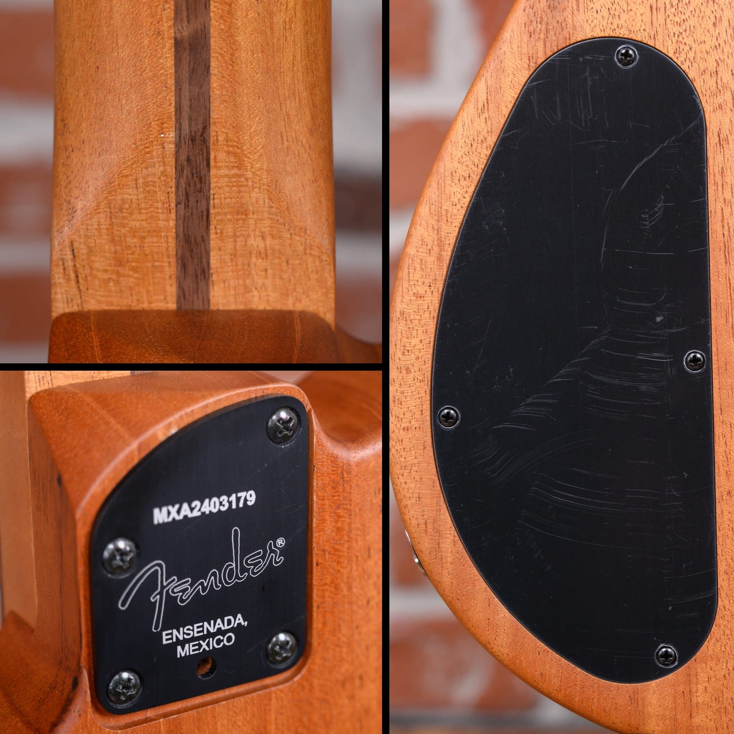 This guitar is in overall excellent condition. There are a couple of small dings near the neck joint and some light marks on the neck plate. The electronics control cavity plate has light marks across it. There are some small spots of discoloration on the front of the body near the bridge and controls. The bridge has some marks around the bridge pins. (See Pics)