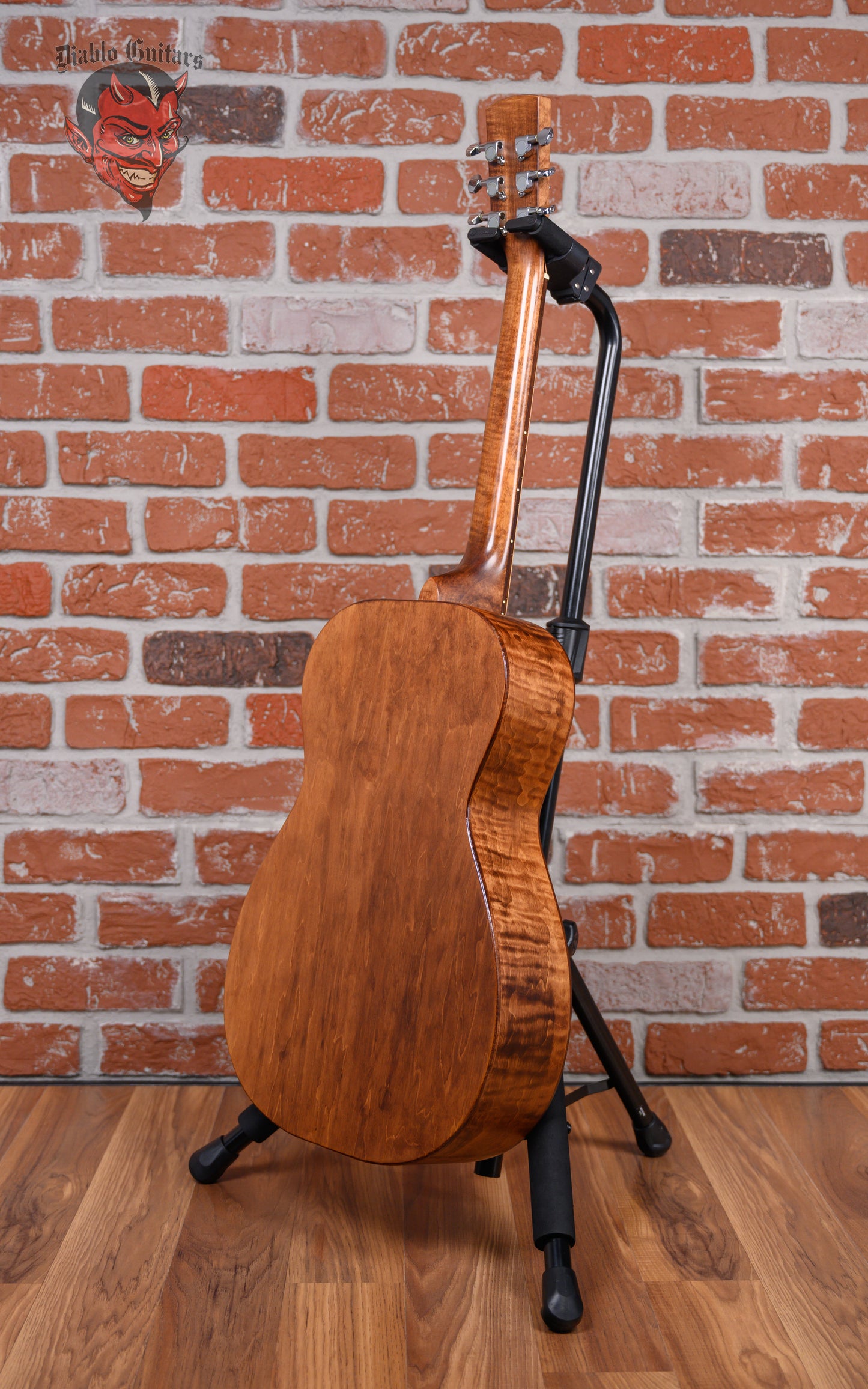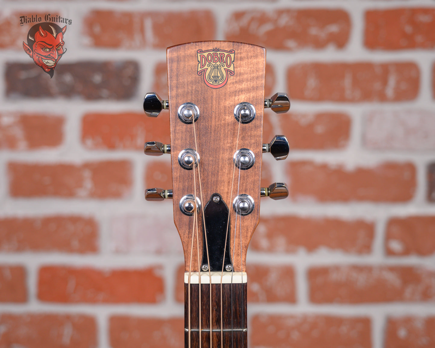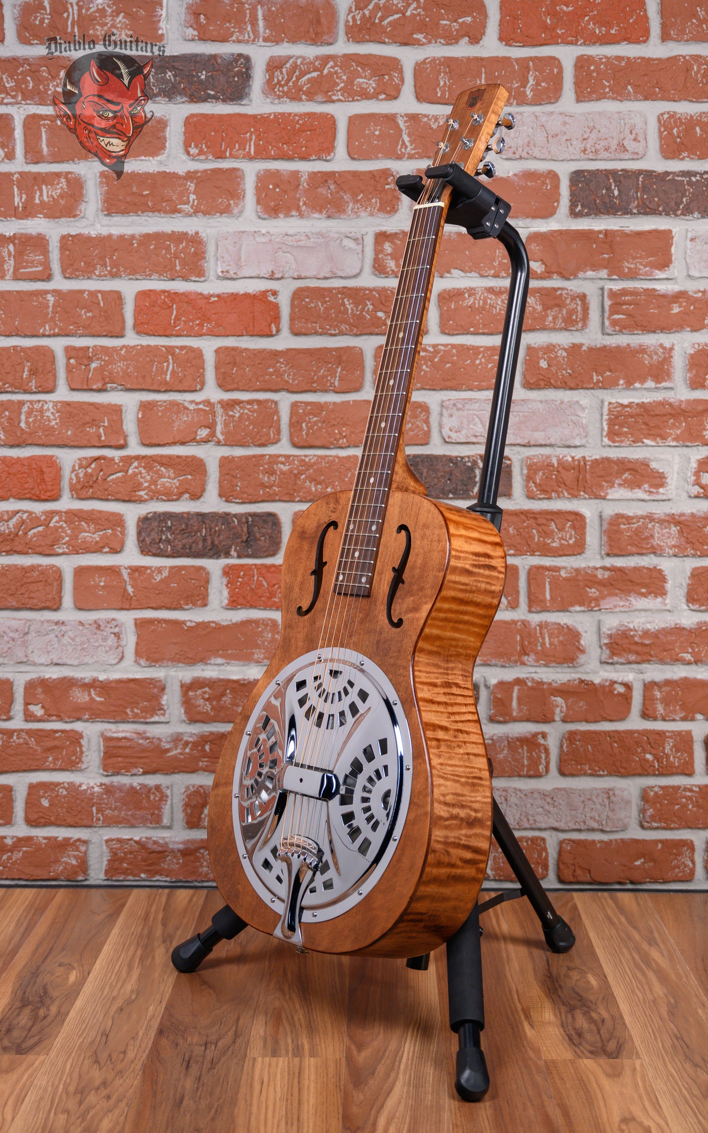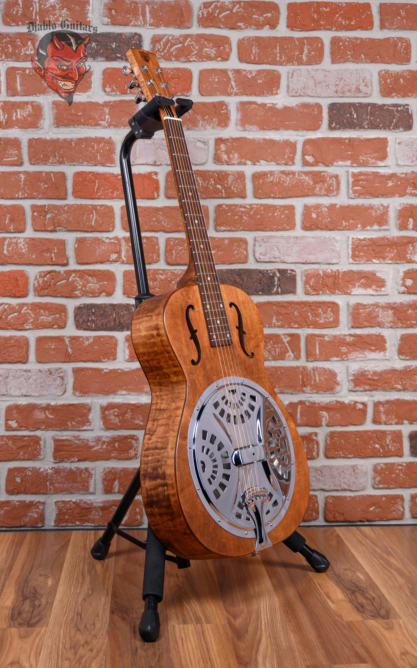 Gibson Dobro Hound Dog Roundneck in Hand Rubbed Vintage Brown finish made in 2005 with Hard Shell Case. This resonator guitar features a double bound curly maple back & sides body with a curly maple top, curly maple neck and rosewood fingerboard. Equipped with a K&K Pure Resonator spider cone pickup. The 25" scale length neck has pearloid dot inlays and white side markers with 19 medium frets on a 12" radius with a rounded D profile. The hardware is comprised of nickel/chrome Gibson sealed diecast tuning machines with cloche heads, a synthetic bone nut and a spider bridge.
