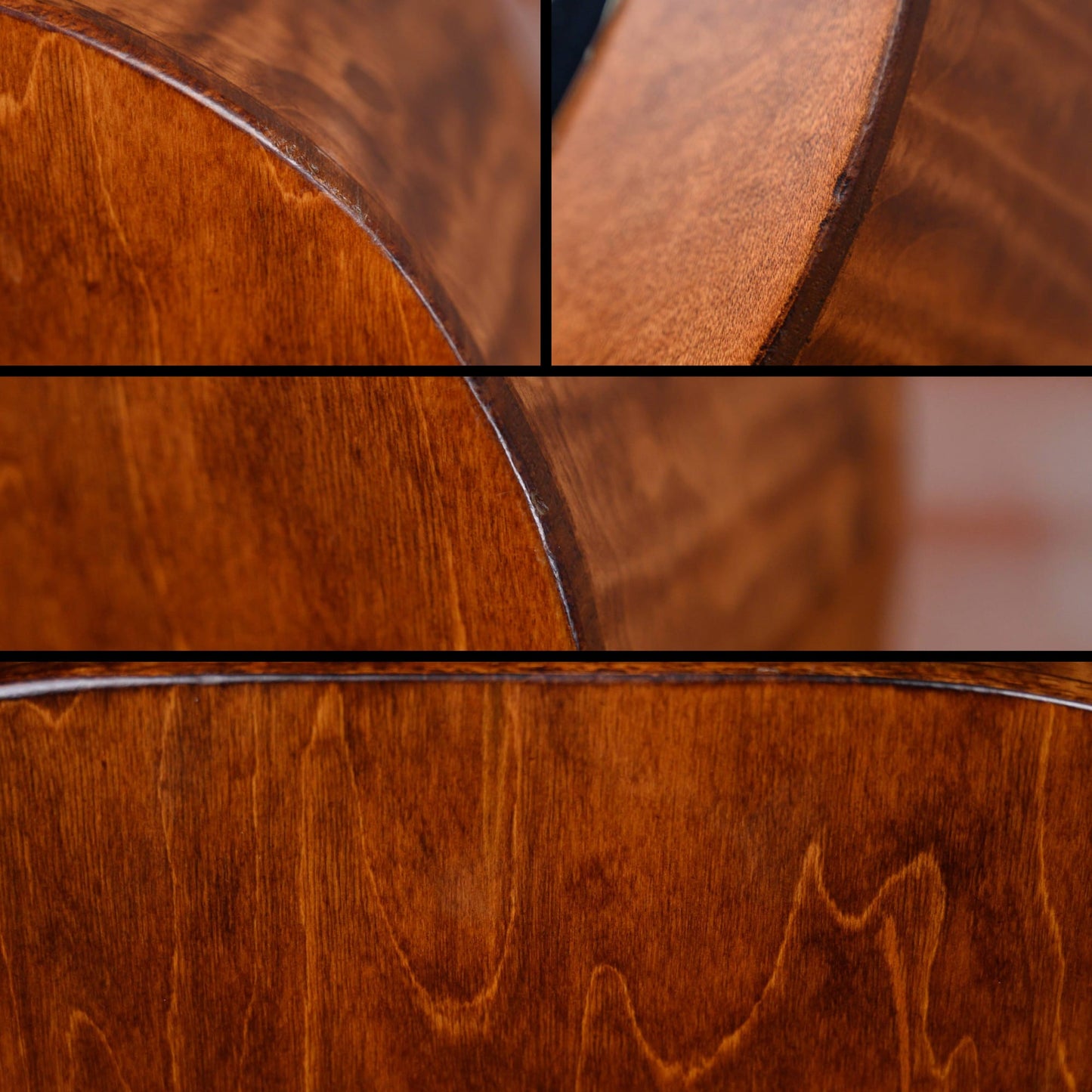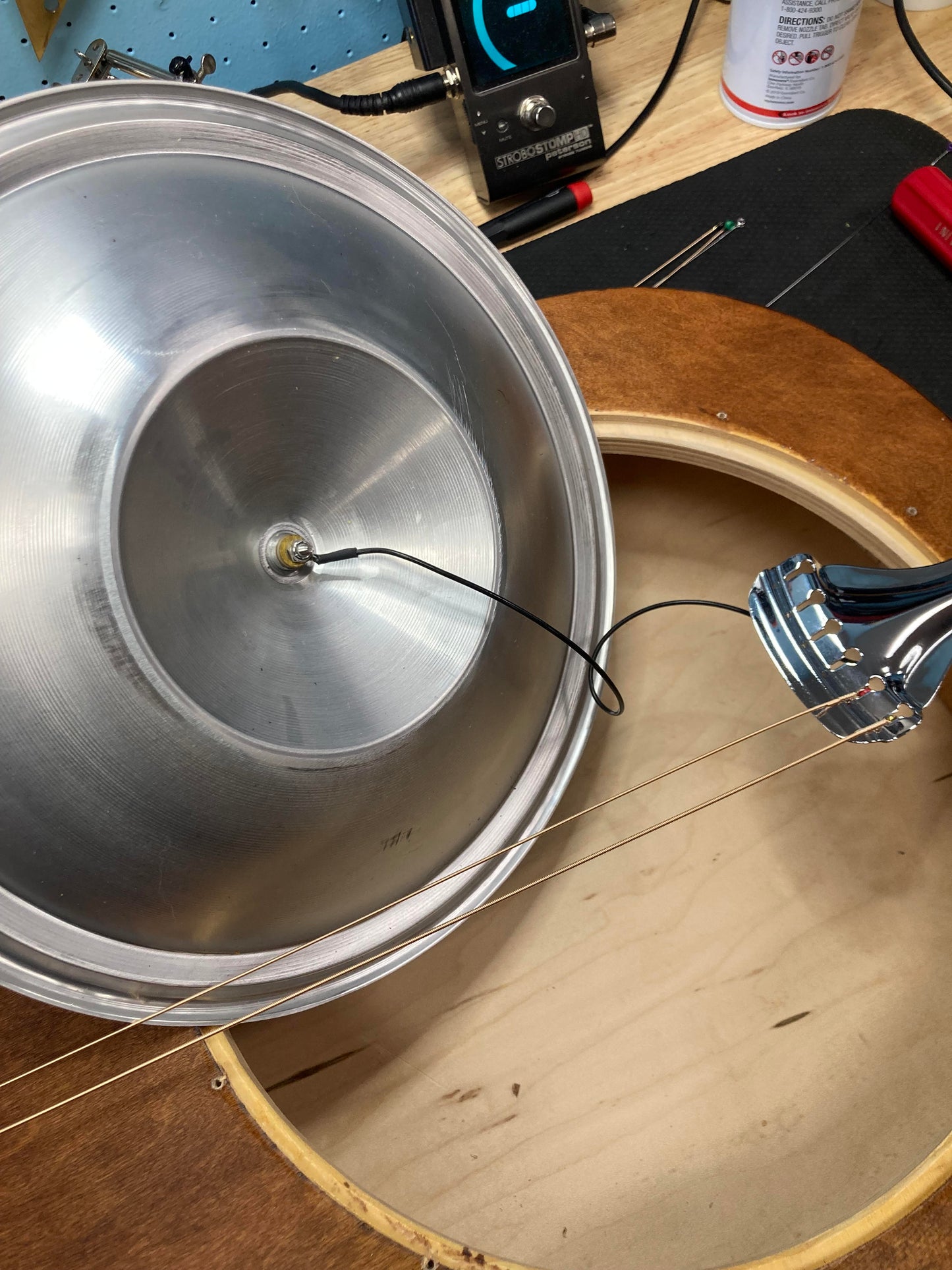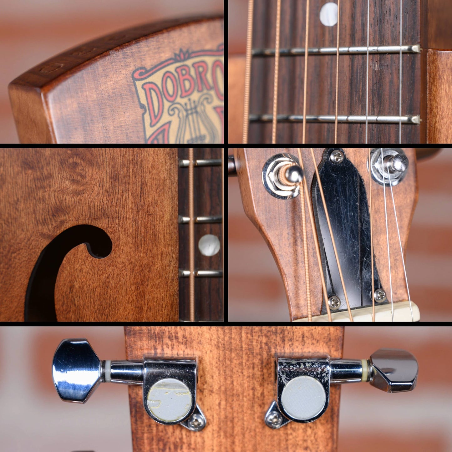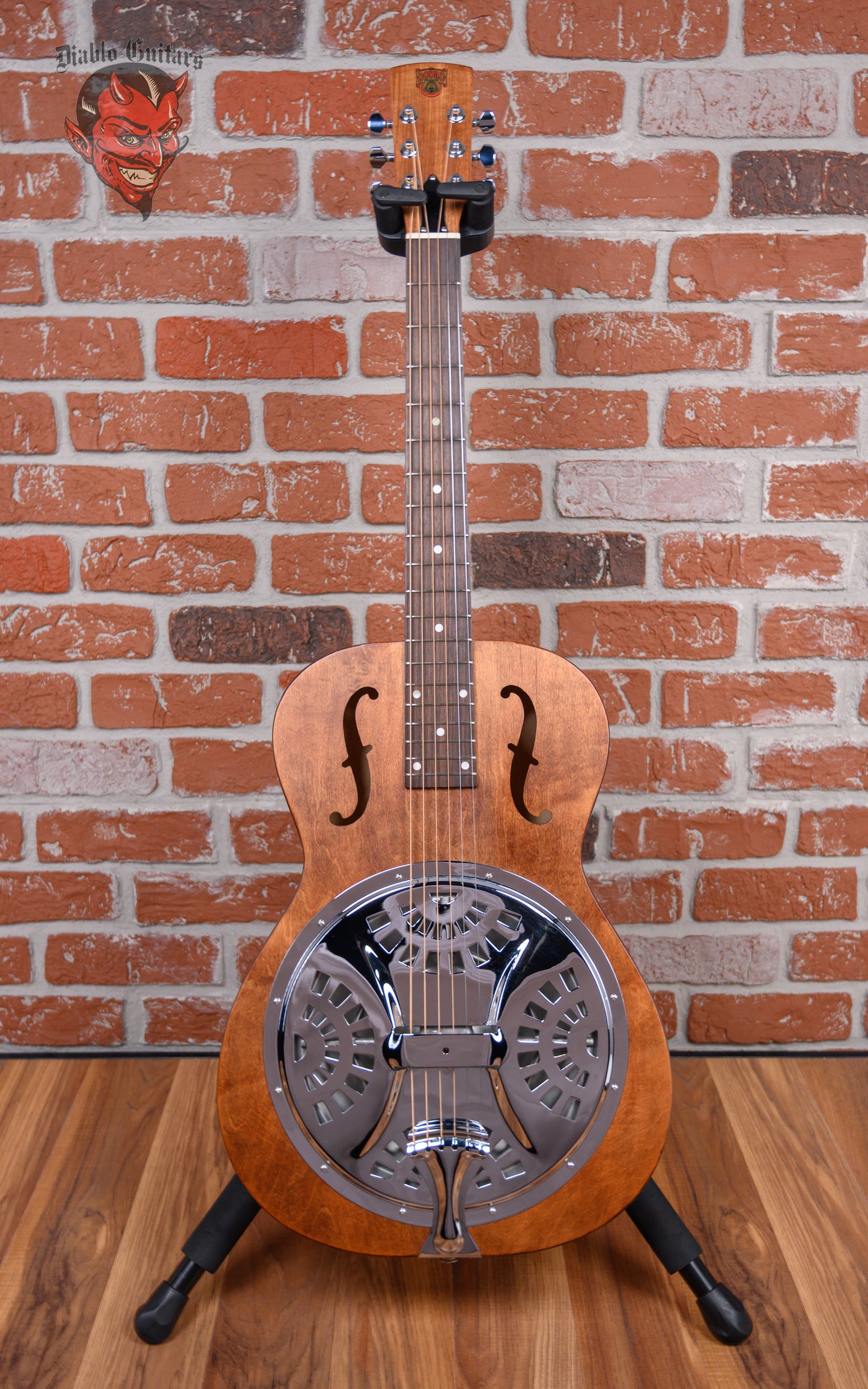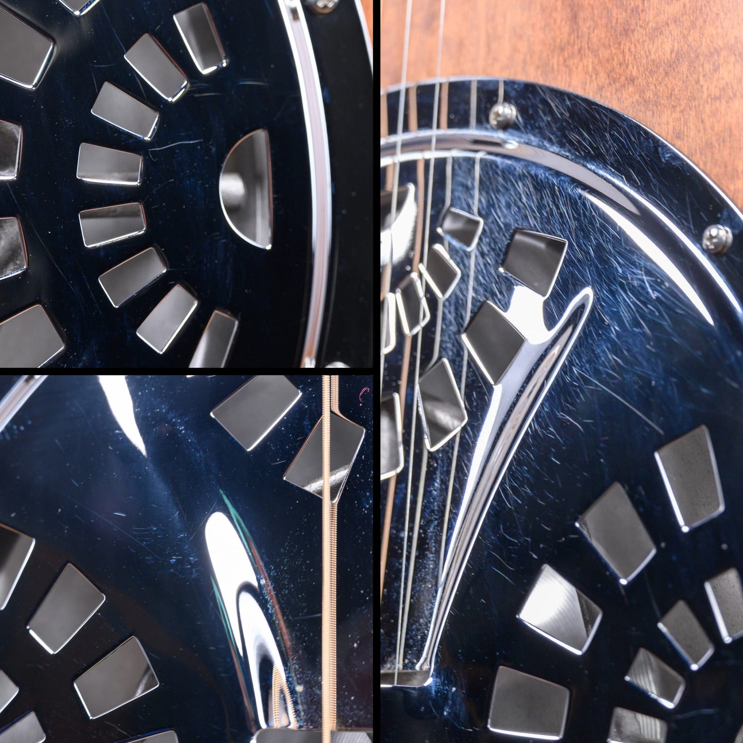 This guitar is in overall excellent condition. Some of the tuning machines show a bit of wear and pitting in the finish. There are some light dents/scuffs on the corners of the body. The back of the body has some dull/lighter finish areas on the upper bout. The resonator has some light surface marks on it and shows picking marks. There is a small divot on the fretboard at the 12th fret. The headstock has a small ding on the tip and there is some wear on the truss rod cover. (See pics)