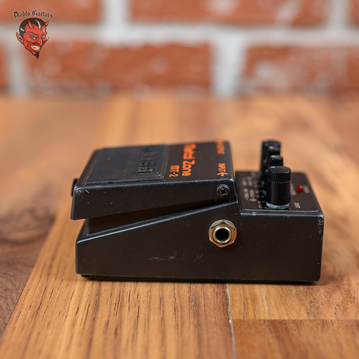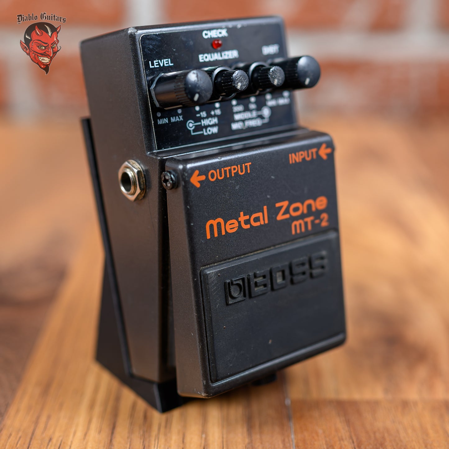 The Boss MT-2 Metal Zone is a distortion pedal specifically crafted for metal guitarists and hard rock enthusiasts. Engineered with dual gain circuits, this pedal is capable of delivering a tidal wave of high-gain distortion, from seething sustain to earth-shattering saturation that caters to the most demanding guitarists.