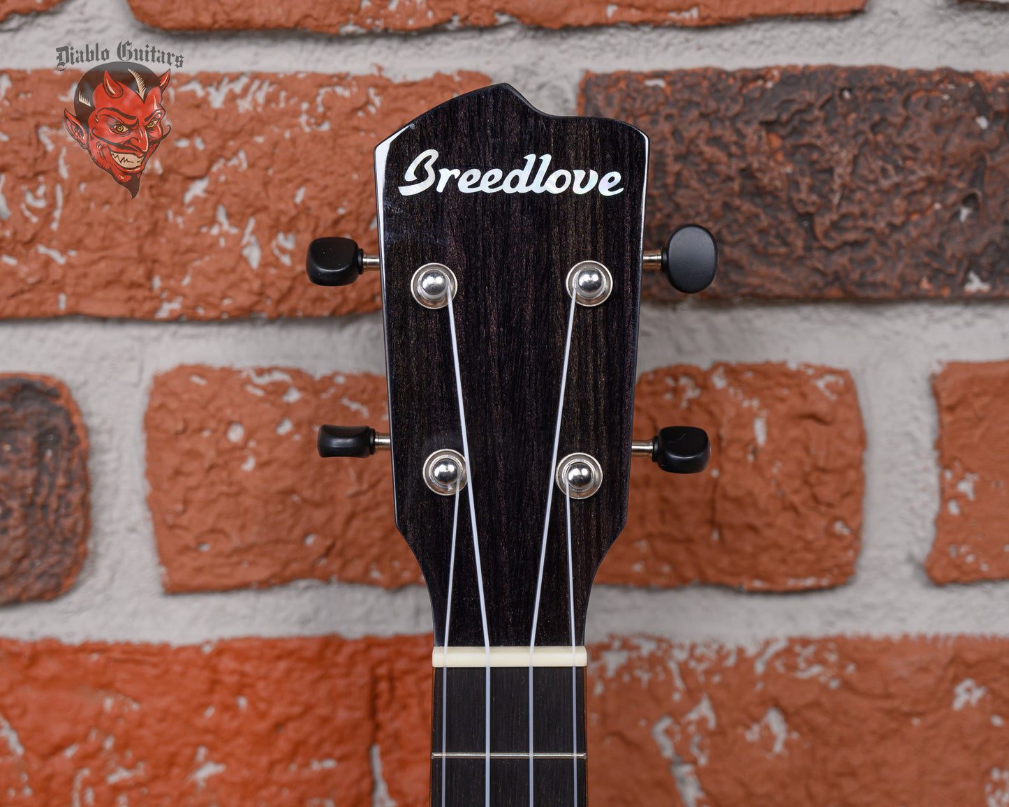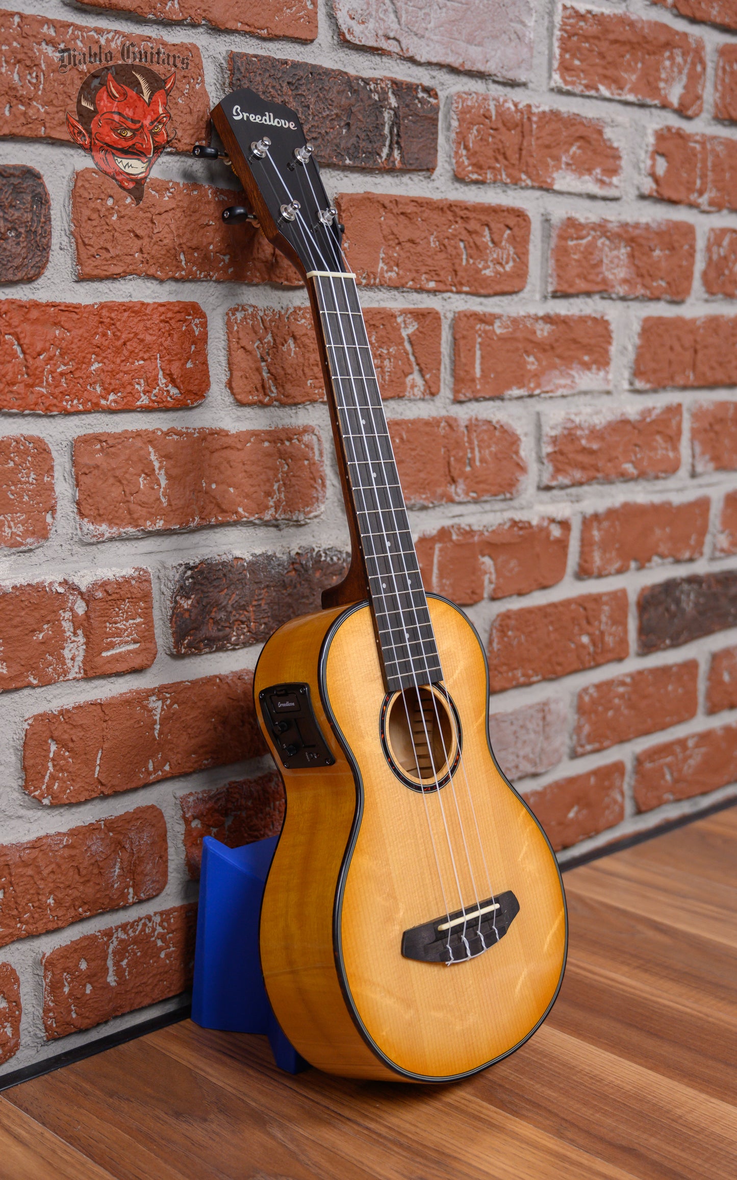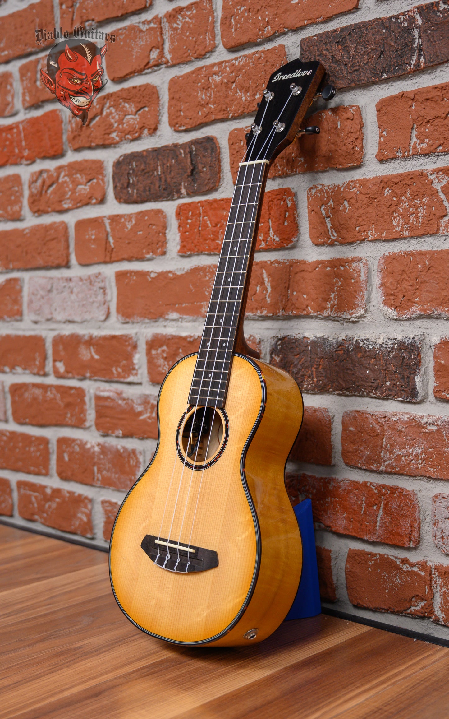 Breedlove Luau CU E SM NS in Natural Shadow finish made in 2018 with Gigbag. This ukulele features a double bound Myrtlewood back & sides body with a Sitka spruce top, mahogany neck and ovangkol fingerboard. Equipped with a Breedlove UK-T1 undersaddle piezo pickup. Controlled by 1 volume pot and 1 tone pot. The 15" scale length neck has white dot inlays and white side markers with 17 narrow low frets on a flat radius with a rounded profile. The hardware is comprised of nickel open gear tuning machines with oval heads, a bone nut and a rosewood base bridge w/ synthetic bone saddle.