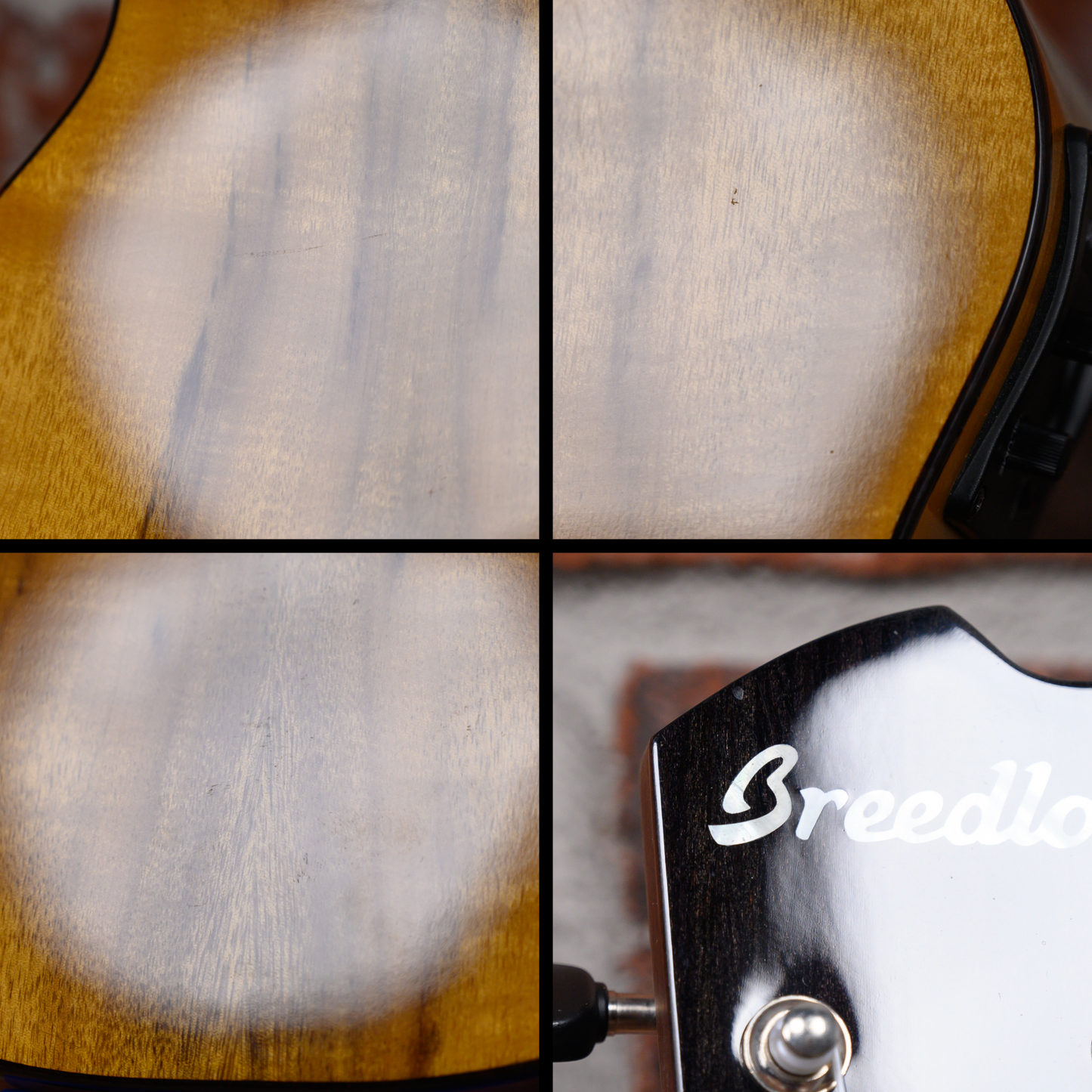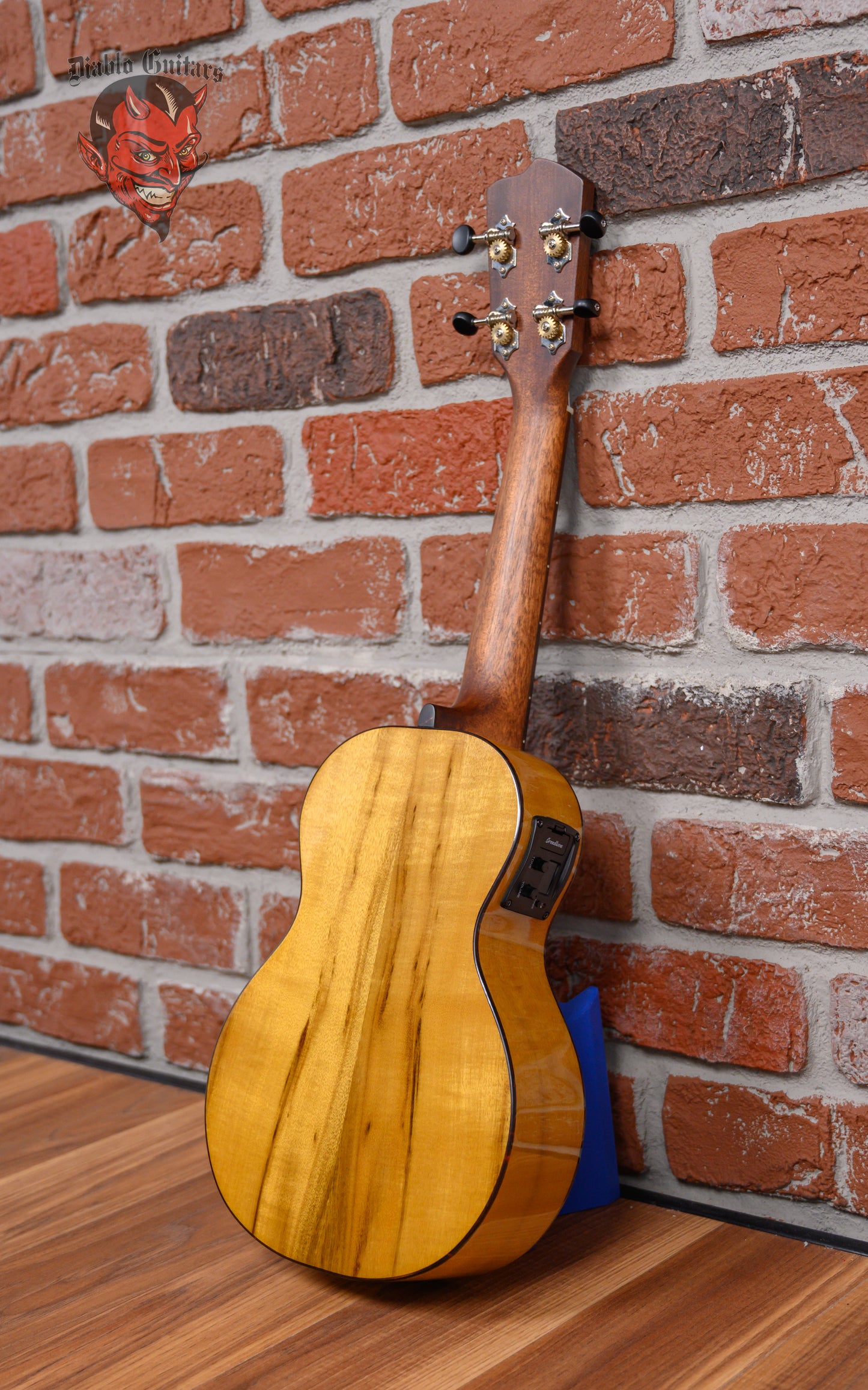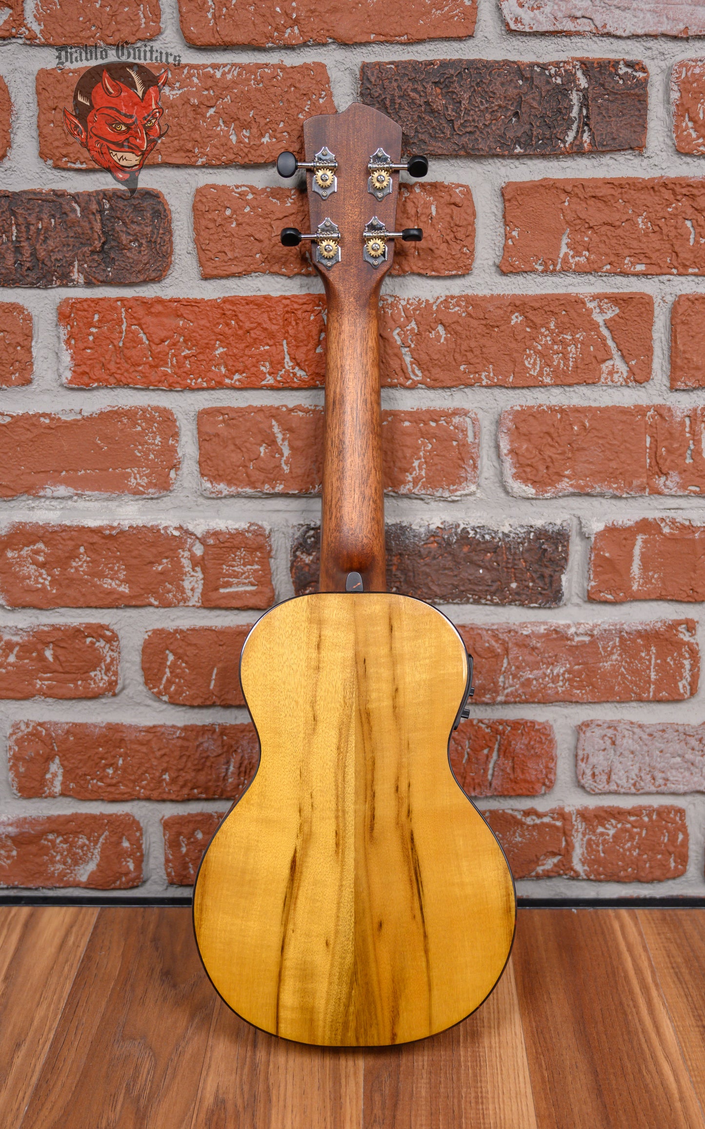 Breedlove Luau CU E SM NS in Natural Shadow finish made in 2018 with Gigbag. This ukulele features a double bound Myrtlewood back & sides body with a Sitka spruce top, mahogany neck and ovangkol fingerboard. Equipped with a Breedlove UK-T1 undersaddle piezo pickup. Controlled by 1 volume pot and 1 tone pot. The 15" scale length neck has white dot inlays and white side markers with 17 narrow low frets on a flat radius with a rounded profile. The hardware is comprised of nickel open gear tuning machines with oval heads, a bone nut and a rosewood base bridge w/ synthetic bone saddle.