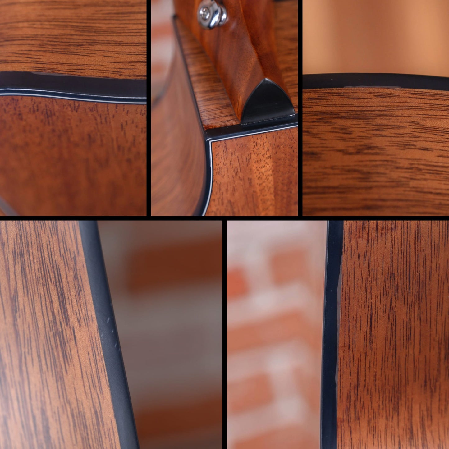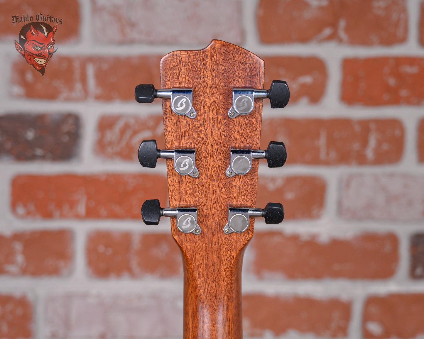 This guitar is in overall excellent condition. The headstock has some light surface marks and the tuners show some wear. The body binding has some small bubbles in it and there are areas of lighter finish on the sides. The top has some light marks near the sound hole. (See pics)