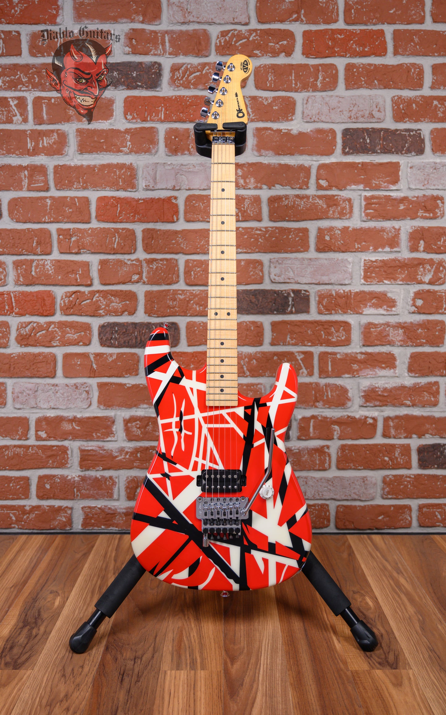Charvel EVH Art Series in Red w/ White and Black Stripes finish made in 2006 with Hard Shell Case. This guitar features a solid basswood body, quartersawn maple neck and maple fingerboard. Equipped with an EVH Custom Wound Humbucking pickup in the bridge position, controlled by one master volume pot (labeled ‘Tone'). The 25.5" scale length neck has black dot inlays and black side markers with 22 jumbo frets on a compound 12"-16" radius with a speed profile. The hardware is comprised of chrome Schaller sealed die-cast tuning machines with cloche heads, a Floyd Rose Locking nut, a surface-mounted Floyd Rose Original Double Locking Tremolo bridge with D-Tuna and one white top hat knob.