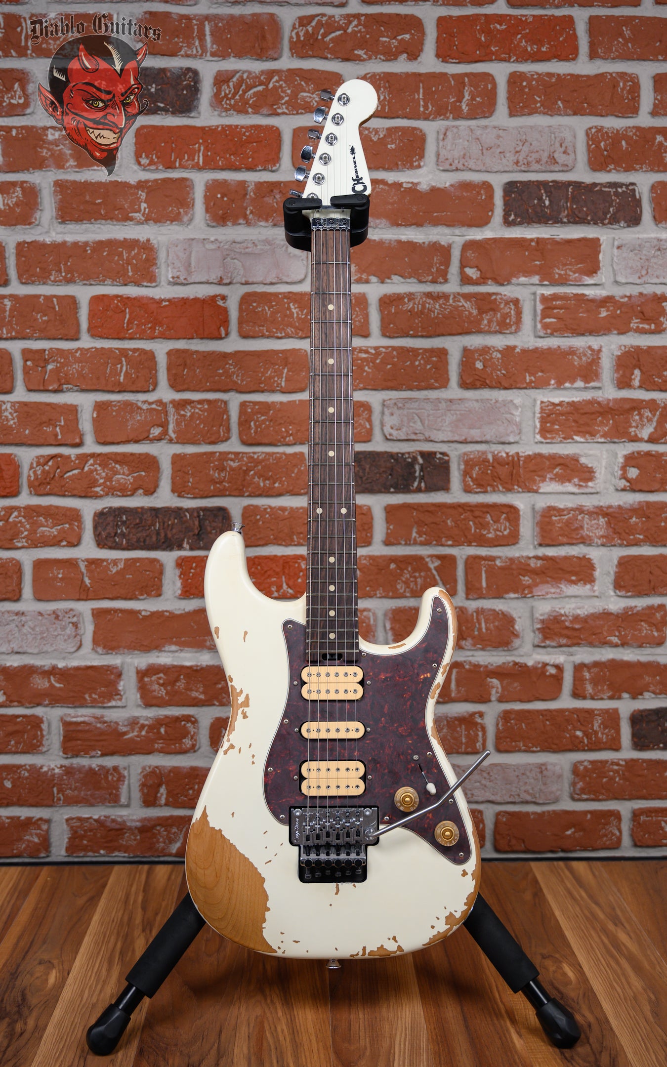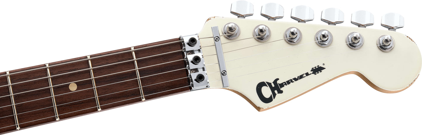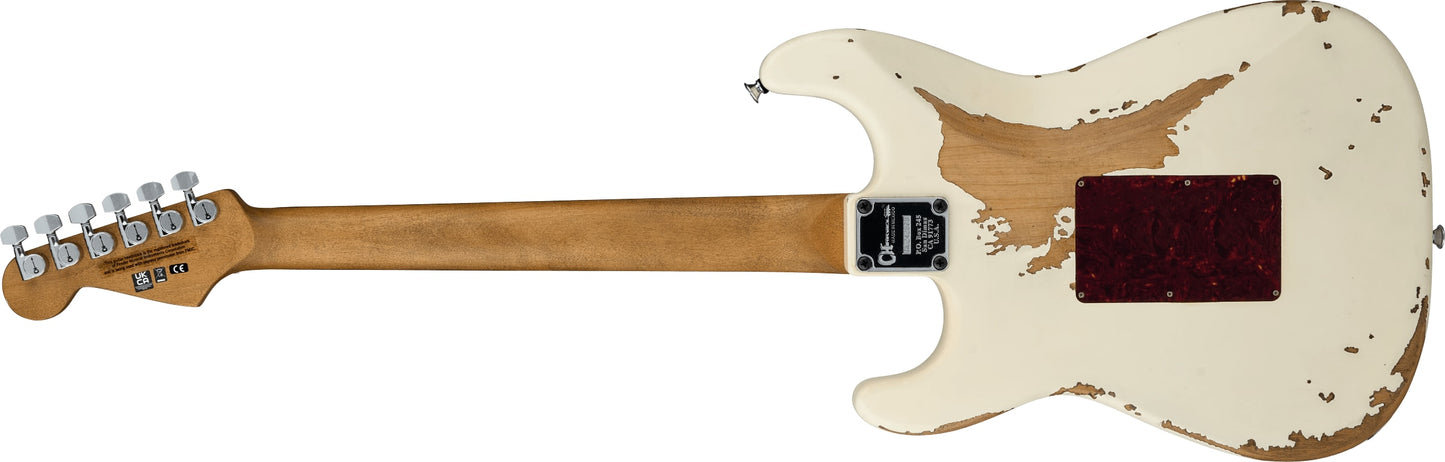 New Charvel Super-Stock So Cal Style 1 HSH FR RW in Aged Arctic finish made in 2025 with Original Foam Core Case. This guitar features a solid alder body, maple neck and rosewood fingerboard with color matched headstock. Equipped with aged cream bobbin dimarzio pickups, A DP151 PAF pro in the neck position, a dark matter 2 single coil in the middle position, and a DP100 super distortion in the bridge position. Controlled by 1 volume, 1 tone pot and a 5-Way blade switch. The 25.5" scale length neck has aged white dot inlays, white side markers with 22 jumbo frets on a compound 12"-16" radius with a speed neck profile. The hardware is comprised of chrome Charvel sealed diecast tuning machines with cloche heads, a Floyd Rose locking nut, a Floyd Rose 1000 series double locking tremolo and gold speed knobs with an aged 3-ply tortoise pickguard.