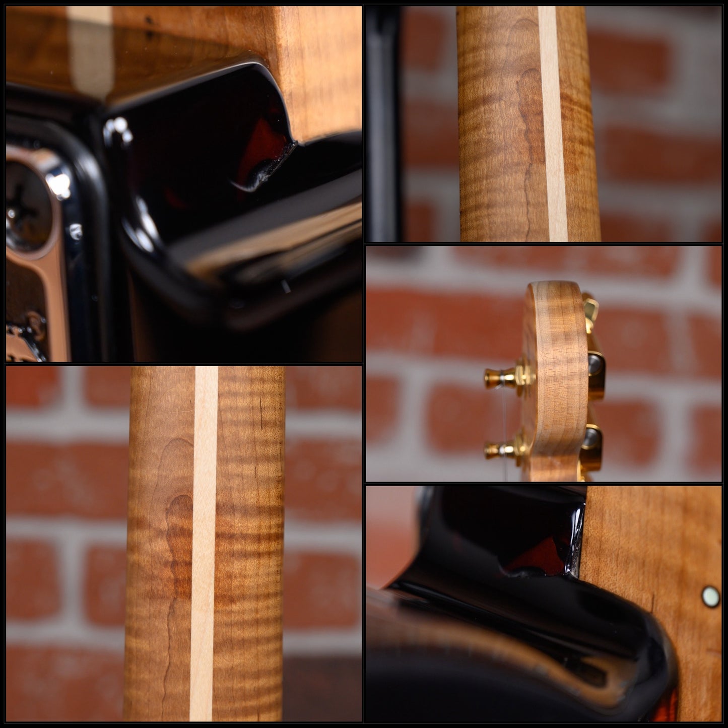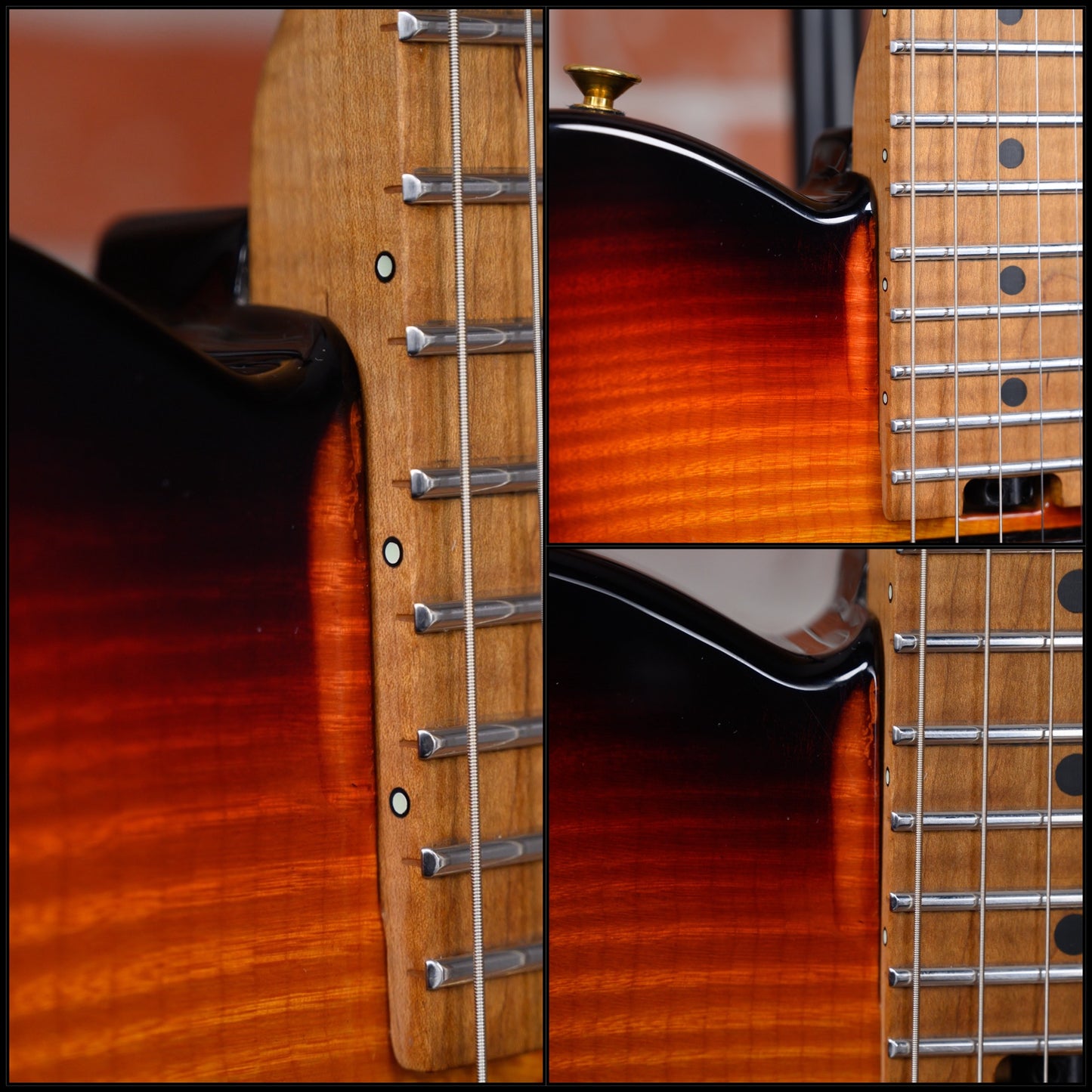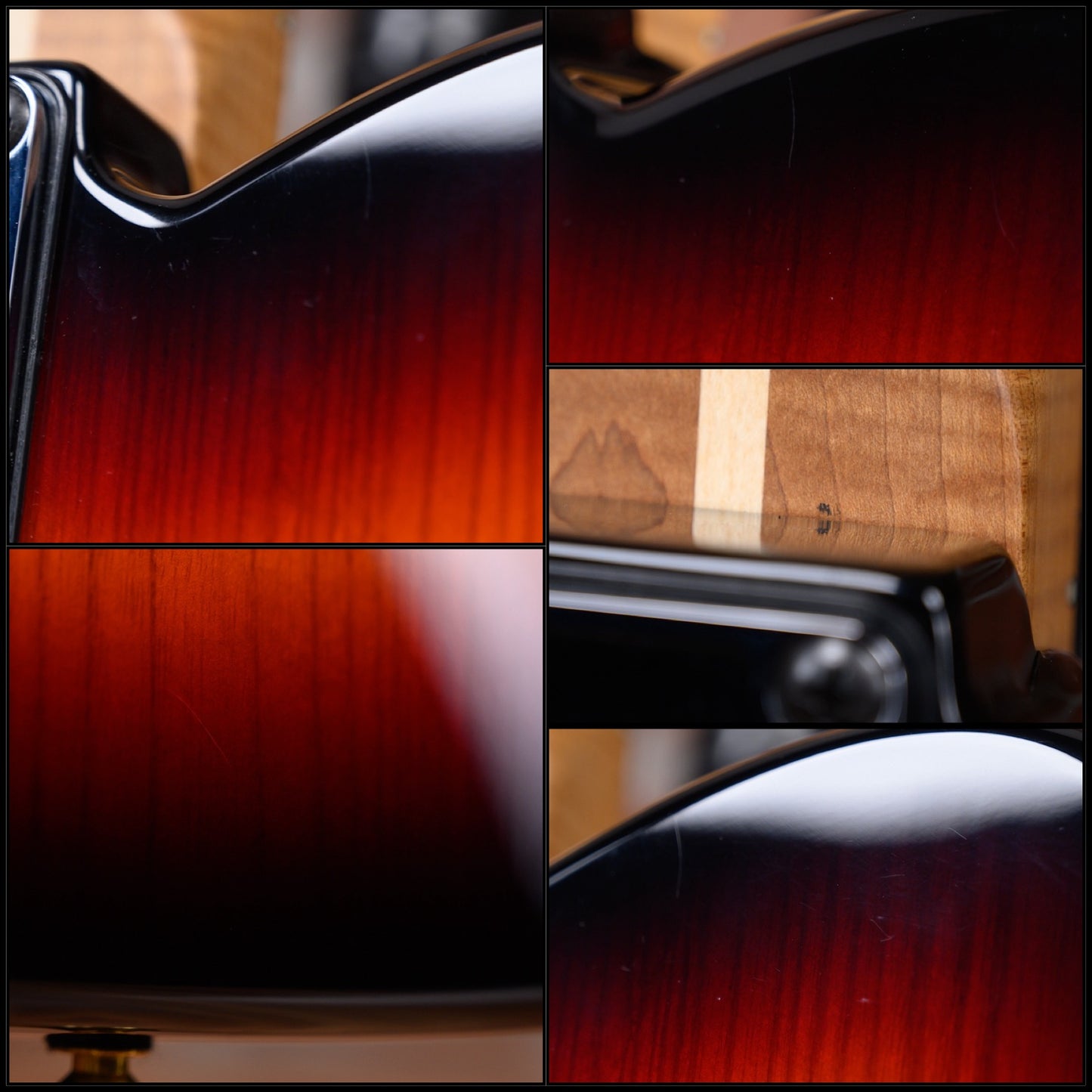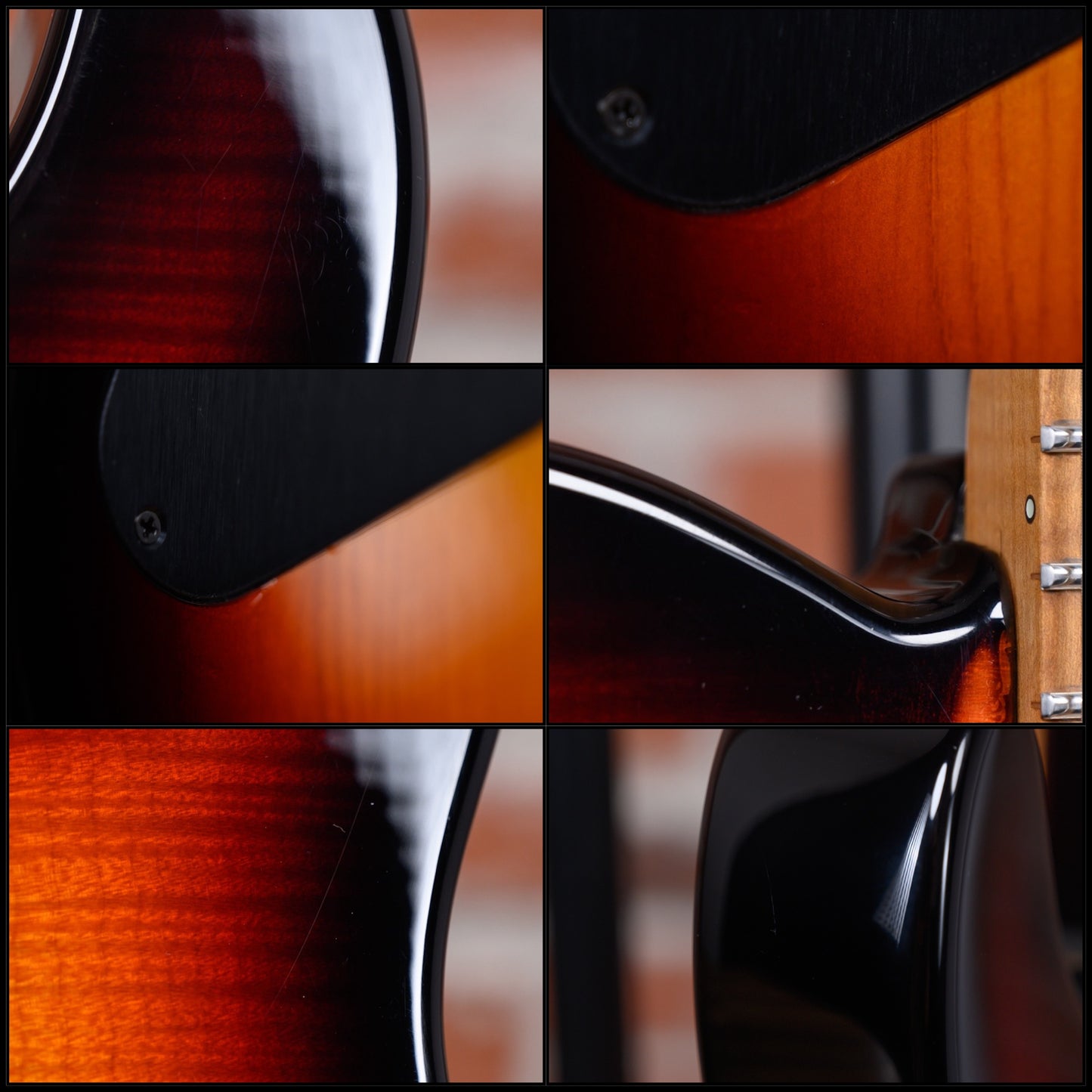 This guitar is in overall very good condition with some light signs of play. It has a few light surface marks /surface scratches on the body. The roasted neck has some spots that are slightly darker and lighter. There was a finish lift/ delamination spot at the neck pocket edge Which was professionally sealed by one of our luthiers, you can see the burst is faded away in that section, there is a neck pocket split on same side At the corners edge. (See pics)