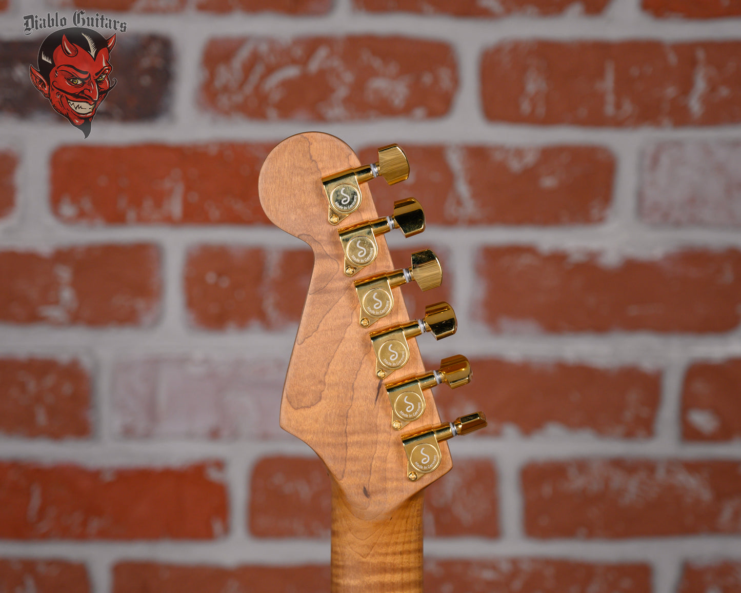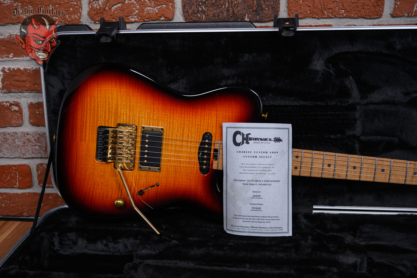 Charvel Custom Shop Select CCS ST2 HS FR Flame Maple Top in 3-Tone Sunburst finish made in 2022 with Original Hard Shell Case. This guitar features a solid alder body with a flamed maple top, caramelized flame maple neck and fingerboard. Equipped with a DiMarzio DP175 True Velvet Single Coil in the neck position and a DiMarzio DP261 PAF Master Humbucker in the bridge position. Controlled by one master volume knob and a 3-way blade switch. The 25.5" scale length neck has black dot inlays, luminlay side markers and 22 jumbo stainless frets on a 12"-16" compound radius with a speed neck profile. The hardware is comprised of matching gold Schaller sealed diecast tuning machines, a Floyd Rose locking nut, a Floyd Rose original double locking tremolo bridge and a knurled brass dome knob