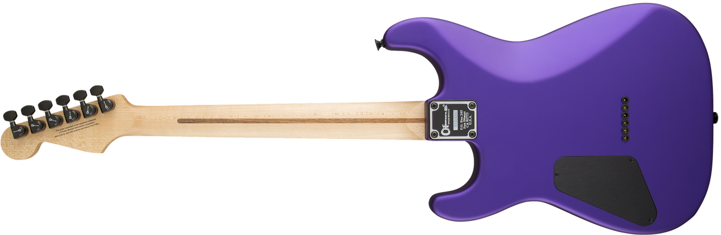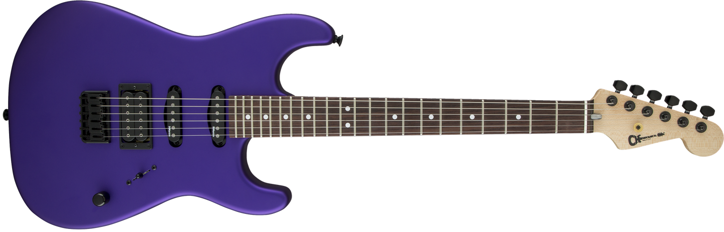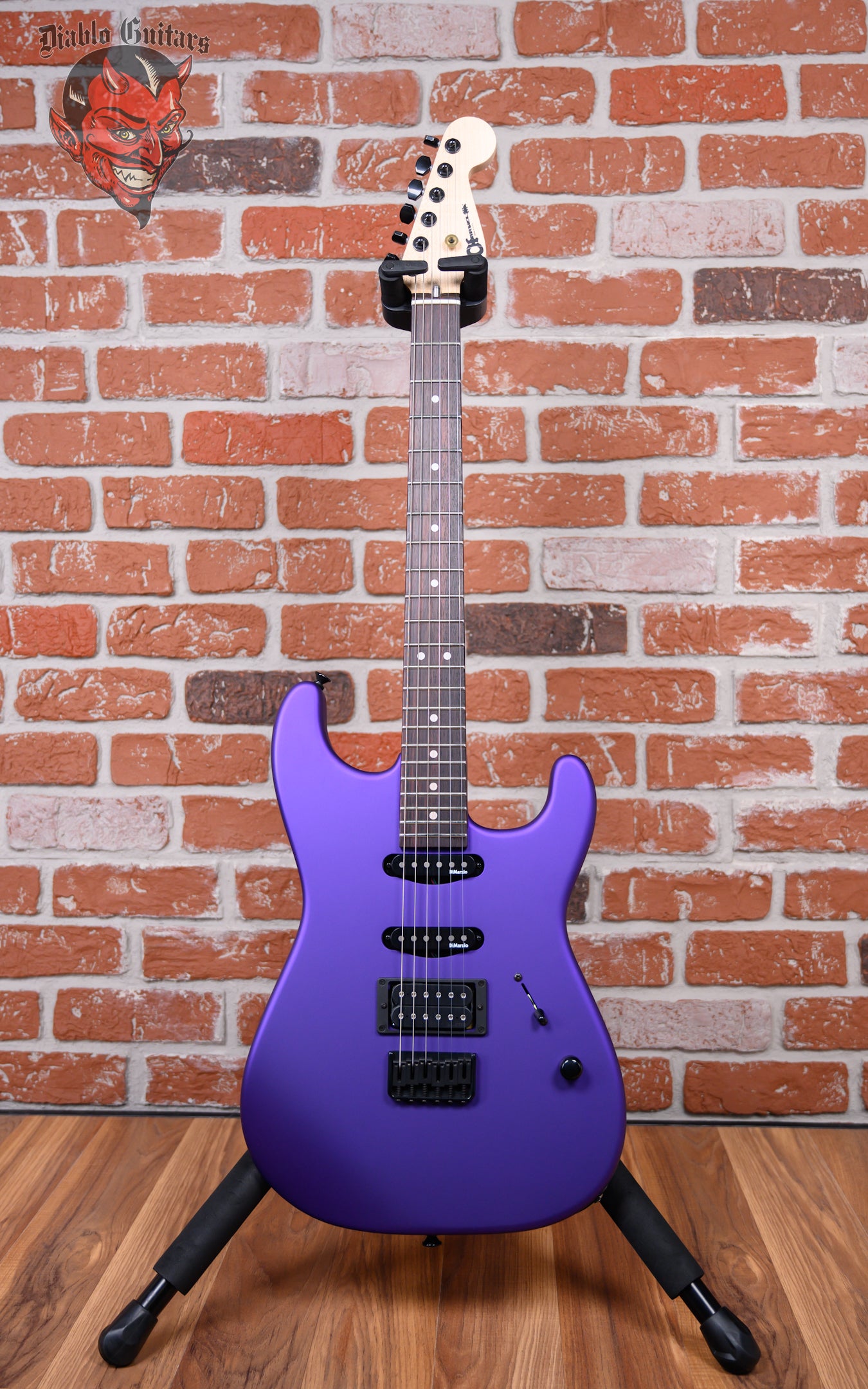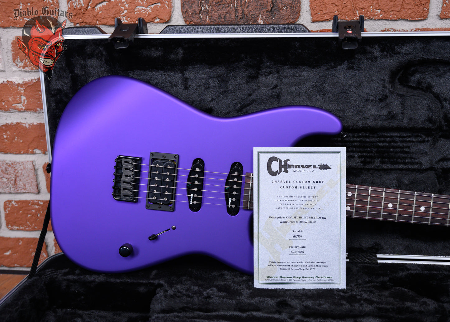 Regular price $2,159.99New Charvel USA Custom Shop Select San Dimas Style 1 HSS HT in Satin Plum finish made in 2024 with Original Hard Shell Case (B-stock). This guitar features a solid alder body, quartersawn maple neck and rosewood fingerboard with a Licensed Fender Stratocaster headstock. Equipped with a DiMarzio HS-2 DP116 in the neck and middle positions and a DiMarzio Super Distortion DP100 in the bridge position. Controlled by one master volume pot and a 5-way blade switch. The 25.5" scale length neck has white dot inlays and white side markers with 22 jumbo frets on a compound 12"-16" radius with a speed profile. The hardware is comprised of black Charvel locking tuning machines with cloche heads, a bone nut, a Charvel hardtail bridge and one black knurled dome knob.