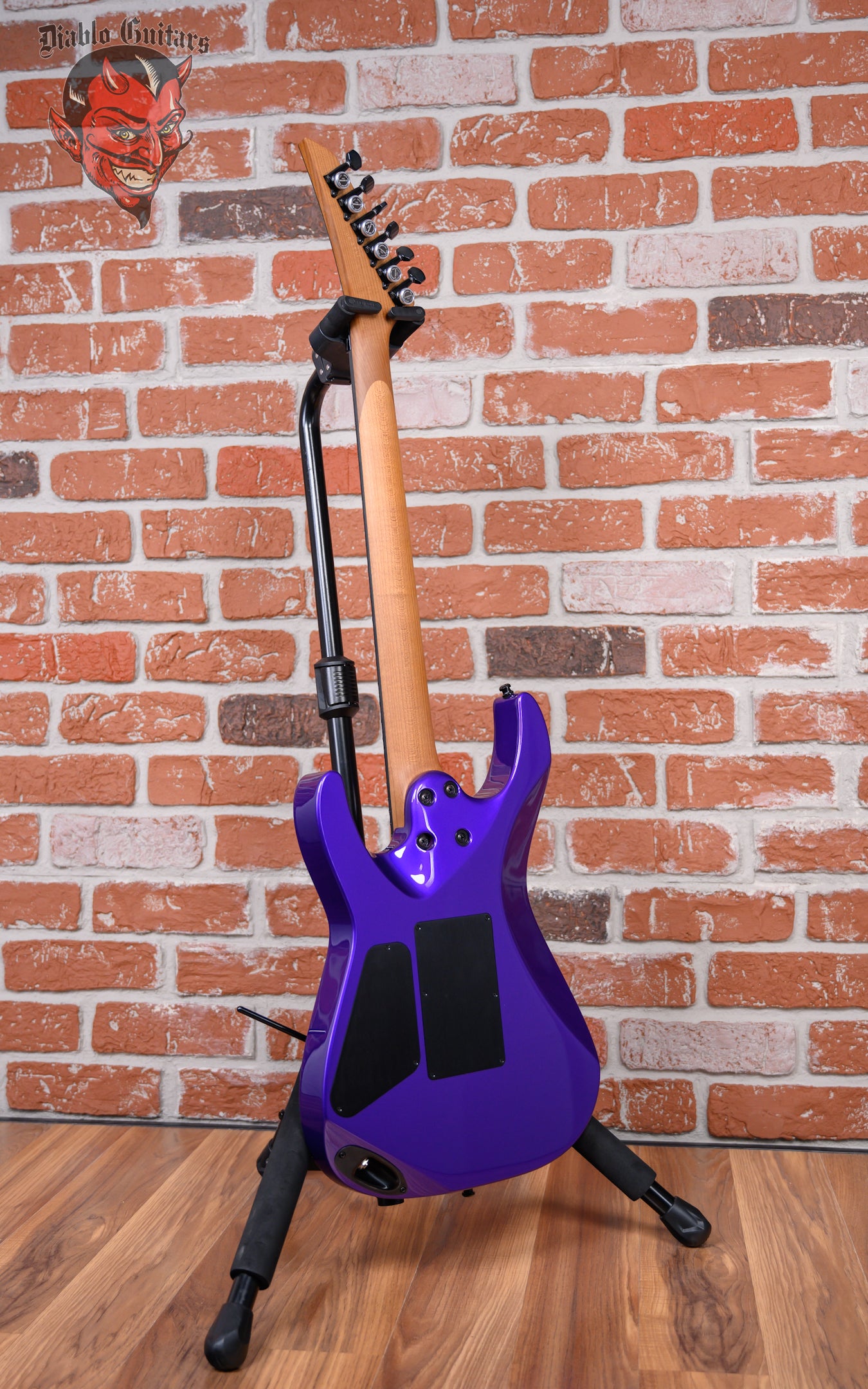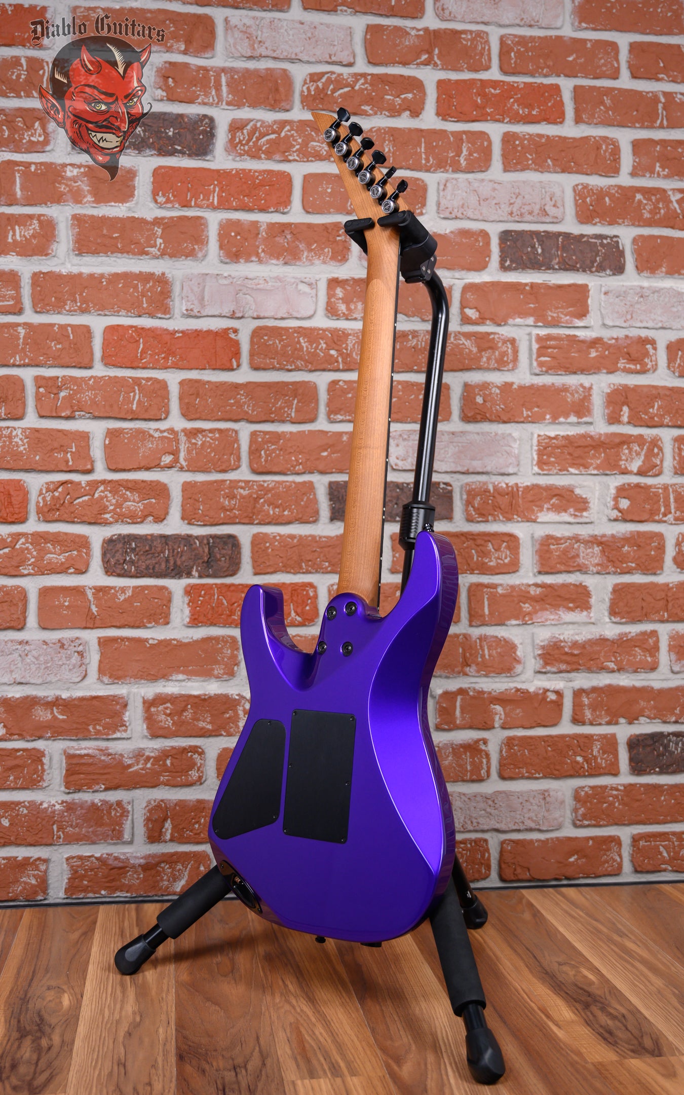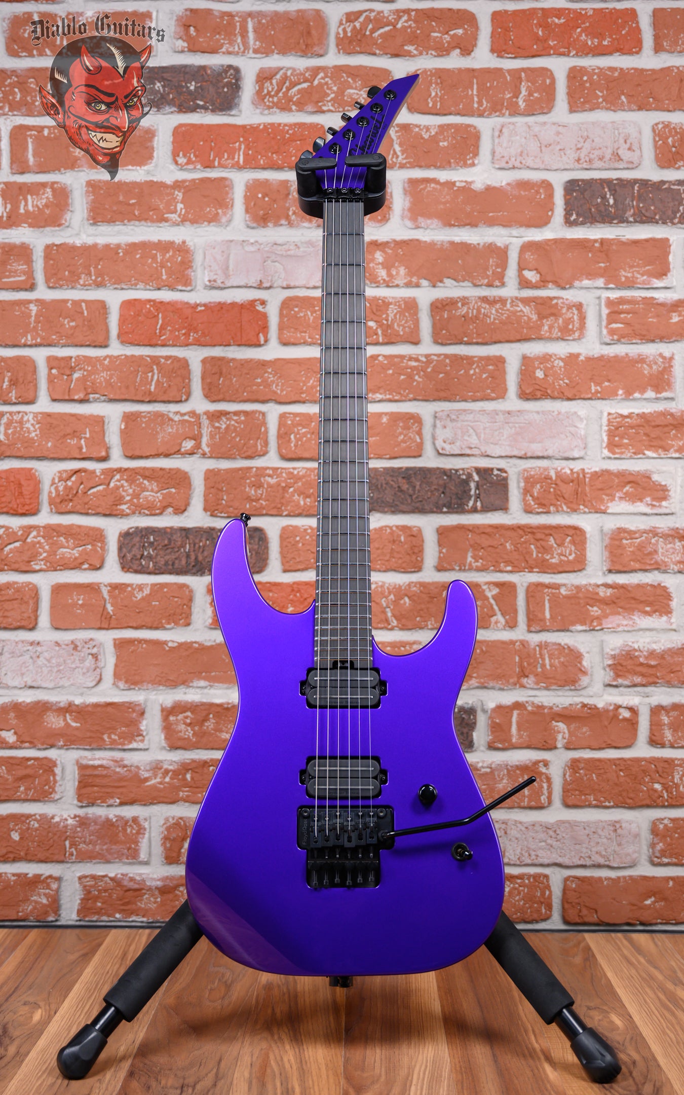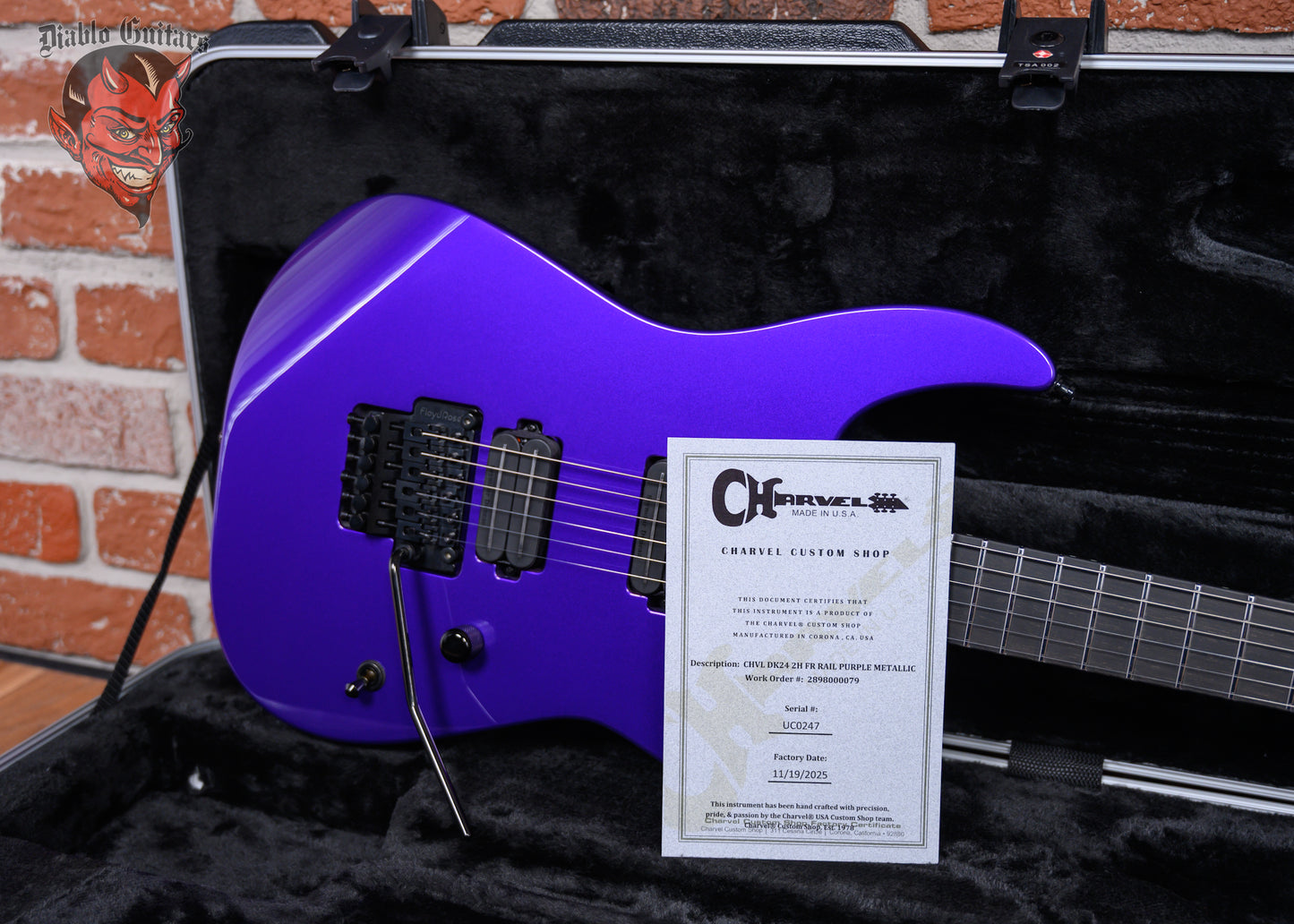 New Charvel USA Custom Shop Special Edition DK24 in Purple Metallic finish made in 2025. This guitar features a solid premium alder body, caramelized quartersawn maple neck and ebony fingerboard with a bound, color matched headstock with toothpaste logo. Equipped with a Seymour Duncan Jazz Rails in the neck position and a Seymour Duncan JB Rails in the bridge position. Controlled by one master volume pot and a 3-Way toggle switch. The 25.5" scale length neck has no inlays, luminlay blue side markers with 24 jumbo stainless steel frets on a compound 12"-16" radius with a speed profile. The hardware is comprised of black Gotoh Magnum Lock-Trad tuning machines with cloche heads, a Floyd Rose Locking nut, a Floyd Rose Original Double Locking Tremolo bridge with brass block and black knurled dome knob.