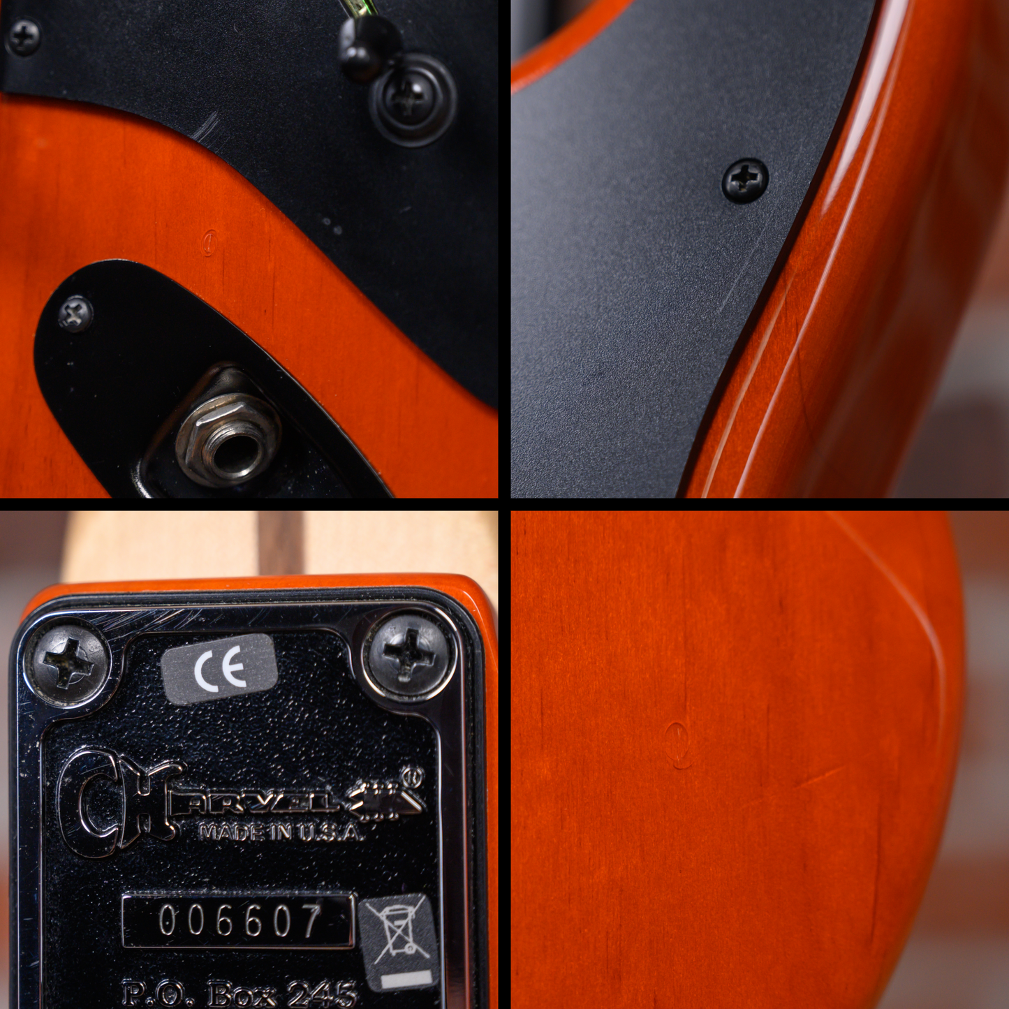 This guitar is in overall very good condition. There are some light surface marks and small dings in the finish throughout. The fingerboard is slightly discolored. There is a finish split in the neck pocket on the treble side. There are light marks on the plating of the tuners. (See pics)
