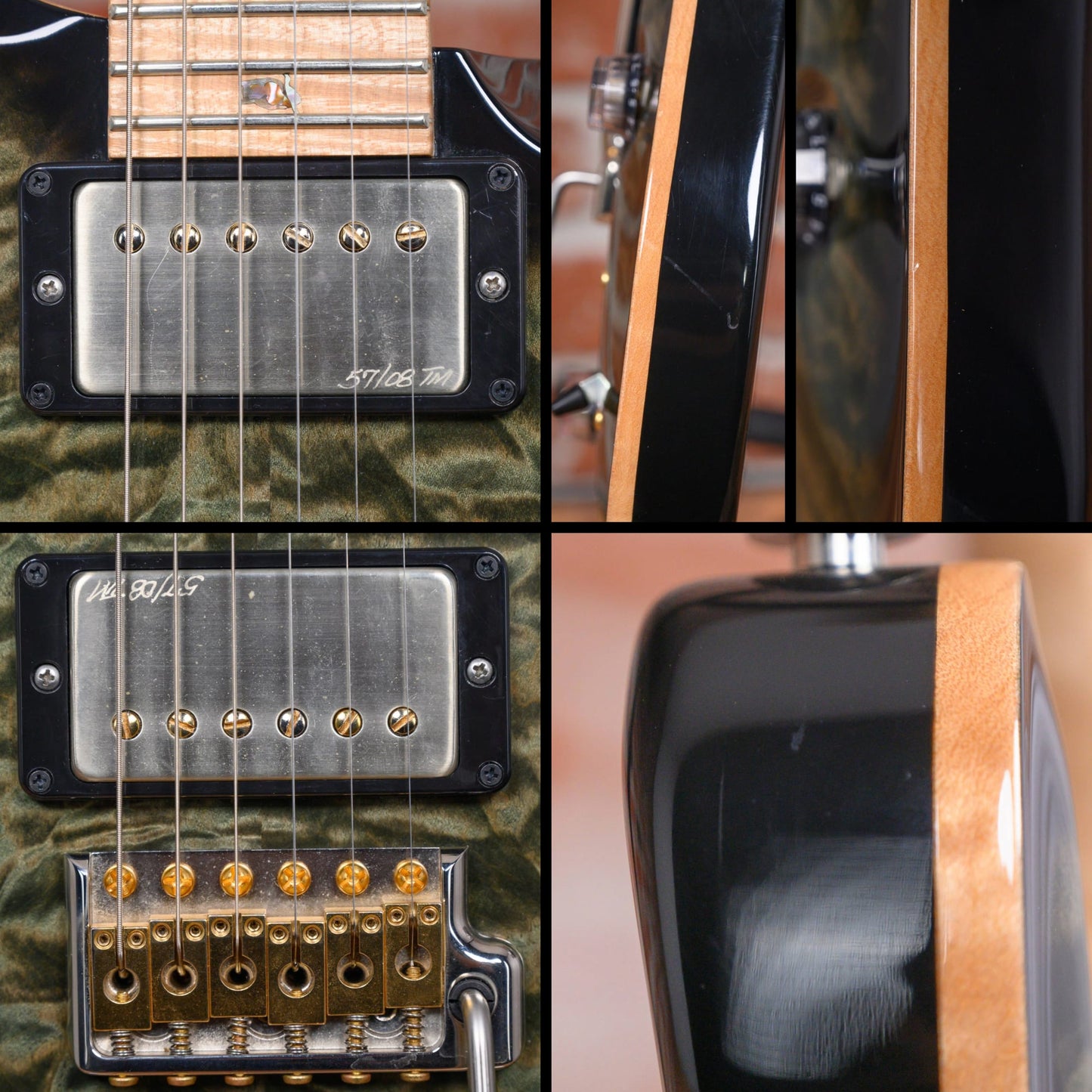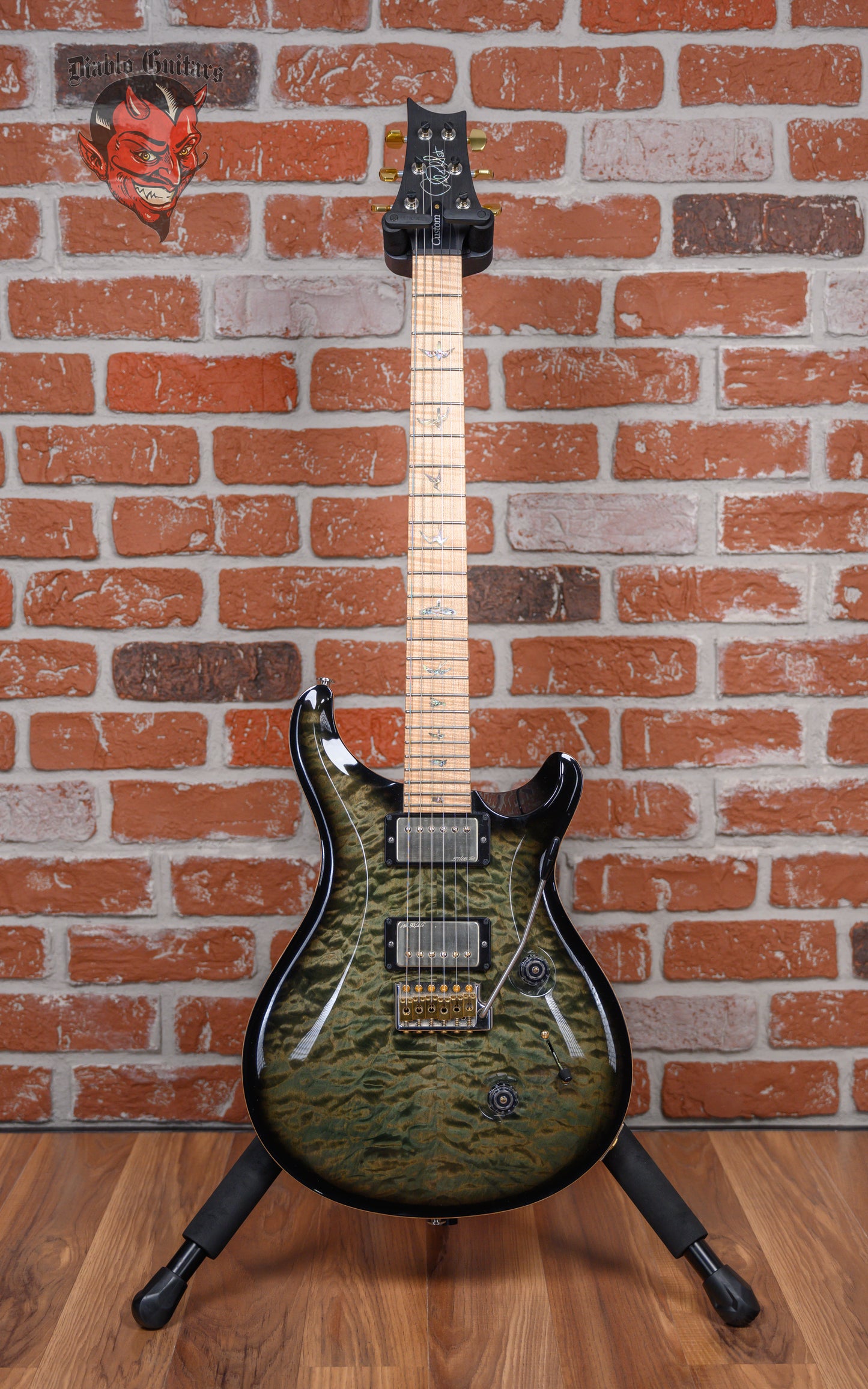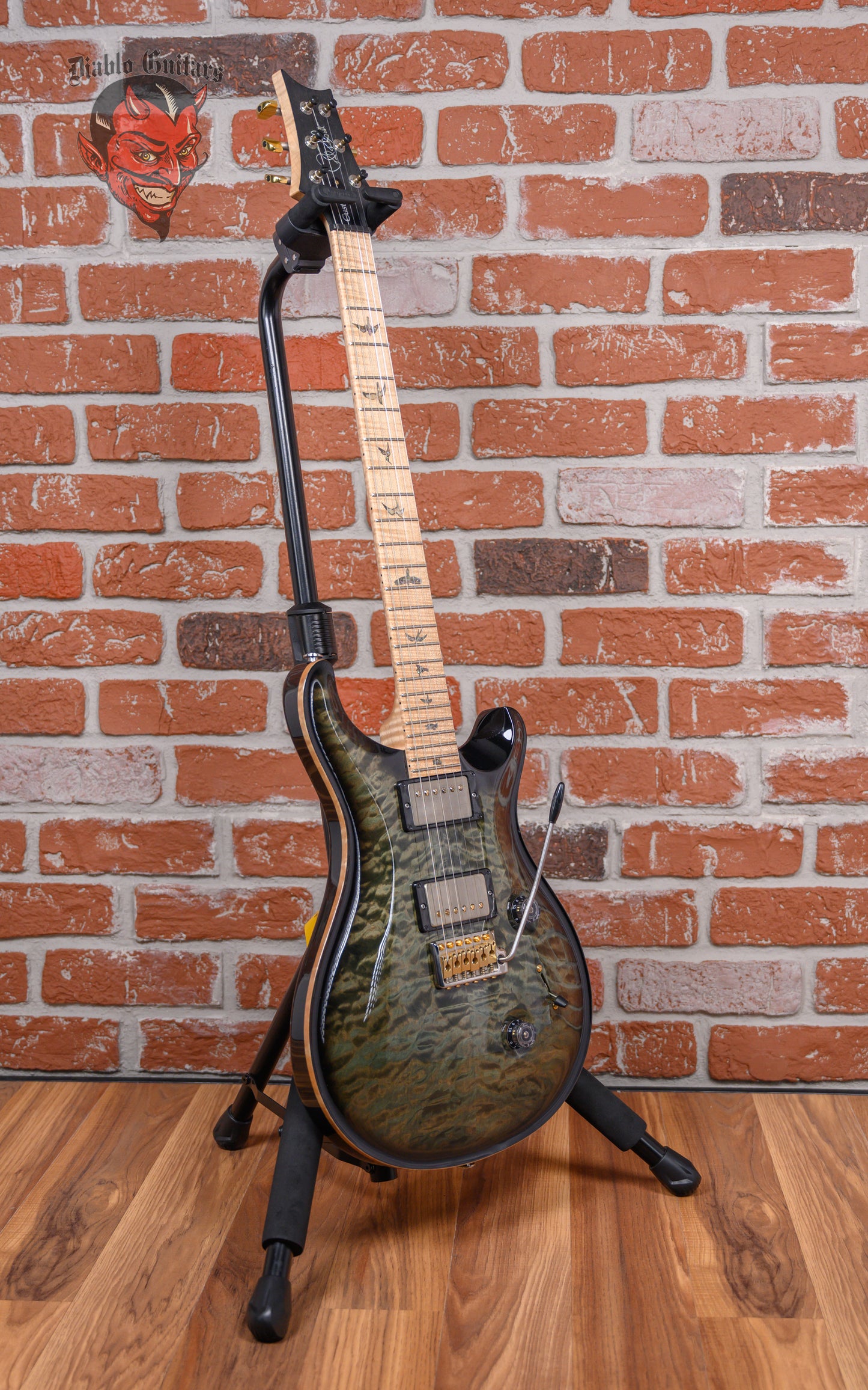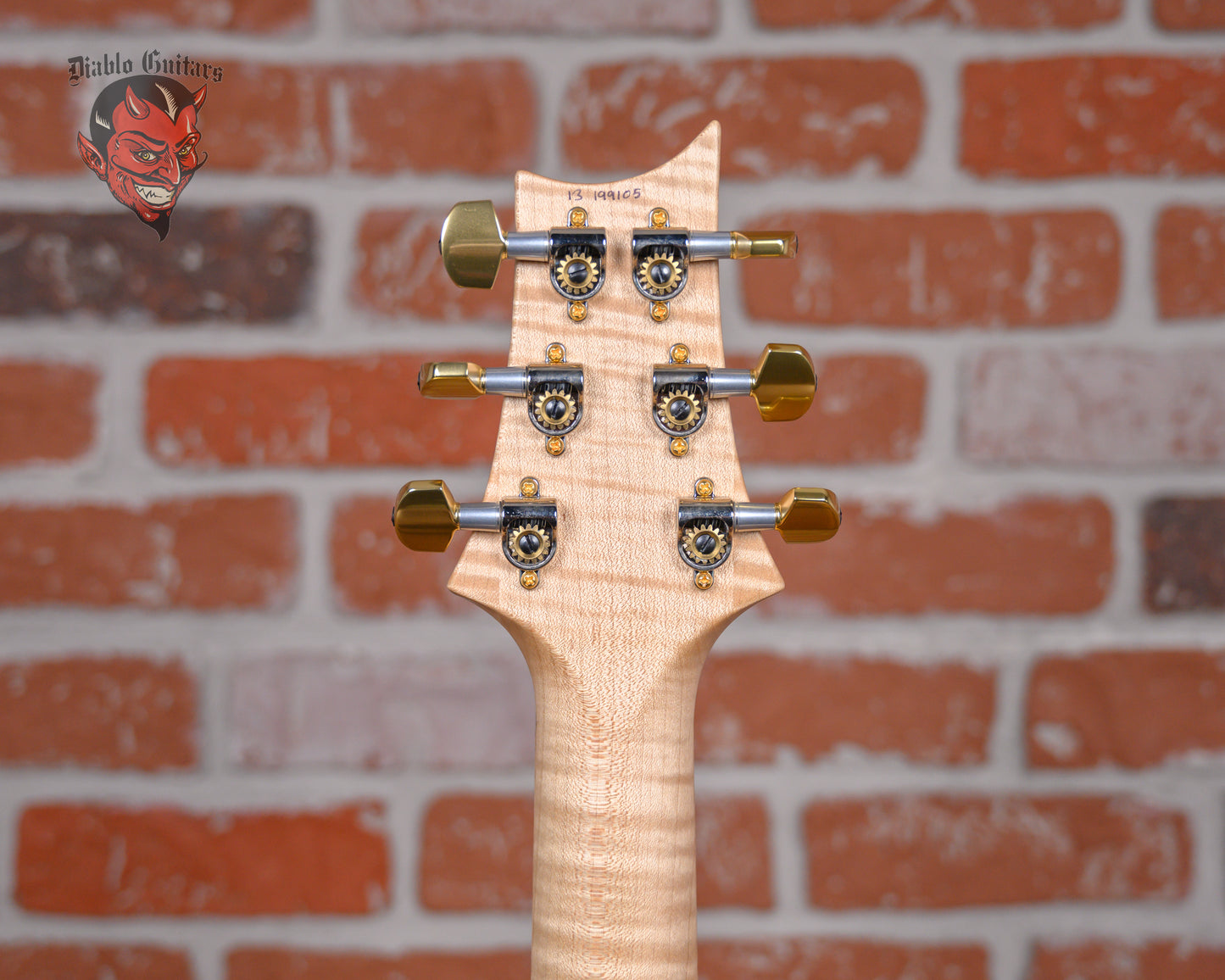 PRS Custom 24 Artist Package in Leprechaun Tooth finish made in 2013 with Original Hard Shell Case. This guitar features a solid mahogany body with a natural bound quilted maple top, flamed maple neck and flamed maple fingerboard with a rosewood overlay headstock. Equipped with a PRS 57/08 Bass in the neck position and a PRS 57/08 Treble in the bridge position. Controlled by 2 volume pots, 2 tone pots and a 5-way blade switch with coil tap on positions 2 & 4. The 25" scale length neck has abalone/mother of pearl outlined birds inlays and black side markers with 24 medium jumbo frets on a 10" radius with a PRS Pattern Thin profile. The hardware is comprised of nickel/gold PRS Phase III Locking tuning machines with cloche heads, a synthetic bone nut, a PRS Tremolo bridge and clear lamp shade knobs.