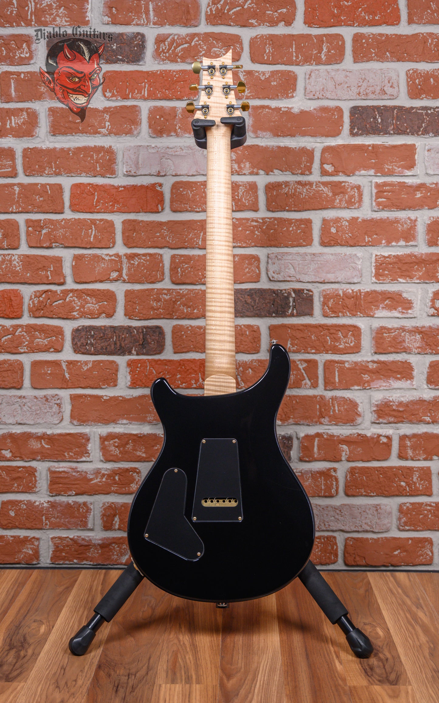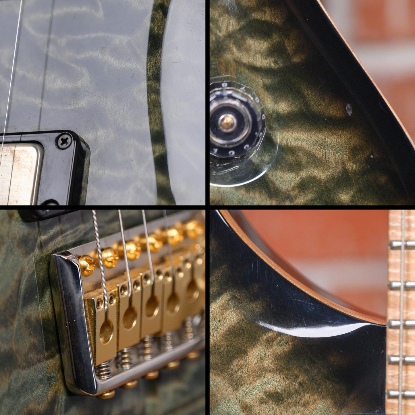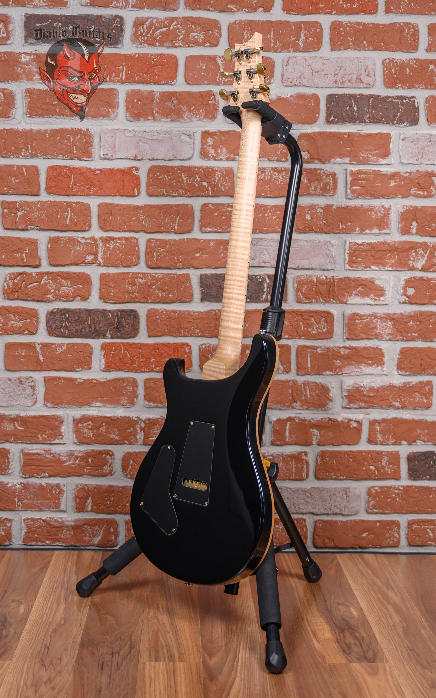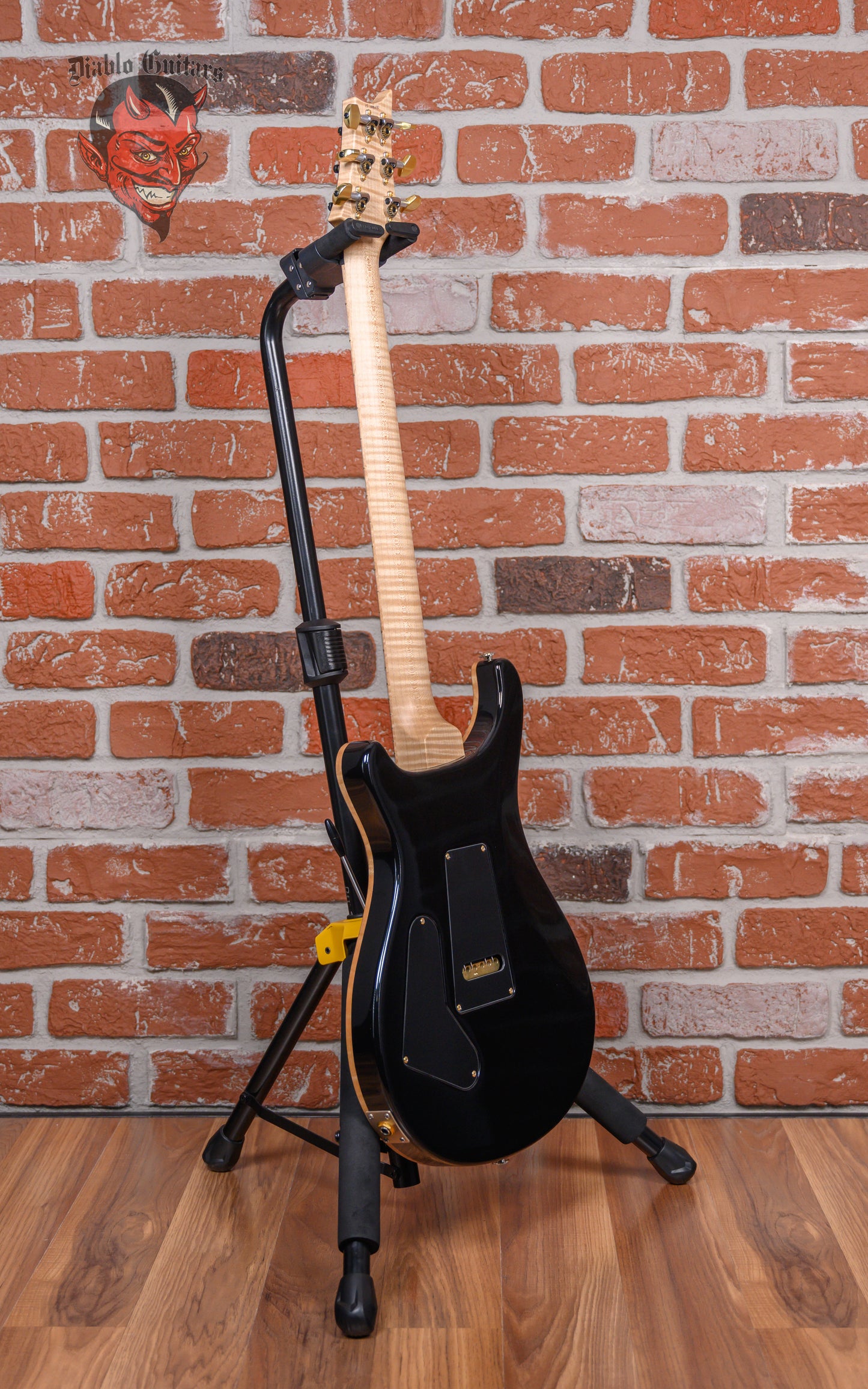 PRS Custom 24 Artist Package in Leprechaun Tooth finish made in 2013 with Original Hard Shell Case. This guitar features a solid mahogany body with a natural bound quilted maple top, flamed maple neck and flamed maple fingerboard with a rosewood overlay headstock. Equipped with a PRS 57/08 Bass in the neck position and a PRS 57/08 Treble in the bridge position. Controlled by 2 volume pots, 2 tone pots and a 5-way blade switch with coil tap on positions 2 & 4. The 25" scale length neck has abalone/mother of pearl outlined birds inlays and black side markers with 24 medium jumbo frets on a 10" radius with a PRS Pattern Thin profile. The hardware is comprised of nickel/gold PRS Phase III Locking tuning machines with cloche heads, a synthetic bone nut, a PRS Tremolo bridge and clear lamp shade knobs.