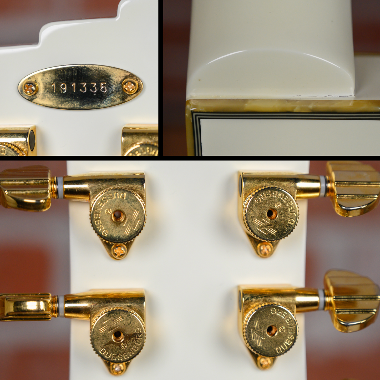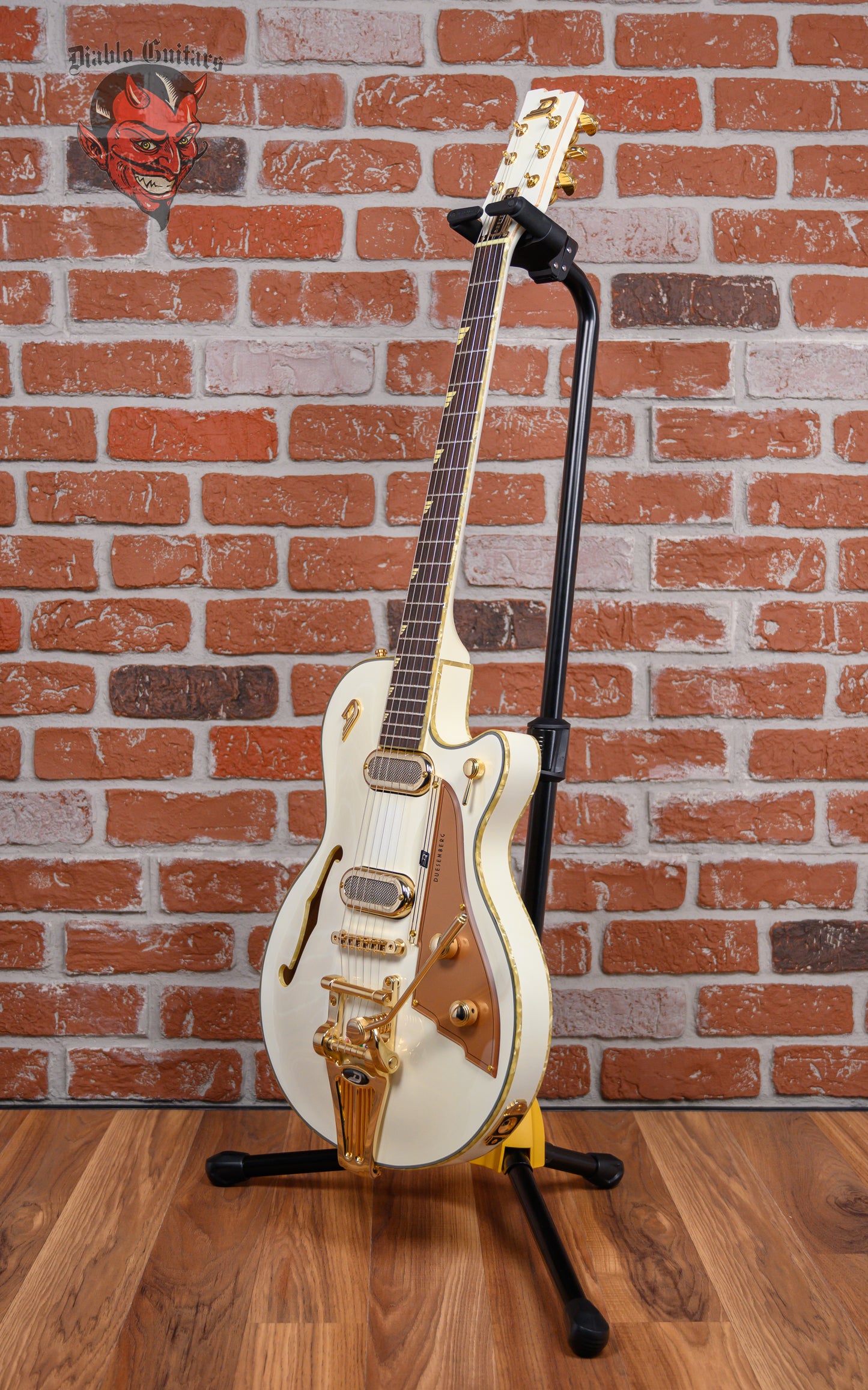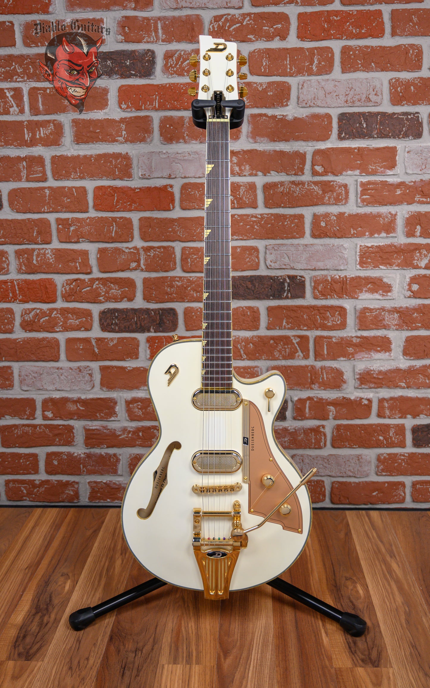 Duesenberg Starplayer TV Phonic in Venetian White finish made in 2019 with Original Hard Shell Case. This guitar features a double bound semi-hollow laminated maple back & sides body with an arched laminated spruce top, maple neck and bound Indian rosewood fingerboard with a natural bound/color matched headstock. Equipped with a Duesenberg "Phonico" P90 single coil in the neck position and a Duesenberg "Phonico" GrandVintage Humbucker in the bridge position. Controlled by 1 volume pot, 1 tone pot and a 4-Way rotary switch. The 25.5" scale length neck has cream Duesenberg Wing inlays and black side markers with 22 jumbo frets on a 305mm radius with a medium D profile. The hardware is comprised of gold Duesenberg Locking Z-Tuner tuning machines with stepped kidney heads, a synthetic nut, a Duesenberg Steel Saddle bridge w/ Duesenberg Radiator Tremola and gold knurled dome knobs with a custom gold pickguard.