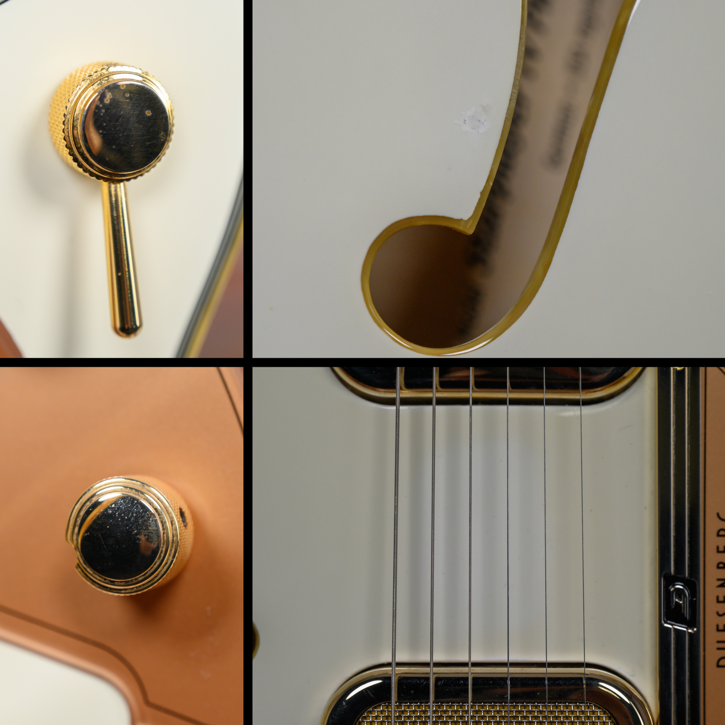 This guitar is in overall excellent condition. The hardware shows some plating wear on the tuners, knobs, and serial plate. There is a very small spot above the lower part of the f-hole that appears to be a touch up as it doesn't quite match the guitar color. The area between the pickups is a lighter shade than the rest of the body. (See Pics)