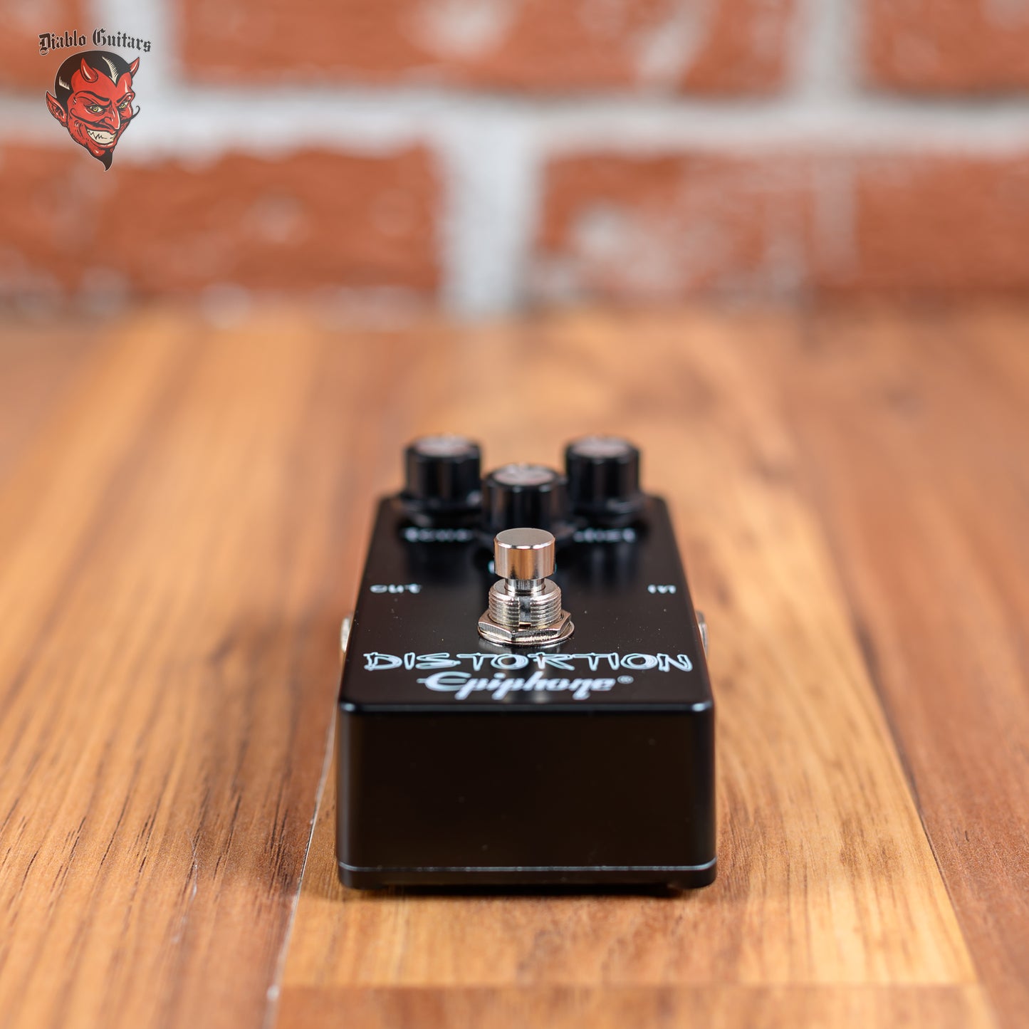Screaming distortion is yours thanks to this handy distortion pedal from Epiphone. Its compact size makes it perfect for any pedal board or in a tight spot where you don't have a lot of floor space. The effect pedal features tone, distortion, and level controls, along with a push button distortion on/off dial, to dial in your perfect blend of audio annihilation. Just tap the switch, turn the knobs, and you're there. The Epiphone distortion pedal has 2 LED lights that let you know the pedal is activated, even under dim lights and thick smoke. With chrome hardware and a rugged, all-metal black housing, this distortion pedal will last for years, able to stand up to whatever the gig throws at you.Features