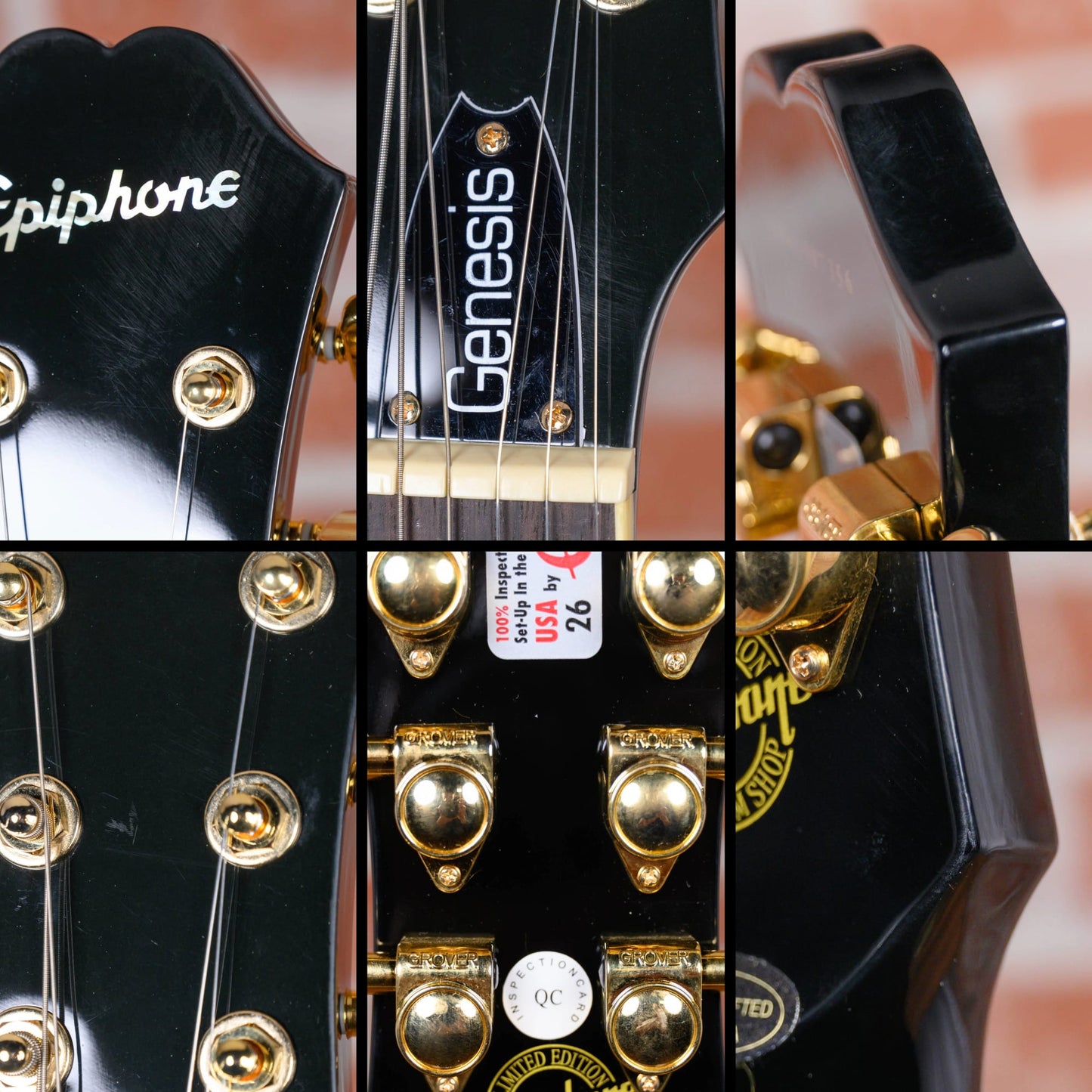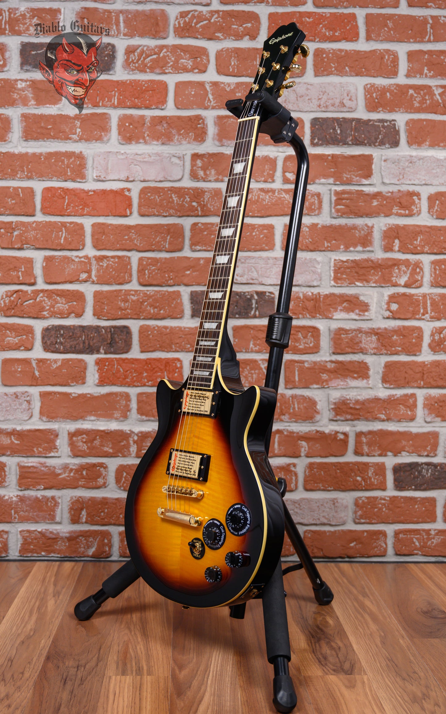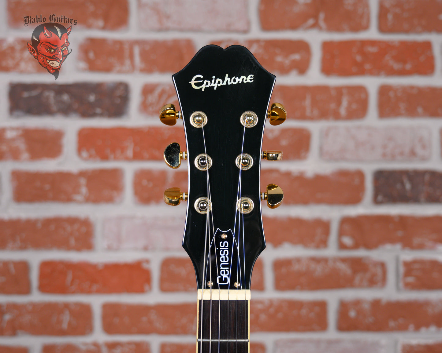 Epiphone Genesis Deluxe Pro in Vintage Sunburst finish made in 2013 with Original Hard Shell Case. This guitar features a solid mahogany body with a bound AAA flame maple top, mahogany neck and bound rosewood fingerboard. Equipped with an Epiphone ProBucker-2 in the neck position and an Epiphone ProBucker-3 in the bridge position. Controlled by 2 volume pots with push/pull coil tap, 2 tone pots and a 3-Way toggle switch. The 24.75" scale length neck has pearloid trapezoid inlays and black side markers with 22 medium jumbo frets on a 12" radius with a slim taper "D" profile. The hardware is comprised of gold Grover Rotomatic tuning machines with kidney heads, a plastic nut, a LockTone Tune-o-Matic bridge w/ stopbar tailpiece and black speed knobs.