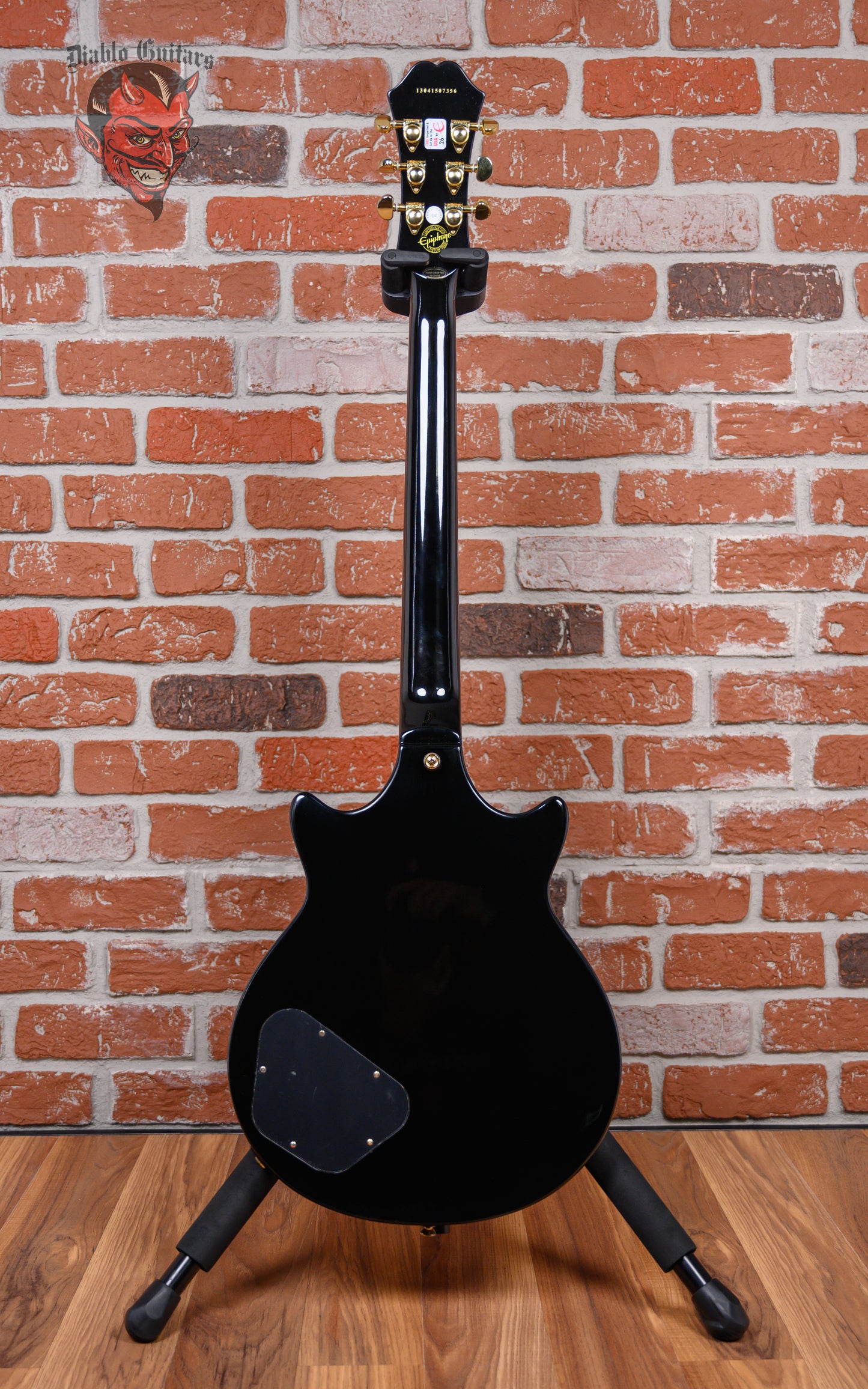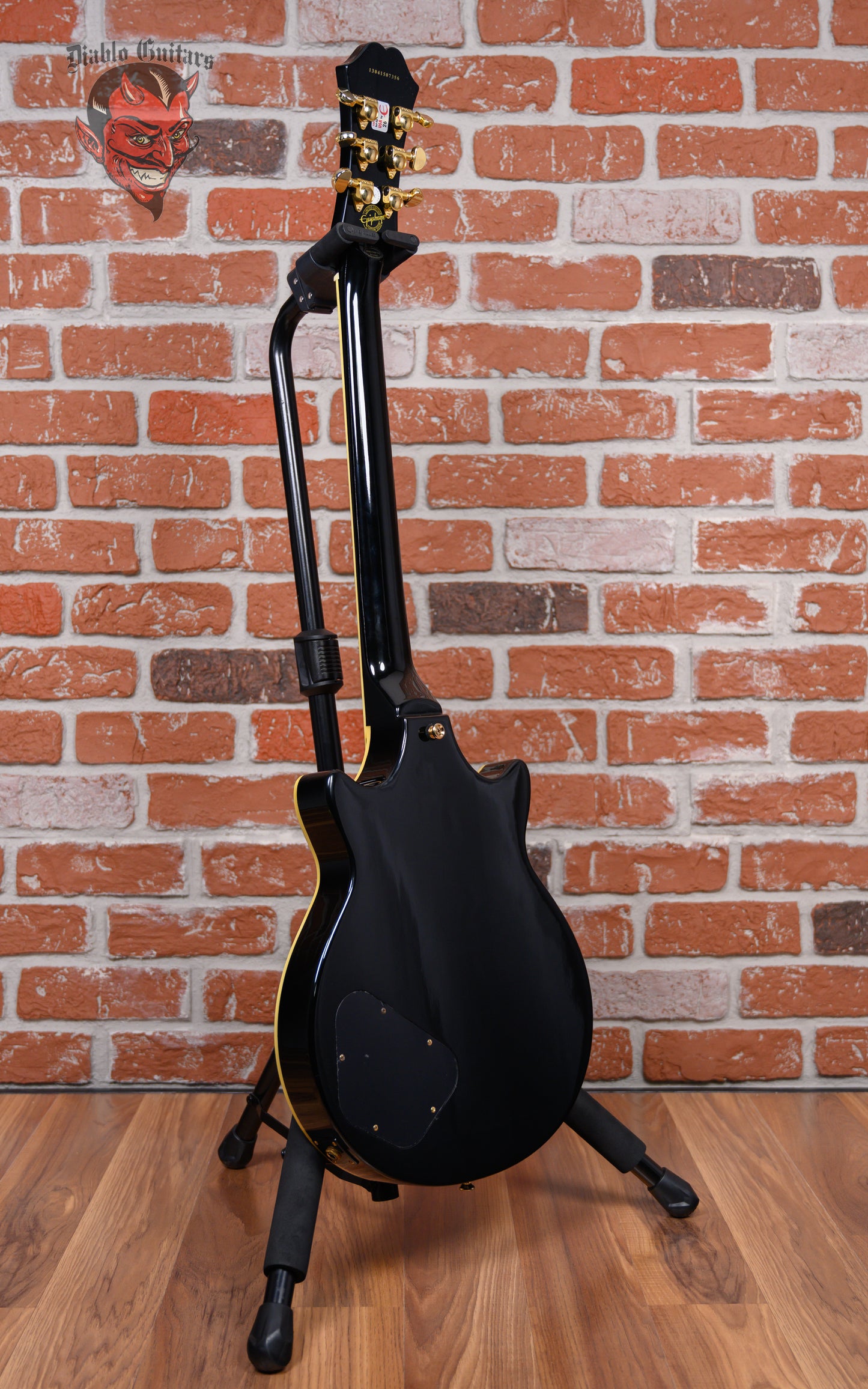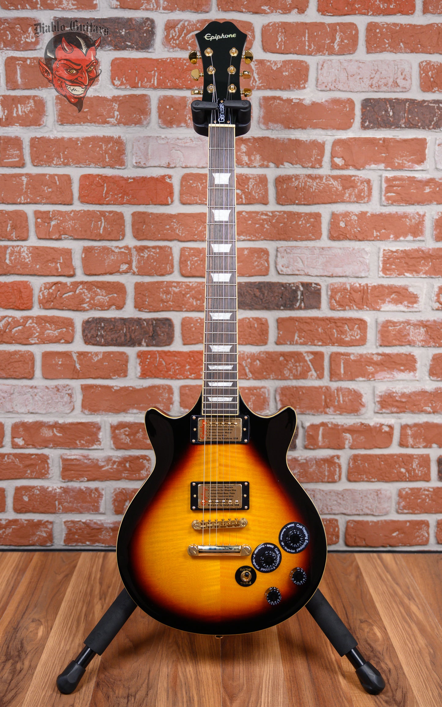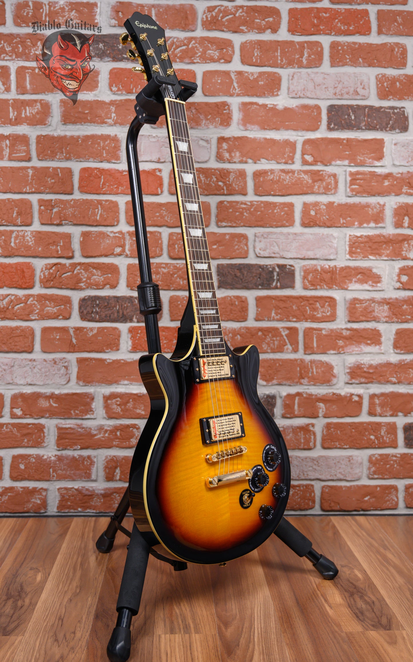 Epiphone Genesis Deluxe Pro in Vintage Sunburst finish made in 2013 with Original Hard Shell Case. This guitar features a solid mahogany body with a bound AAA flame maple top, mahogany neck and bound rosewood fingerboard. Equipped with an Epiphone ProBucker-2 in the neck position and an Epiphone ProBucker-3 in the bridge position. Controlled by 2 volume pots with push/pull coil tap, 2 tone pots and a 3-Way toggle switch. The 24.75" scale length neck has pearloid trapezoid inlays and black side markers with 22 medium jumbo frets on a 12" radius with a slim taper "D" profile. The hardware is comprised of gold Grover Rotomatic tuning machines with kidney heads, a plastic nut, a LockTone Tune-o-Matic bridge w/ stopbar tailpiece and black speed knobs.