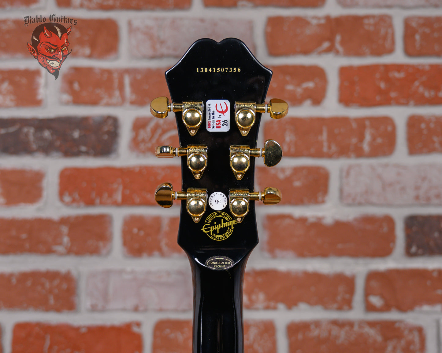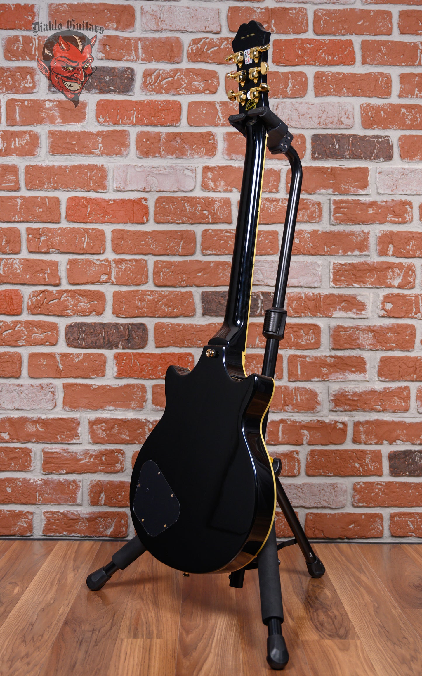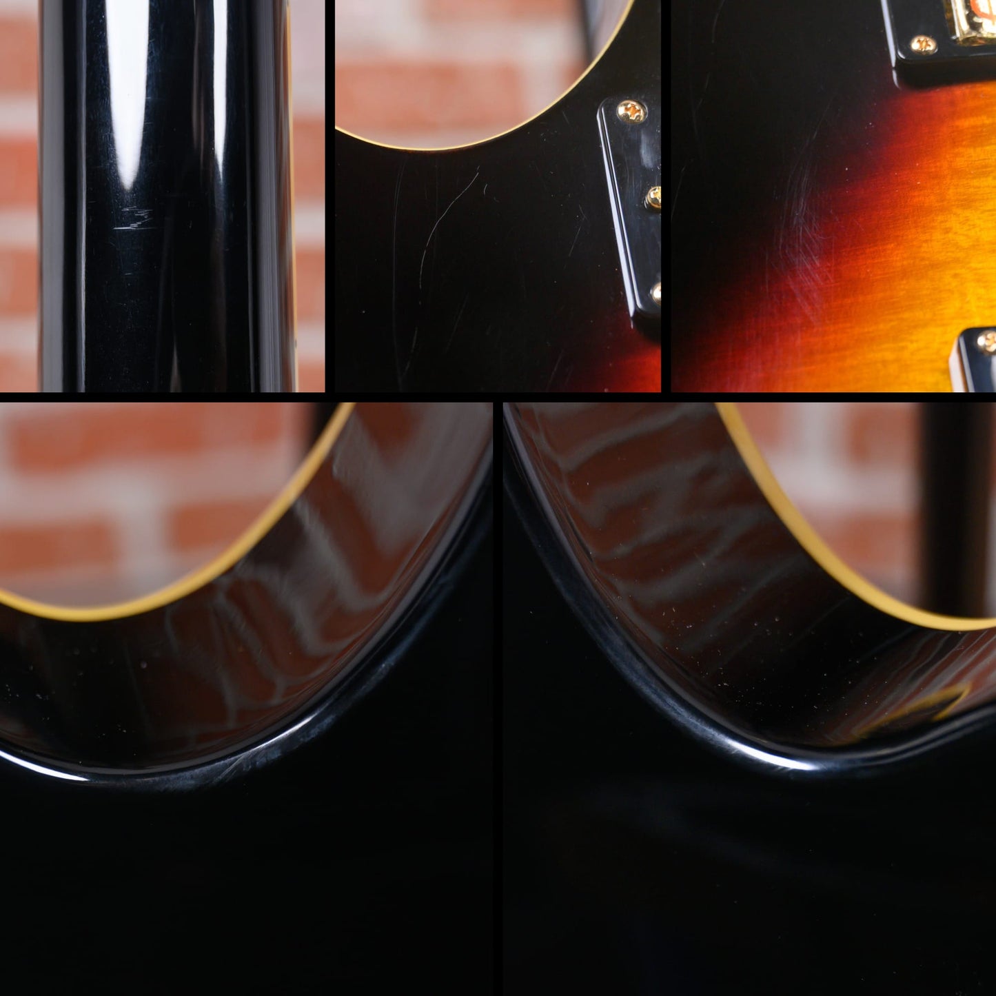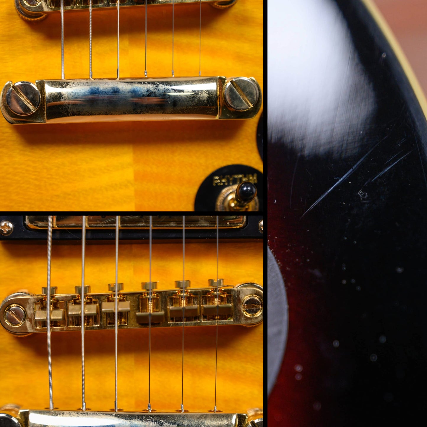 This guitar is in overall excellent condition. The factory protective film and stickers are still applied. The headstock, neck, and body all have light surface marks and areas of cloudy finish, mostly on the corners. The plating on the tuners and bridge pieces is lightly worn and shows aging. (See pics)