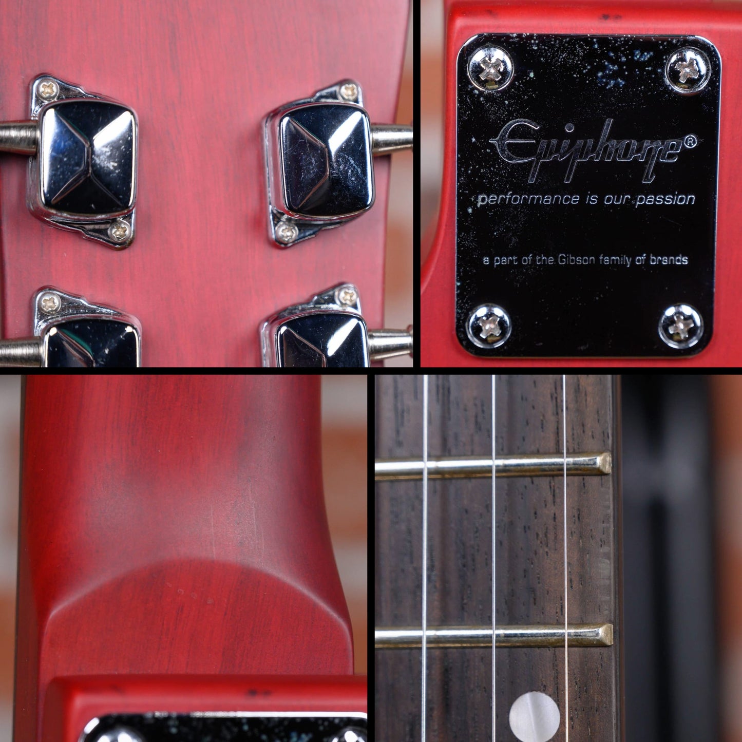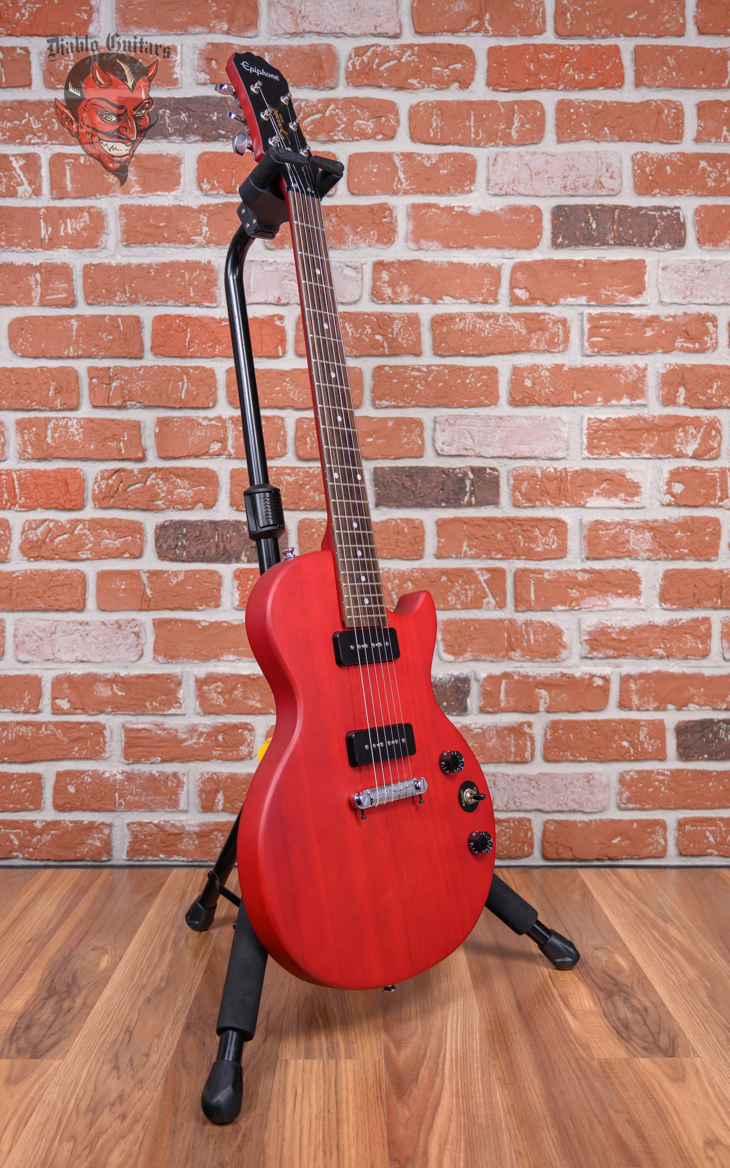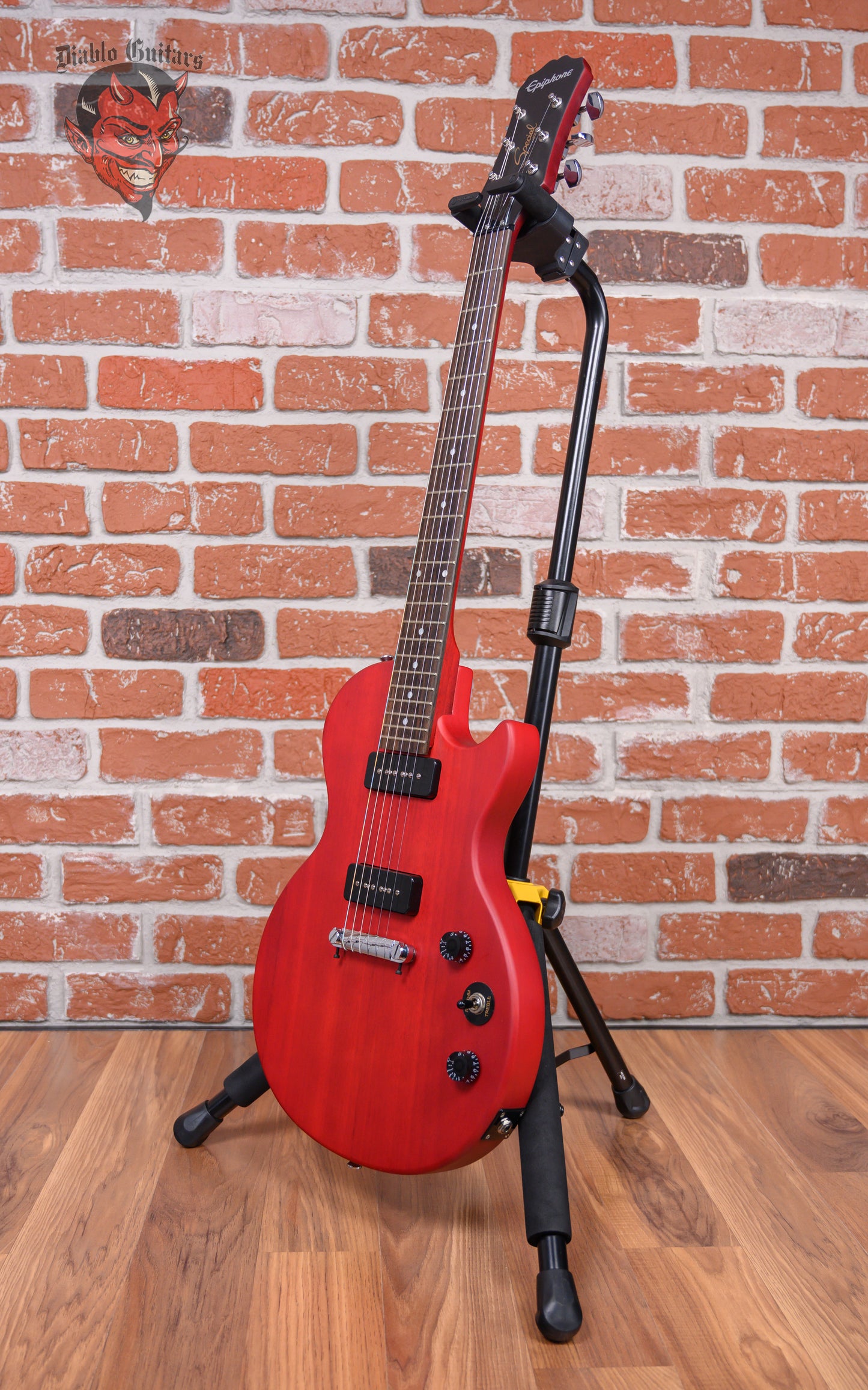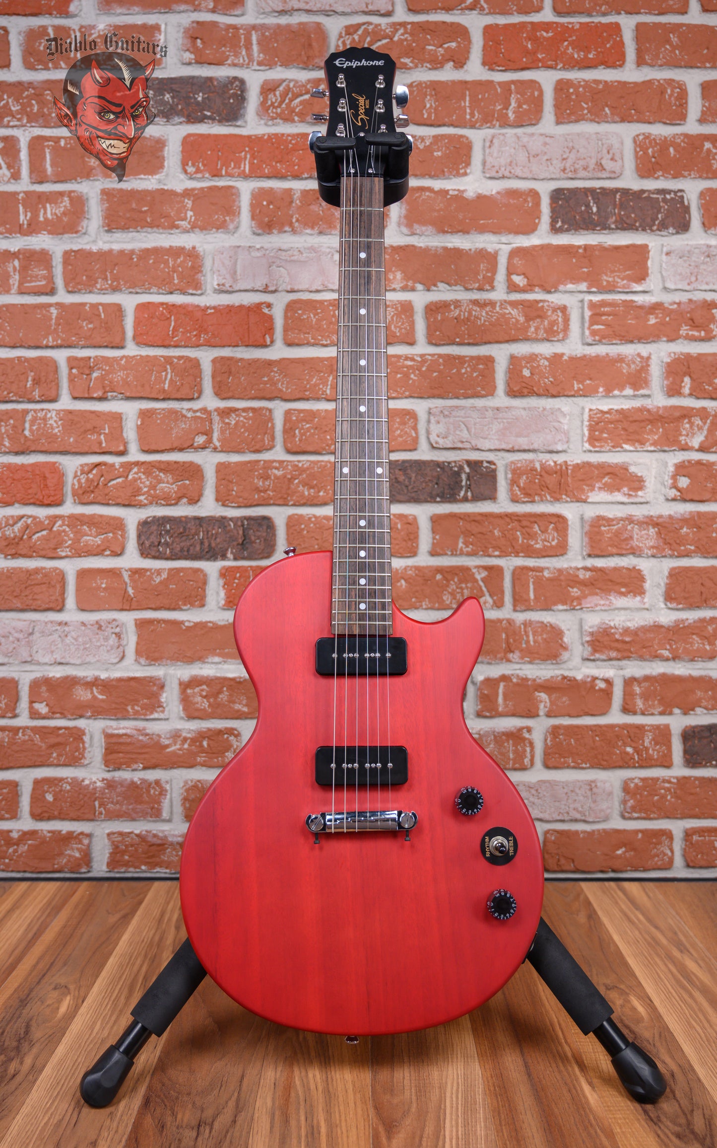 Epiphone Les Paul Special in Worn Cherry finish made in 2012 with Gigbag. This guitar features a solid basswood body, mahogany neck and rosewood fingerboard. Equipped with an Epiphone P90R in the neck position and an Epiphone P90T in the bridge position. Controlled by 1 volume pot, 1 tone pot and a 3-way toggle switch. The 24.75" scale length neck has white dot inlays and white side markers with 22 medium jumbo frets on a 12" radius with a slim taper profile. The hardware is comprised of nickel stamped die-cast tuning machines with cloche heads, a plastic nut, a compensated wraparound stopbar bridge and black speed knobs.
