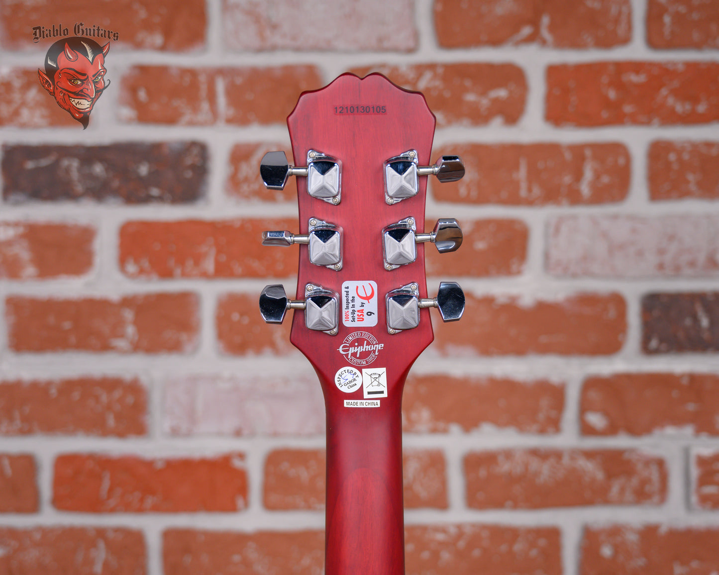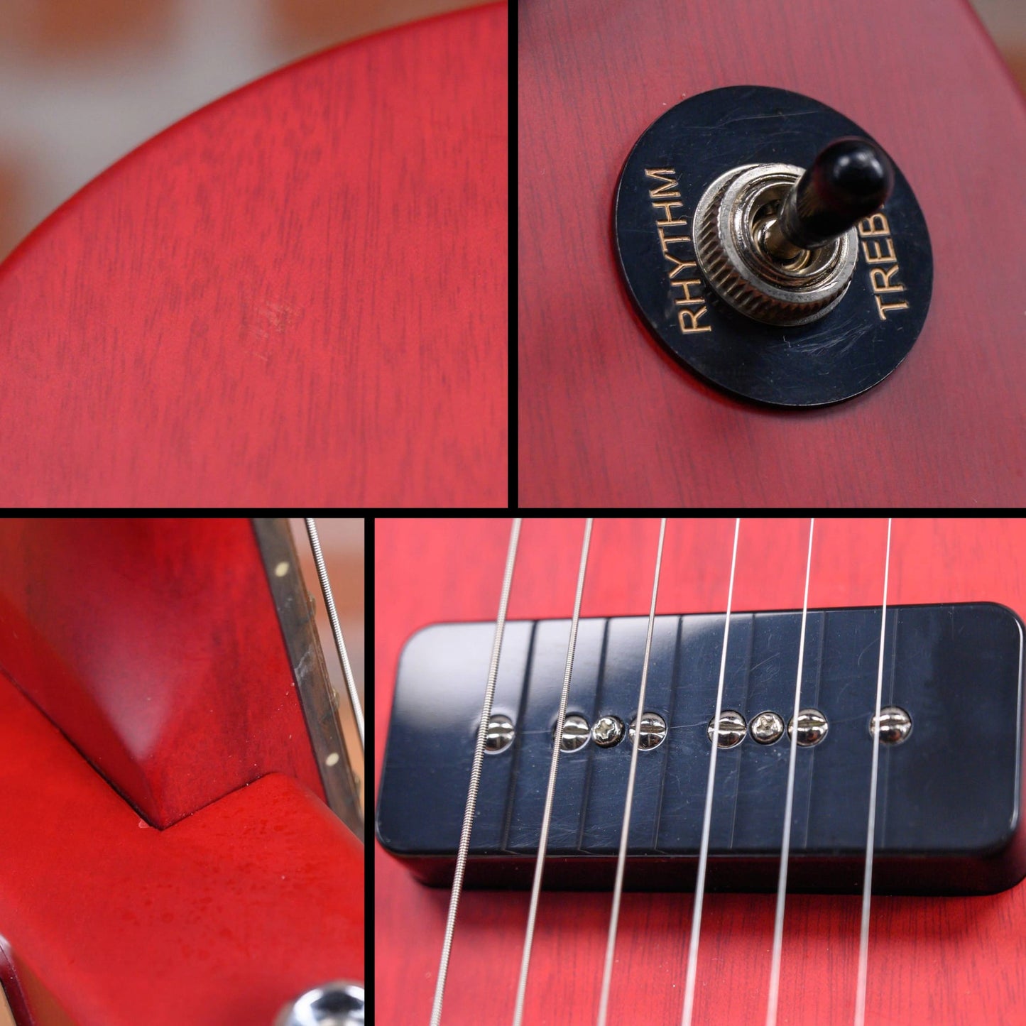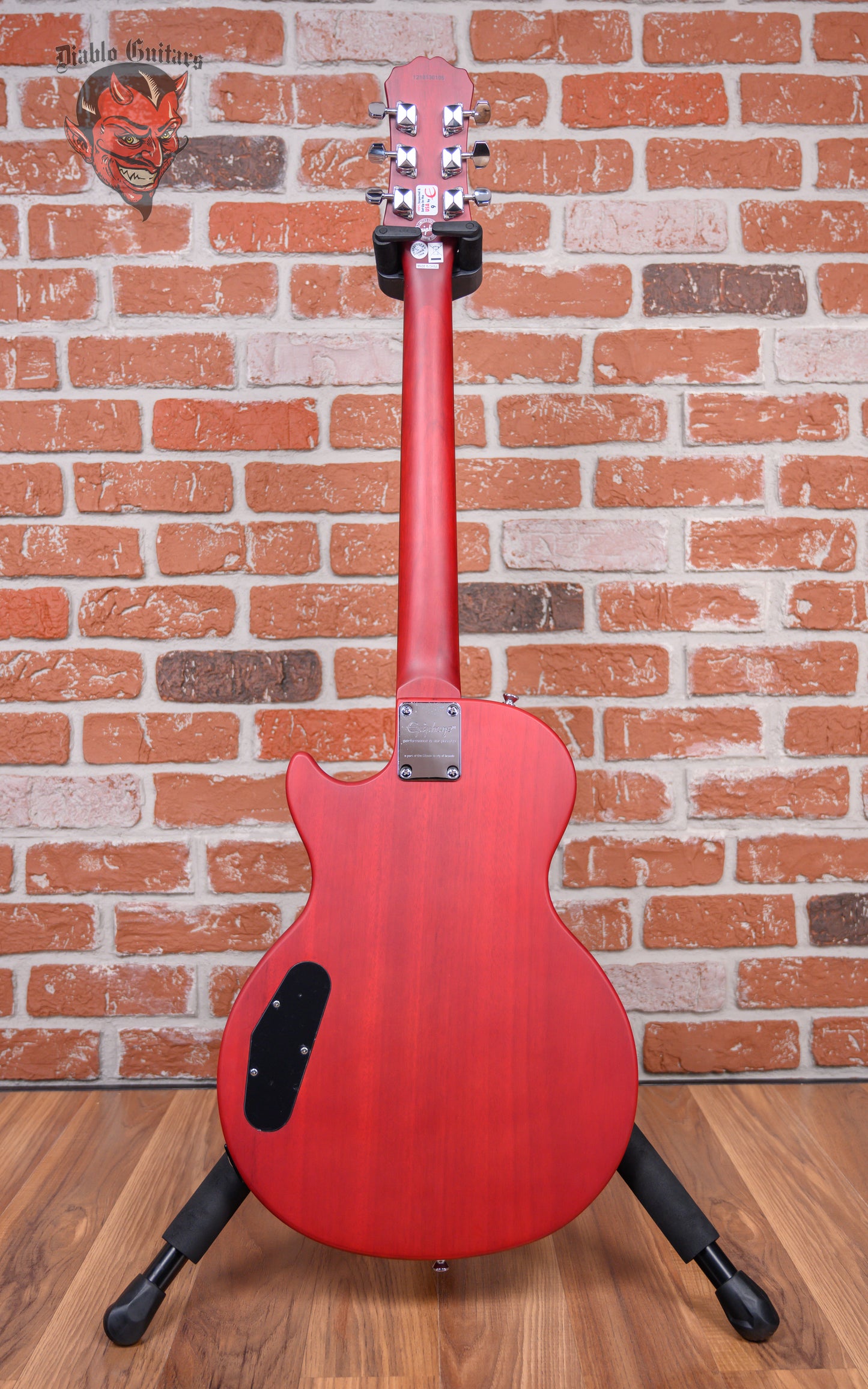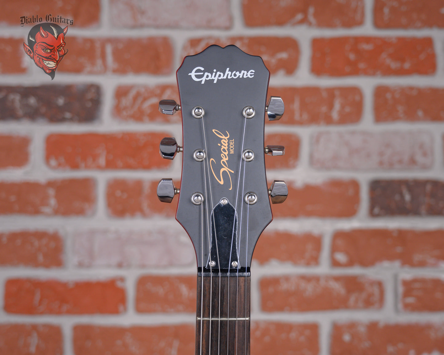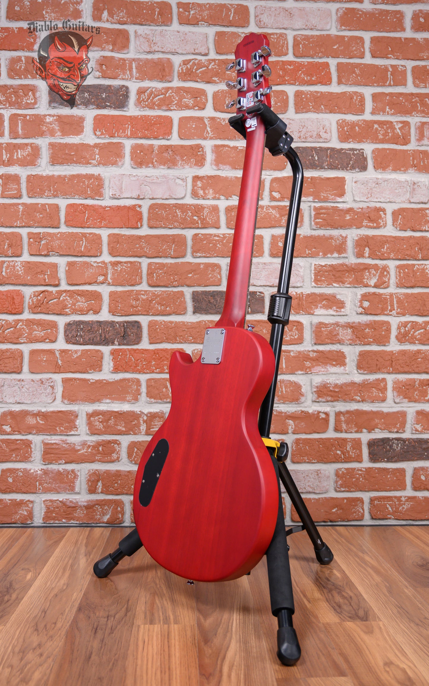 Epiphone Les Paul Special in Worn Cherry finish made in 2012 with Gigbag. This guitar features a solid basswood body, mahogany neck and rosewood fingerboard. Equipped with an Epiphone P90R in the neck position and an Epiphone P90T in the bridge position. Controlled by 1 volume pot, 1 tone pot and a 3-way toggle switch. The 24.75" scale length neck has white dot inlays and white side markers with 22 medium jumbo frets on a 12" radius with a slim taper profile. The hardware is comprised of nickel stamped die-cast tuning machines with cloche heads, a plastic nut, a compensated wraparound stopbar bridge and black speed knobs.