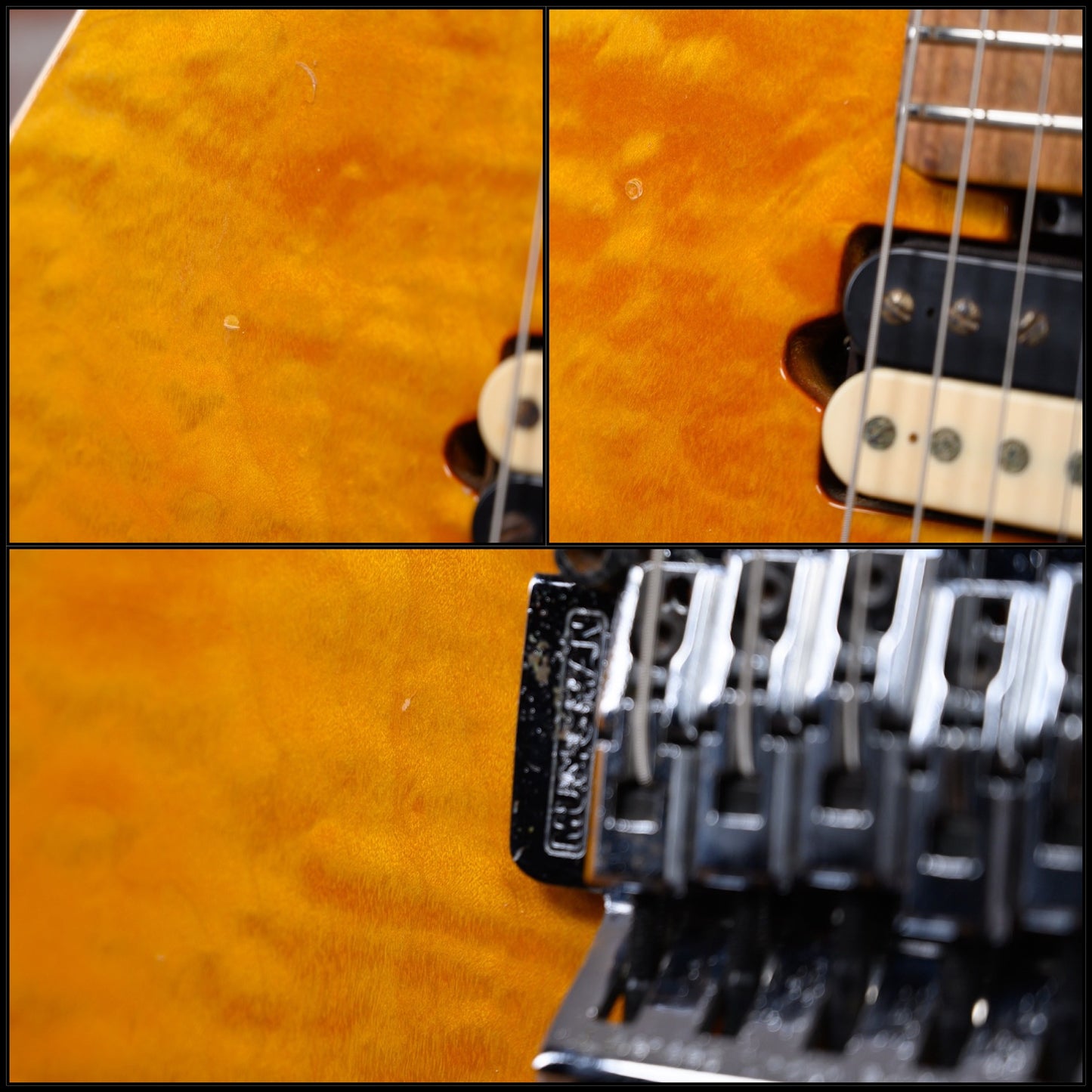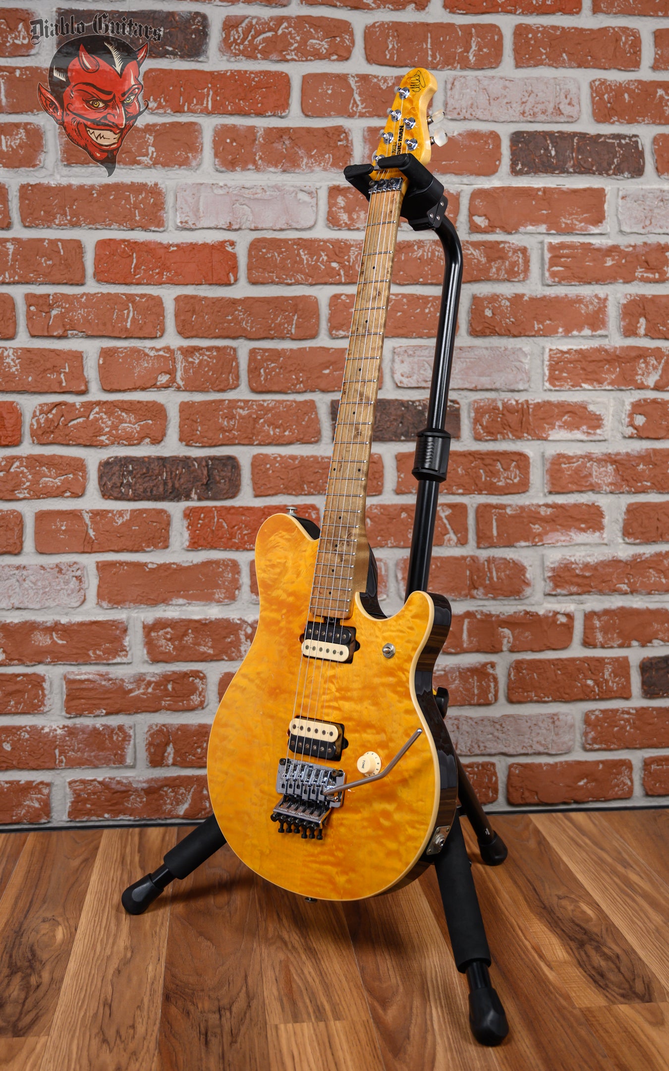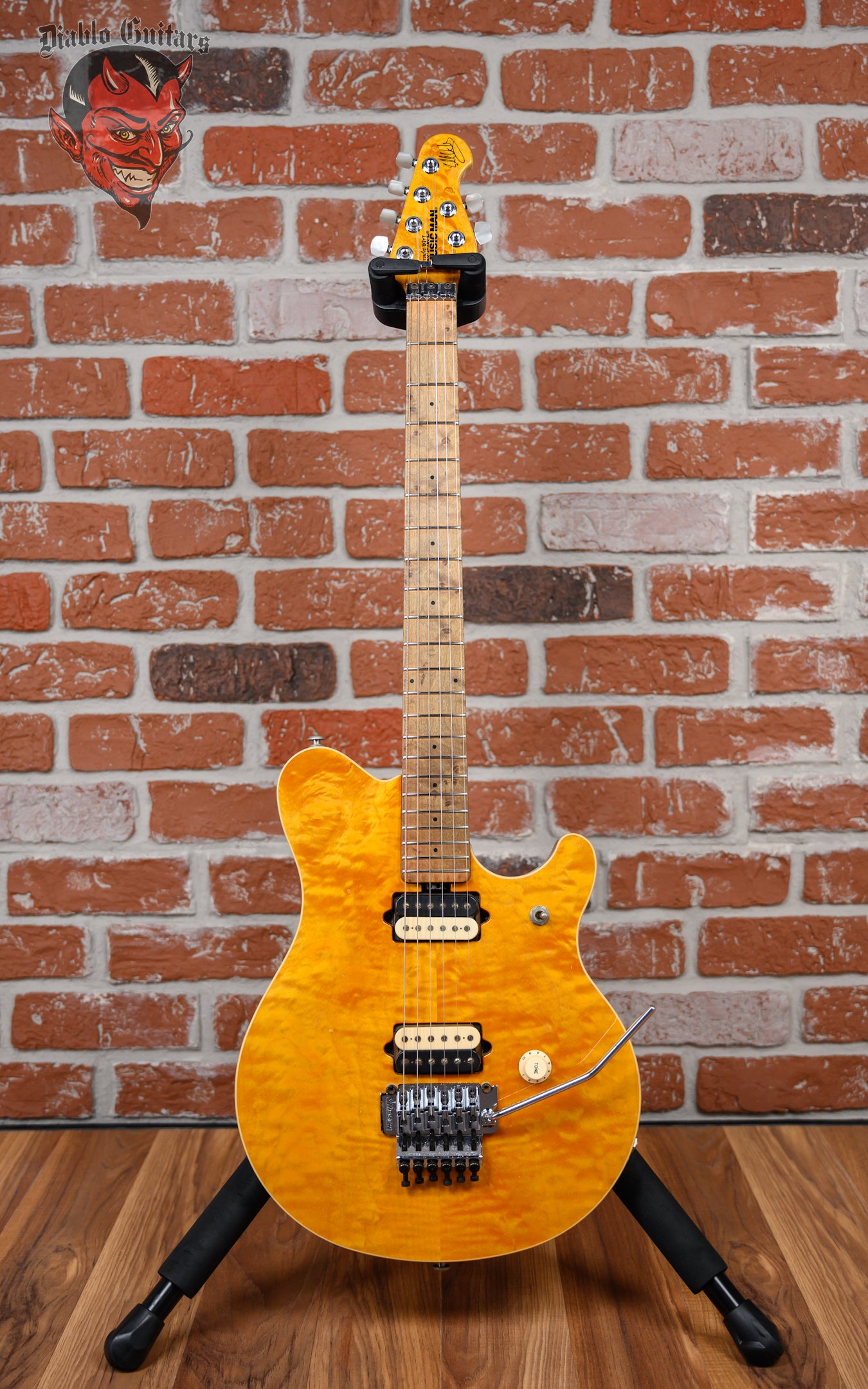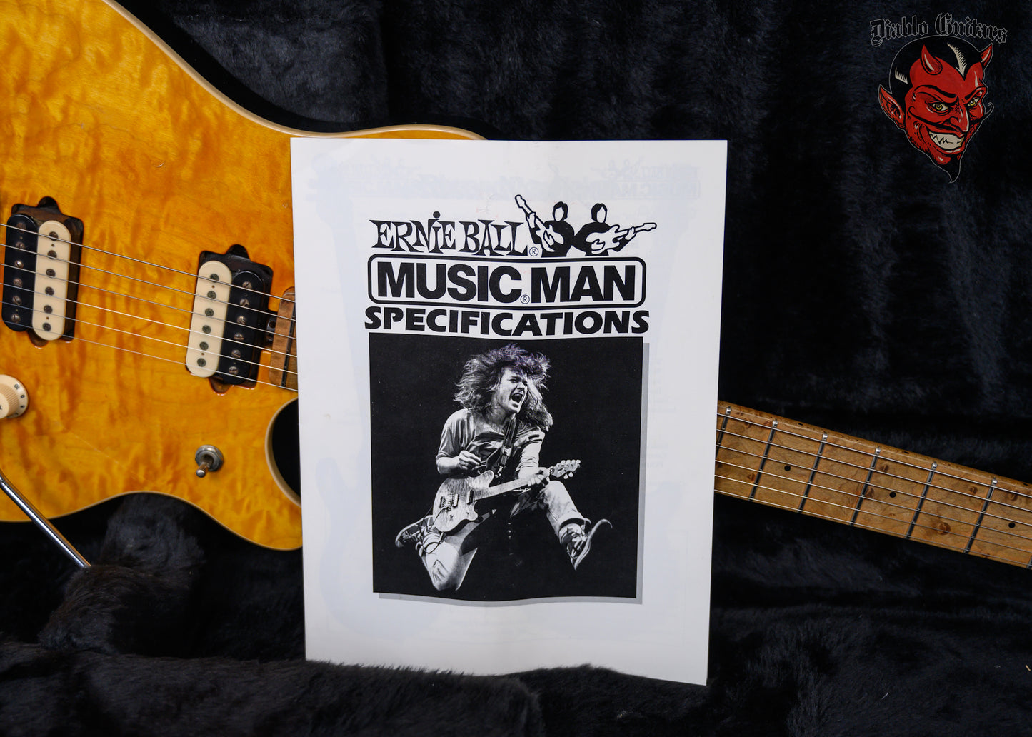 Ernie Ball Music Man Edward Van Halen Signature Quilted Maple Top in Translucent Gold finish made in 1995 with Original Hard Shell Case. This guitar features a solid basswood body with a cream bound book matched quilted maple top, a birdseye maple neck and fingerboard with color matched figured maple overlay headstock. Equipped with a set of original DiMarzio Custom Humbuckers in the neck position and bridge position. Controlled by one 500K master volume knob, labeled "tone" Like Eddie likes and a 3-way toggle switch. The 25.5" scale length neck has black dot inlays and 22 special design unique profile frets on a 10" radius with an EVH custom asymmetrical C neck profile. The hardware is comprised of chrome Schaller M6-La tuning machines with pearloid buttons, a Floyd Rose locking nut, a music man surface mounted licensed Floyd Rose tremolo bridge and a white top hat knob.