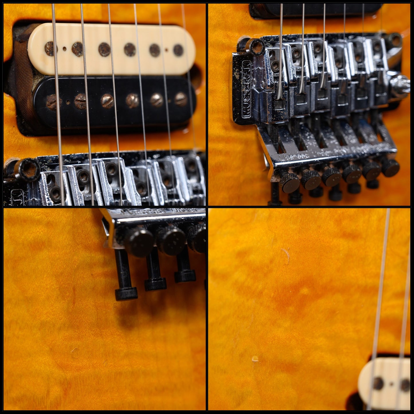 This guitar is in overall very good condition with some signs of play. It has some dings and light dents, a few small finish splits Including neck pocket corners. The hardware has visible signs of oxidation and the pickup slugs and screws are oxidized and rusted. (See pics)