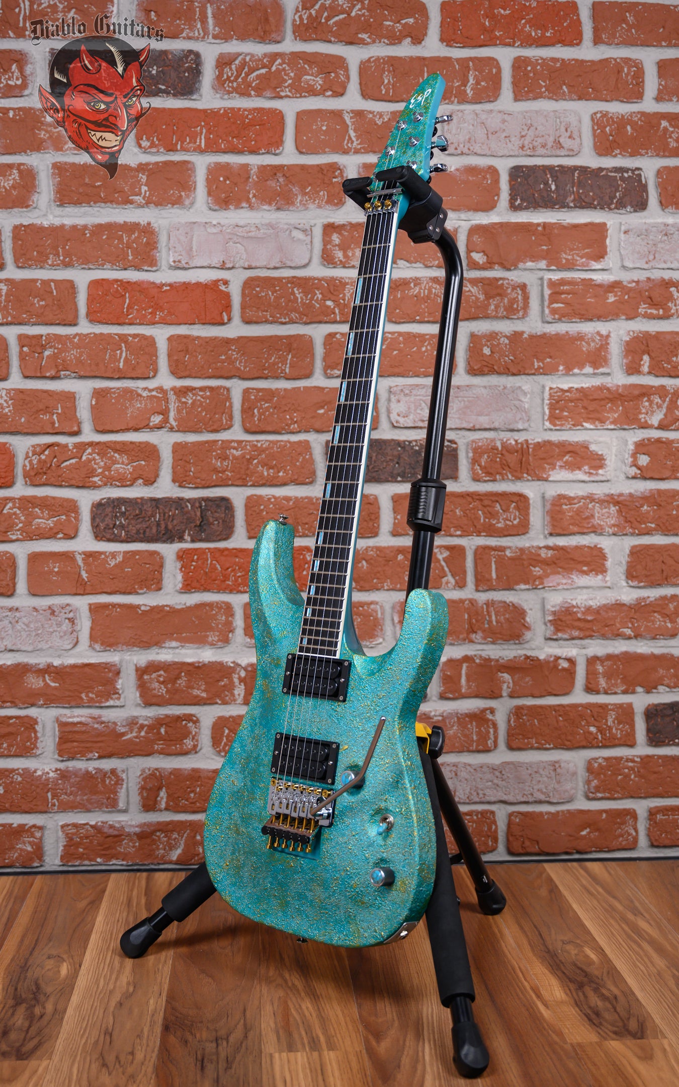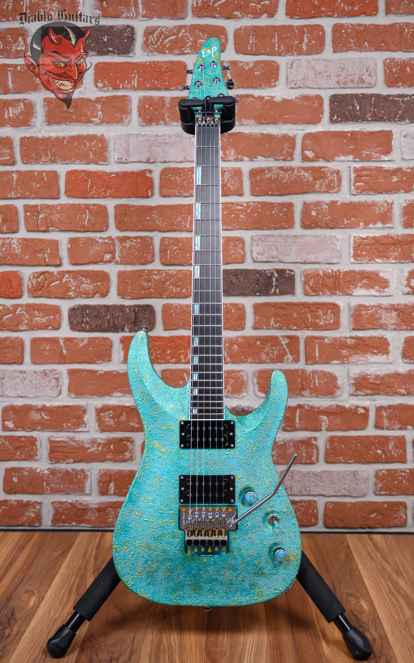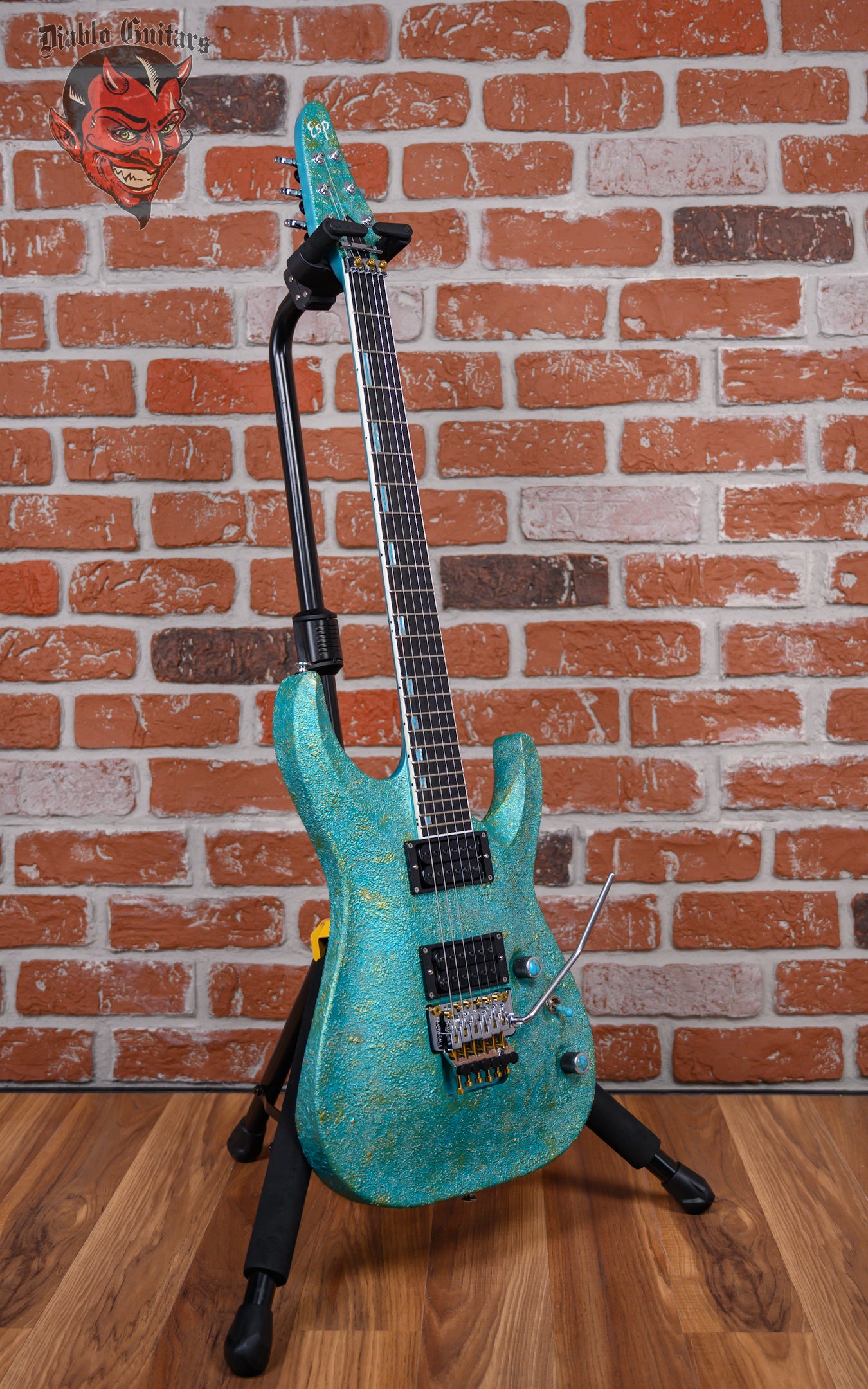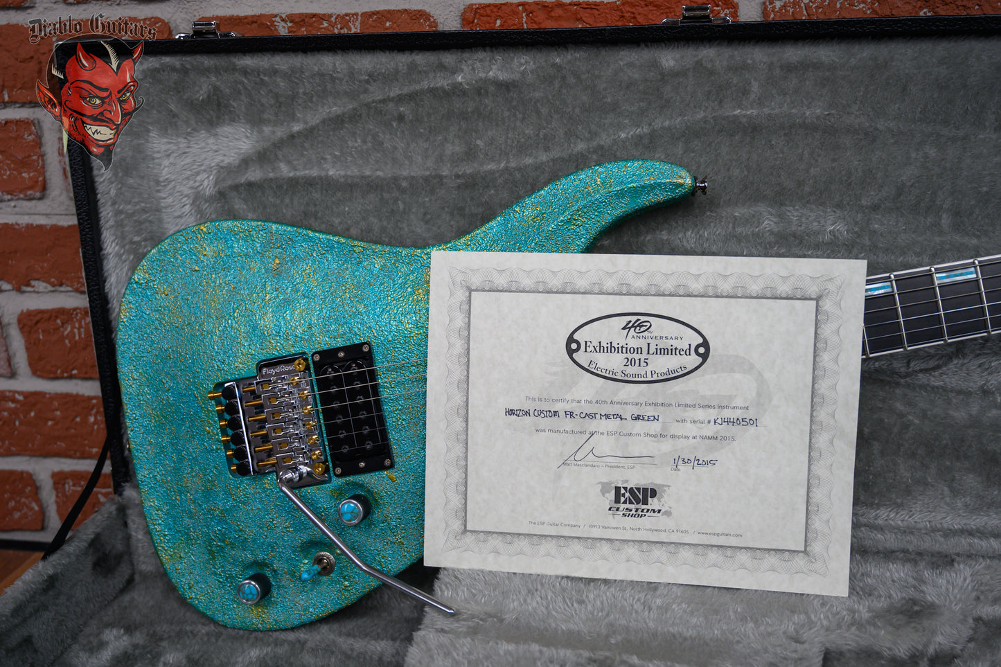 ESP 40th Anniversary Namm Exhibition Limited Custom Shop Horizon FR in Cast Metal Green finish made in 2015 with Original Hard Shell Case. This guitar features a solid mahogany body with a maple top, 3-piece maple neck-thru and bound ebony fingerboard with a color matched headstock. Upgraded with a pair of bare knuckle Crawler humbuckers in the neck position and bridge position. Controlled by 1 volume, 1 tone pot with push pull coil tap and a 3-Way toggle switch. The 25.5" scale length neck has mother of pearl / reconstituted stone offset block inlays and black side markers with 24 extra jumbo frets on a 305mm radius with a thin U profile. The hardware is comprised of chrome gotoh magnum Lock-Trad tuning machines with cloche heads, a Floyd Rose locking nut with gold titanium bolts, a Floyd Rose original double locking tremolo with upgraded FU-Tone brass block, brass trem claw/screws, trem stop/ silent springs, Gold titanium posts/ hardware, and chrome knurled dome knobs with turquoise inserts.
