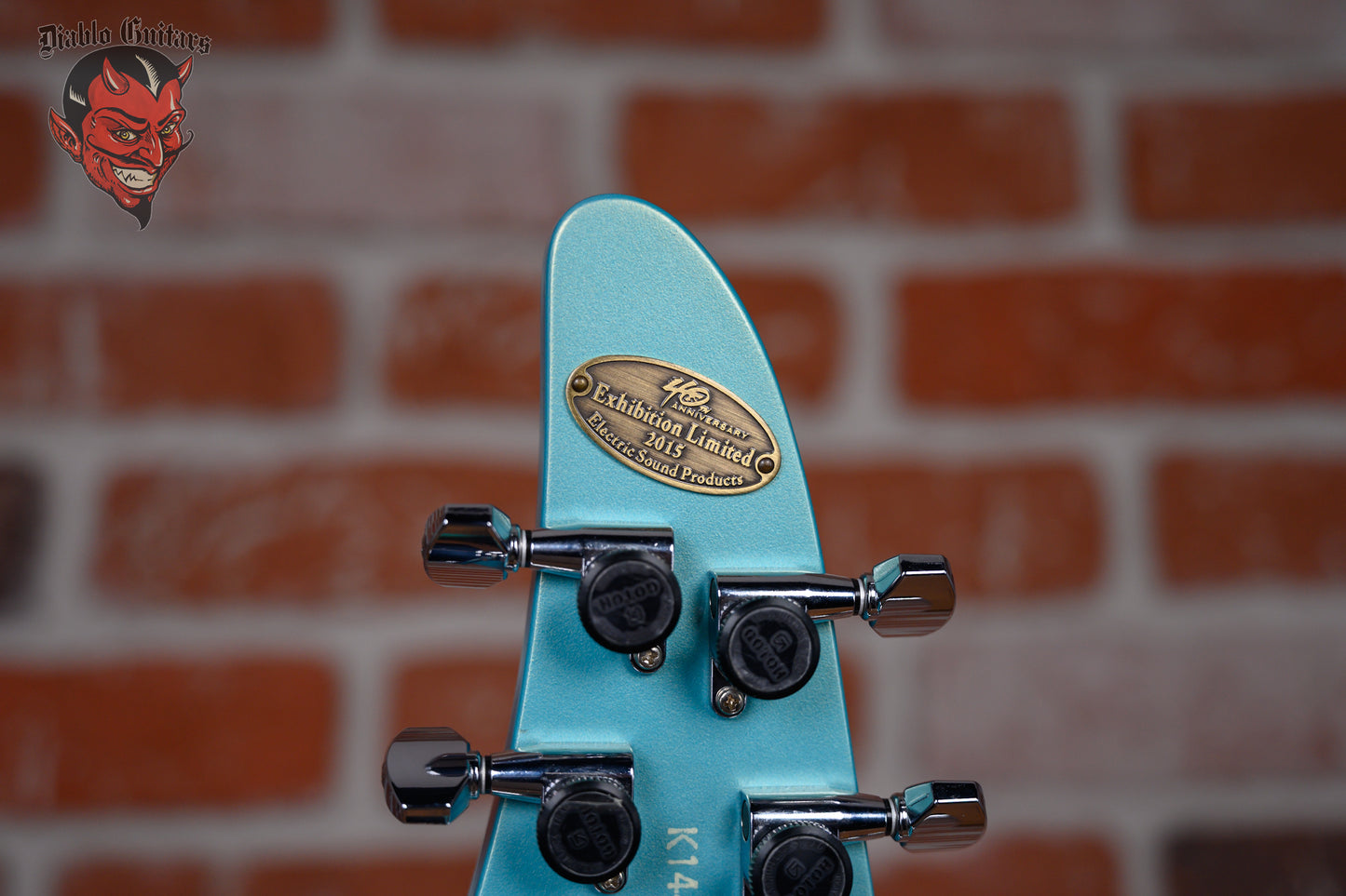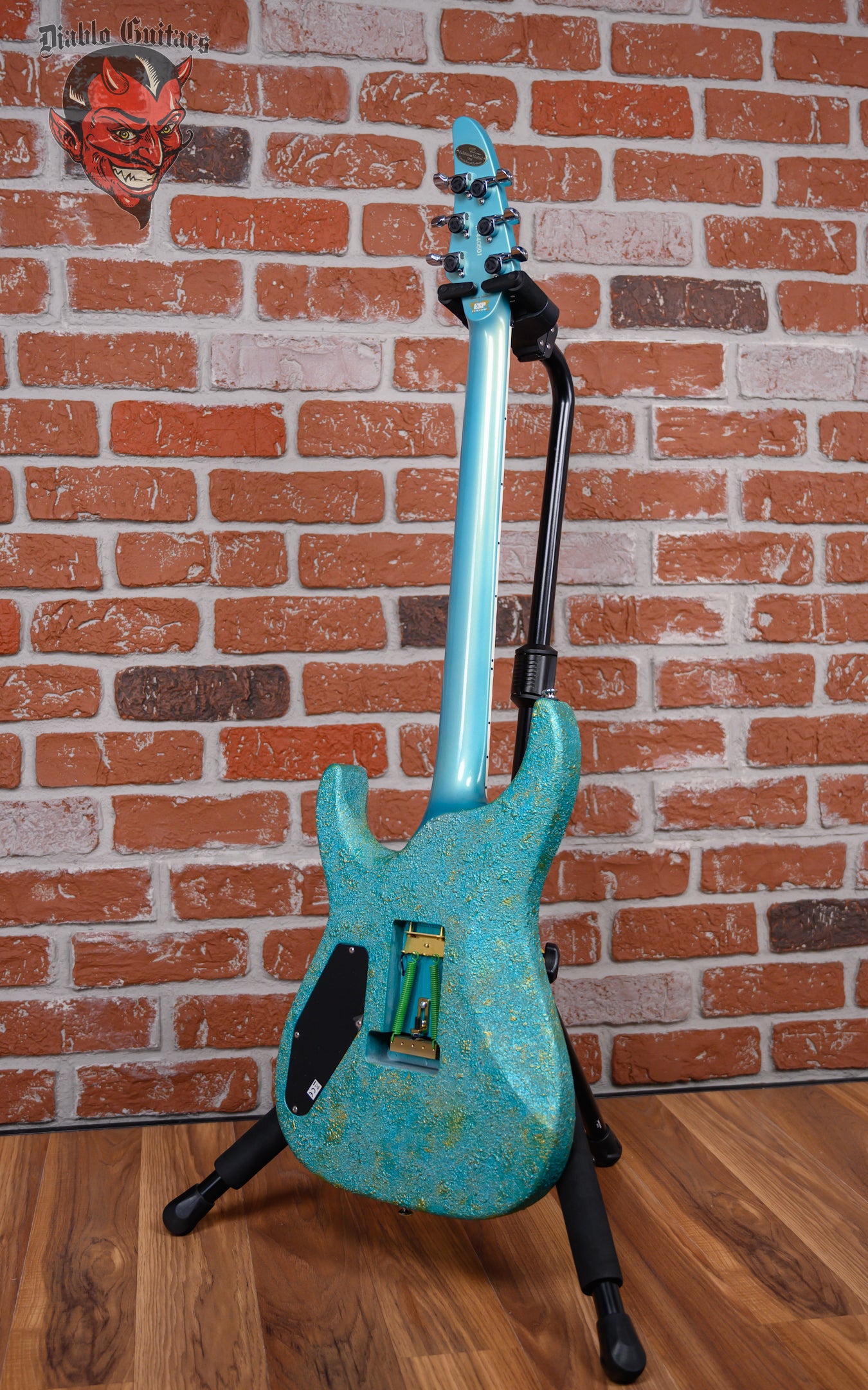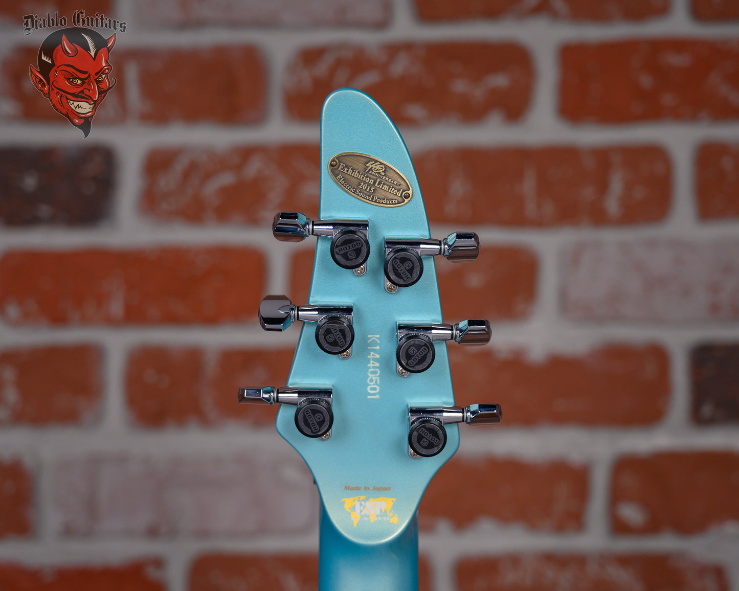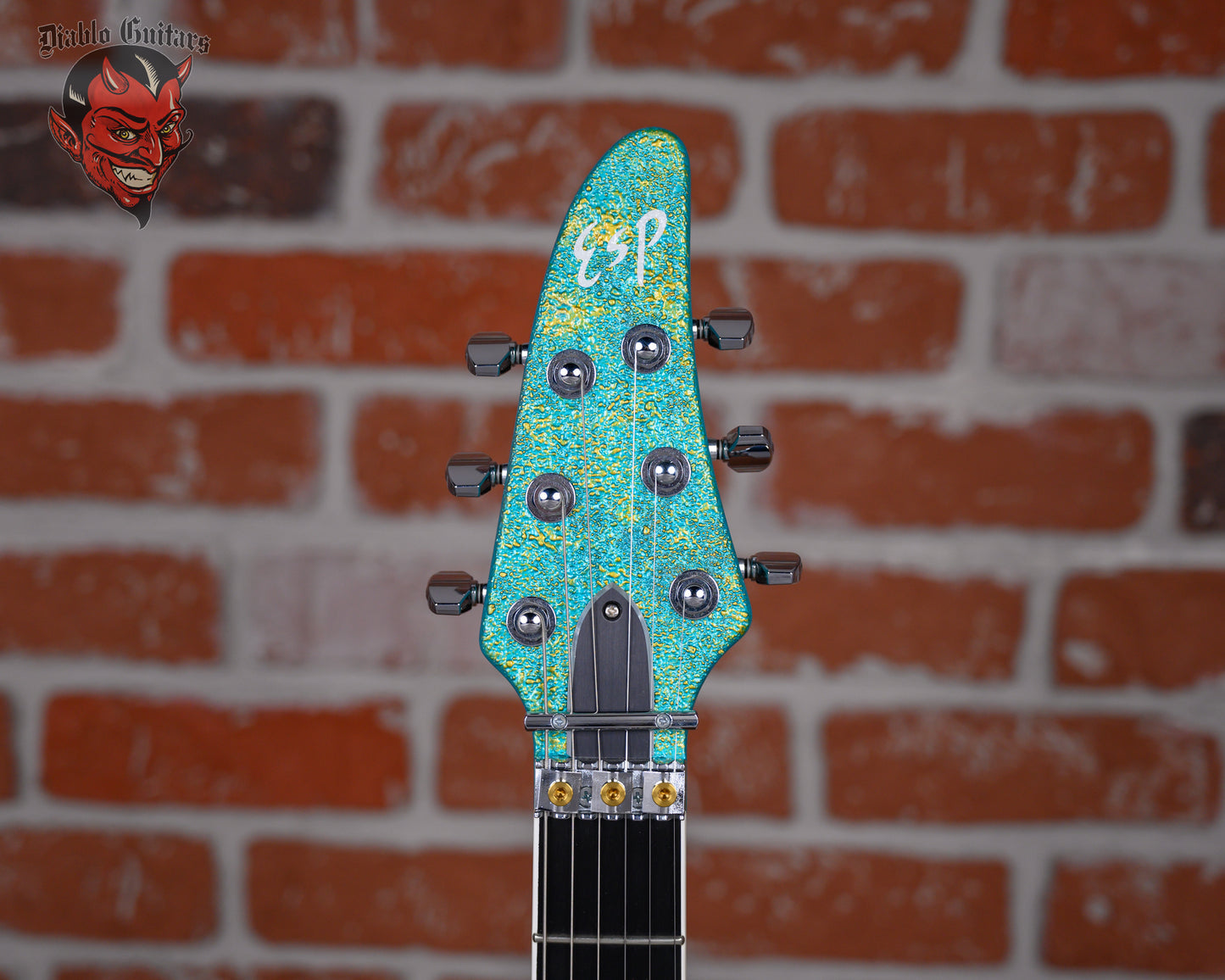 ESP 40th Anniversary Namm Exhibition Limited Custom Shop Horizon FR in Cast Metal Green finish made in 2015 with Original Hard Shell Case. This guitar features a solid mahogany body with a maple top, 3-piece maple neck-thru and bound ebony fingerboard with a color matched headstock. Upgraded with a pair of bare knuckle Crawler humbuckers in the neck position and bridge position. Controlled by 1 volume, 1 tone pot with push pull coil tap and a 3-Way toggle switch. The 25.5" scale length neck has mother of pearl / reconstituted stone offset block inlays and black side markers with 24 extra jumbo frets on a 305mm radius with a thin U profile. The hardware is comprised of chrome gotoh magnum Lock-Trad tuning machines with cloche heads, a Floyd Rose locking nut with gold titanium bolts, a Floyd Rose original double locking tremolo with upgraded FU-Tone brass block, brass trem claw/screws, trem stop/ silent springs, Gold titanium posts/ hardware, and chrome knurled dome knobs with turquoise inserts.