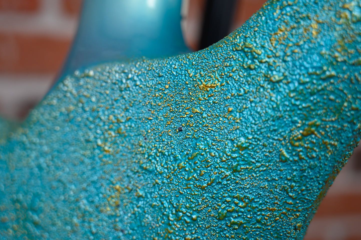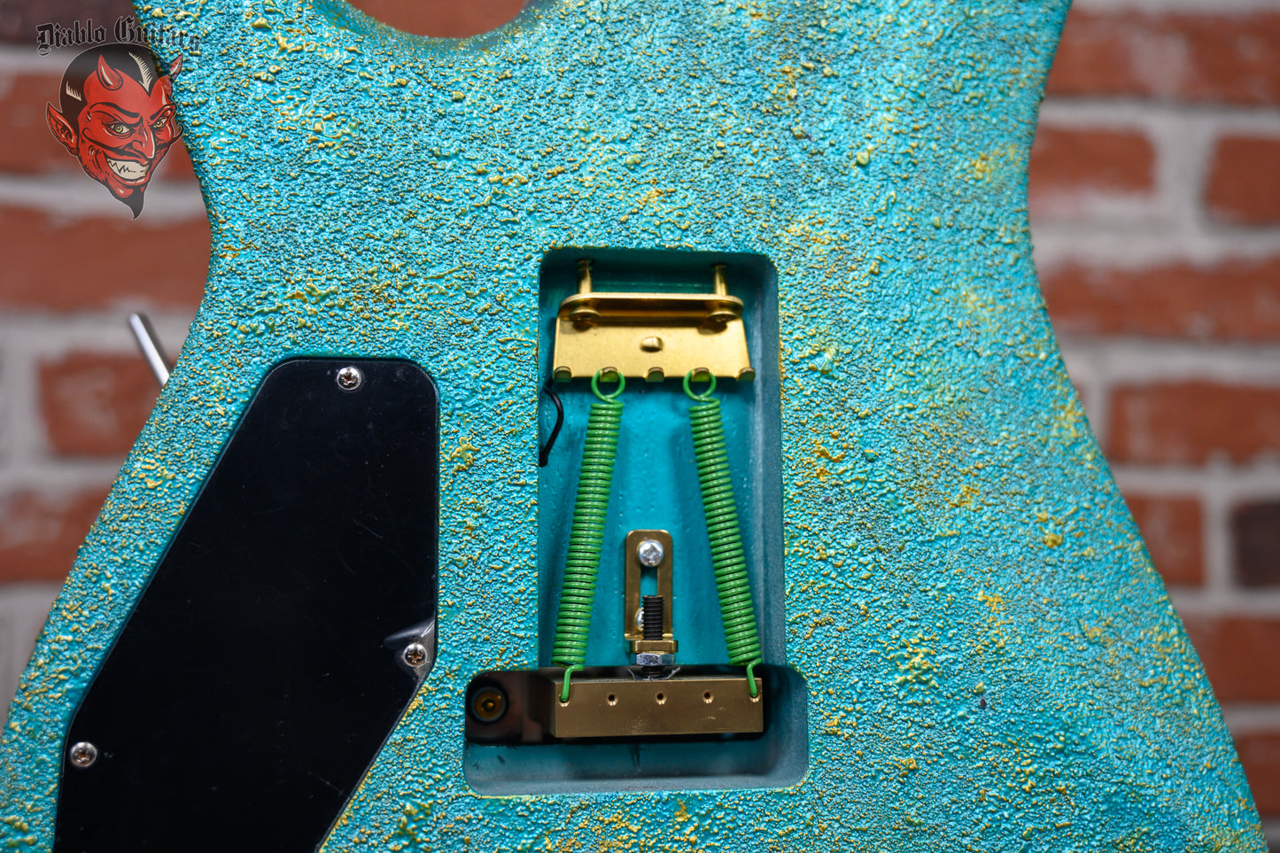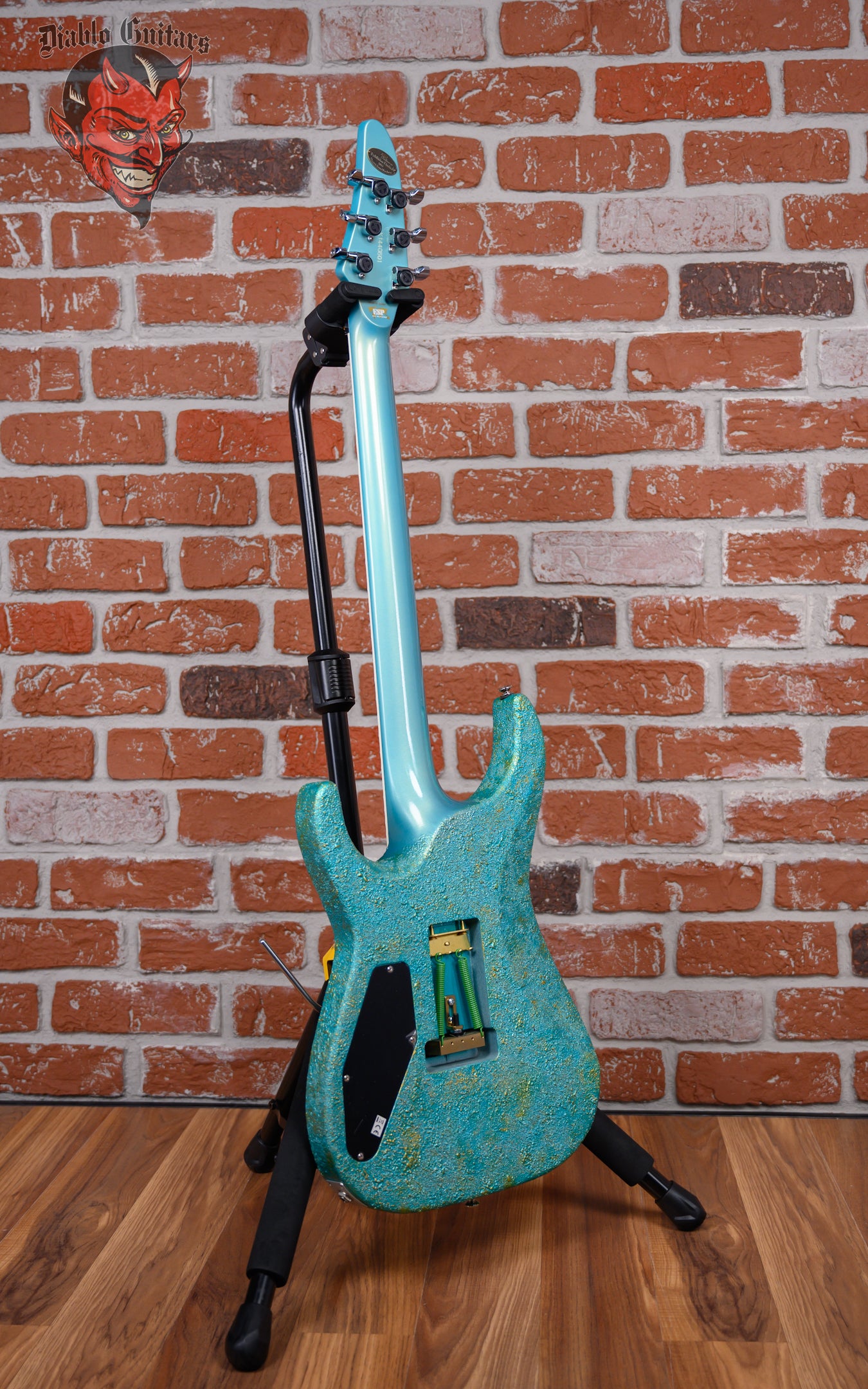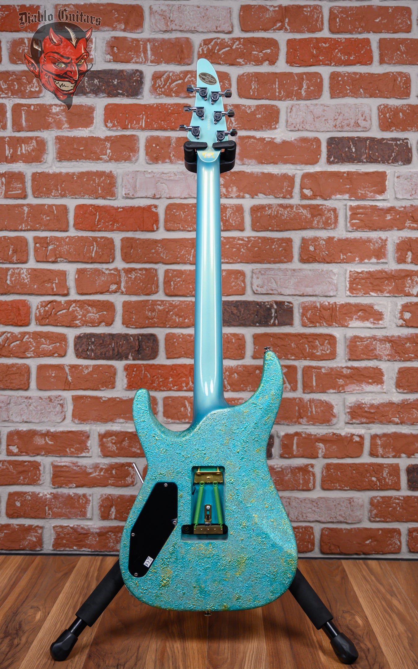 ESP 40th Anniversary Namm Exhibition Limited Custom Shop Horizon FR in Cast Metal Green finish made in 2015 with Original Hard Shell Case. This guitar features a solid mahogany body with a maple top, 3-piece maple neck-thru and bound ebony fingerboard with a color matched headstock. Upgraded with a pair of bare knuckle Crawler humbuckers in the neck position and bridge position. Controlled by 1 volume, 1 tone pot with push pull coil tap and a 3-Way toggle switch. The 25.5" scale length neck has mother of pearl / reconstituted stone offset block inlays and black side markers with 24 extra jumbo frets on a 305mm radius with a thin U profile. The hardware is comprised of chrome gotoh magnum Lock-Trad tuning machines with cloche heads, a Floyd Rose locking nut with gold titanium bolts, a Floyd Rose original double locking tremolo with upgraded FU-Tone brass block, brass trem claw/screws, trem stop/ silent springs, Gold titanium posts/ hardware, and chrome knurled dome knobs with turquoise inserts.