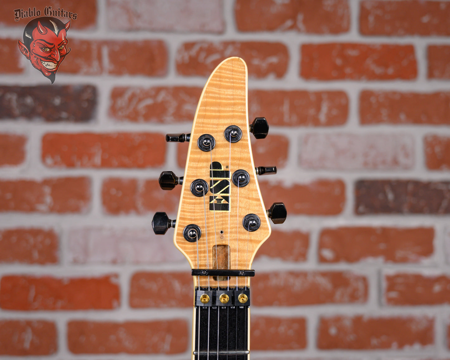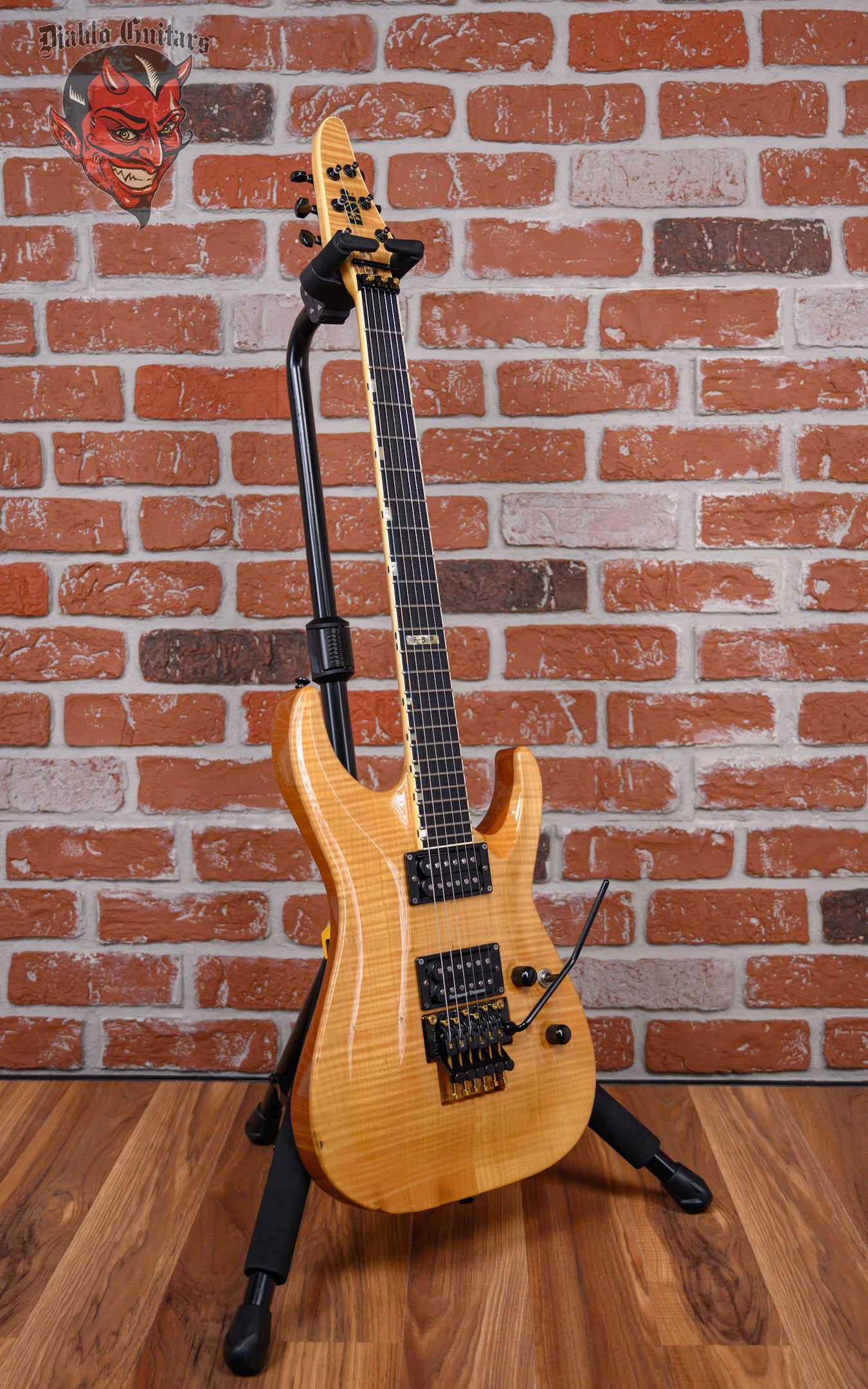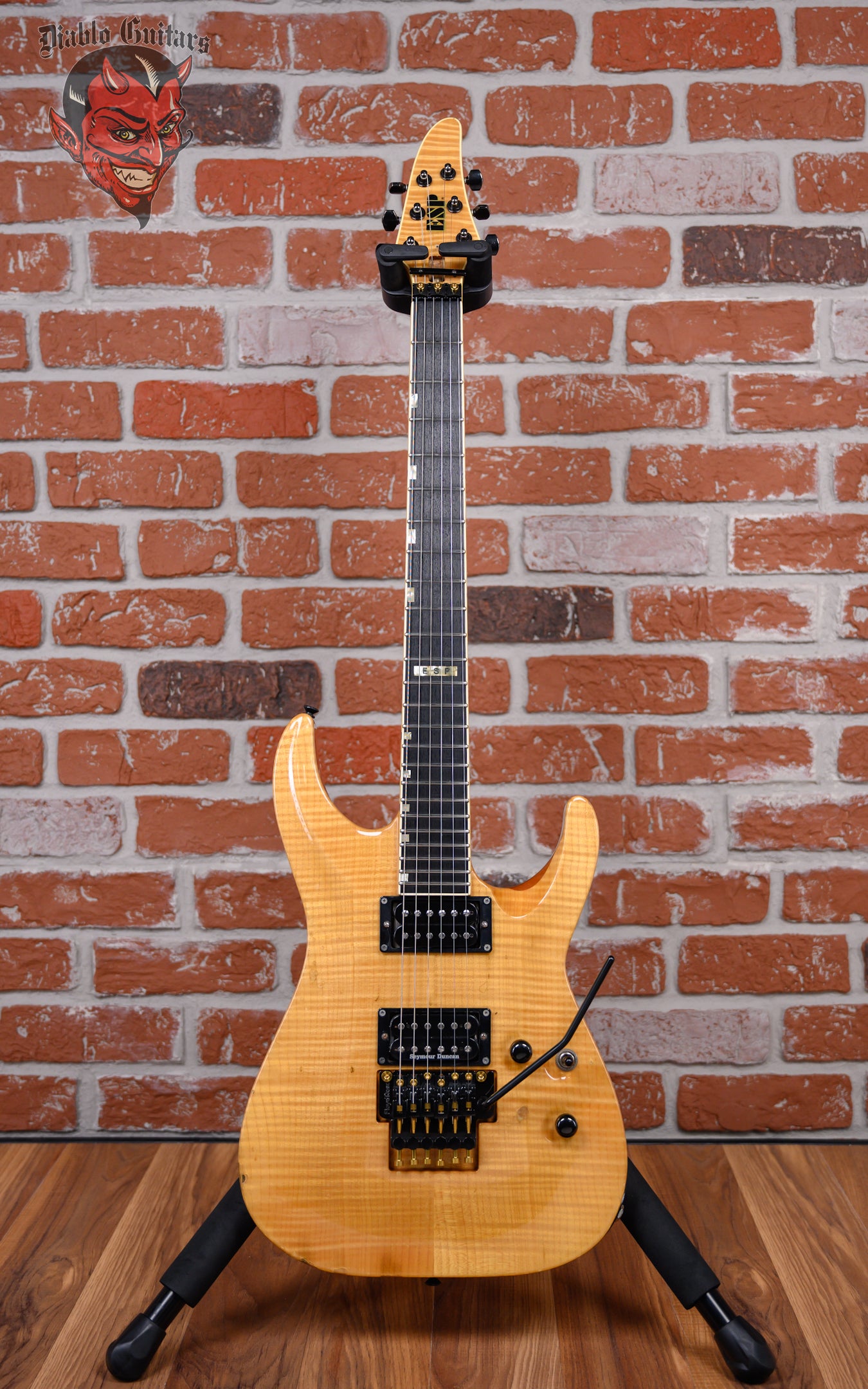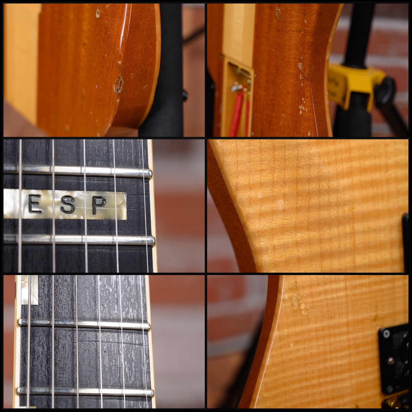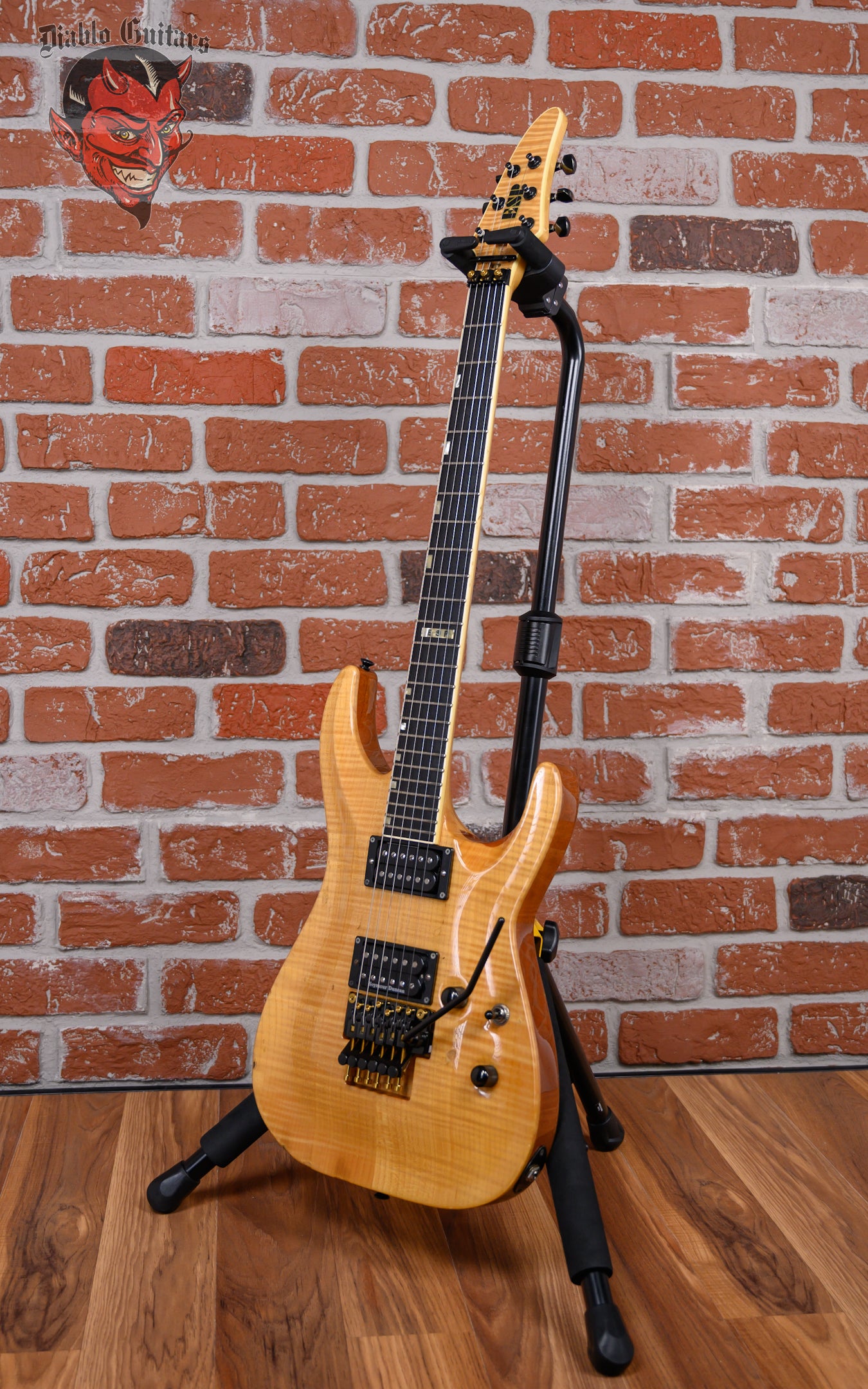 ESP Custom Horizon Flame Maple Top in Natural finish made in 1998 with Gator Hard Shell Case. This guitar features a solid mahogany body with a flamed maple top, 3-Piece maple neck-thru and bound ebony fingerboard with a bound, color matched flame maple overlay headstock. Equipped with a Seymour Duncan ‘59 in the neck position and a Seymour Duncan JB in the bridge position. Controlled by 1 volume, 1 tone pot and a 3-Way toggle switch. The 25.5" scale length neck has pearloid offset block inlays and black oval side markers with 24 extra jumbo frets on a 305mm radius with a thin U profile. The hardware is comprised of black gotoh sealed Die-Cast tuning machines with cloche heads, a Floyd Rose locking nut with gold Titanium bolts, a Floyd Rose original double locking tremolo with upgraded FU-Tone brass black, brass trem claw/screws, silent springs, gold titanium studs and hardware, and black knurled dome knobs.