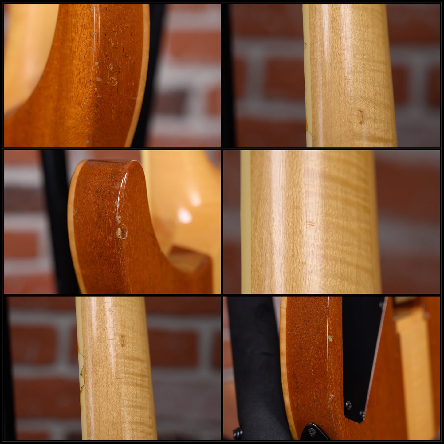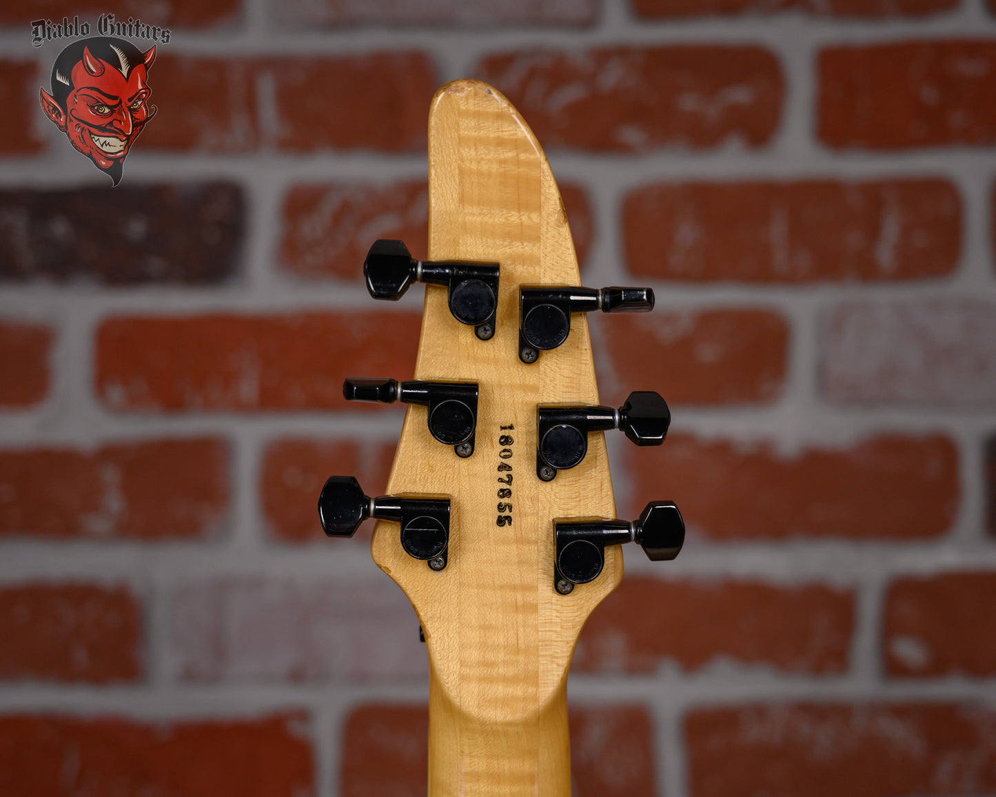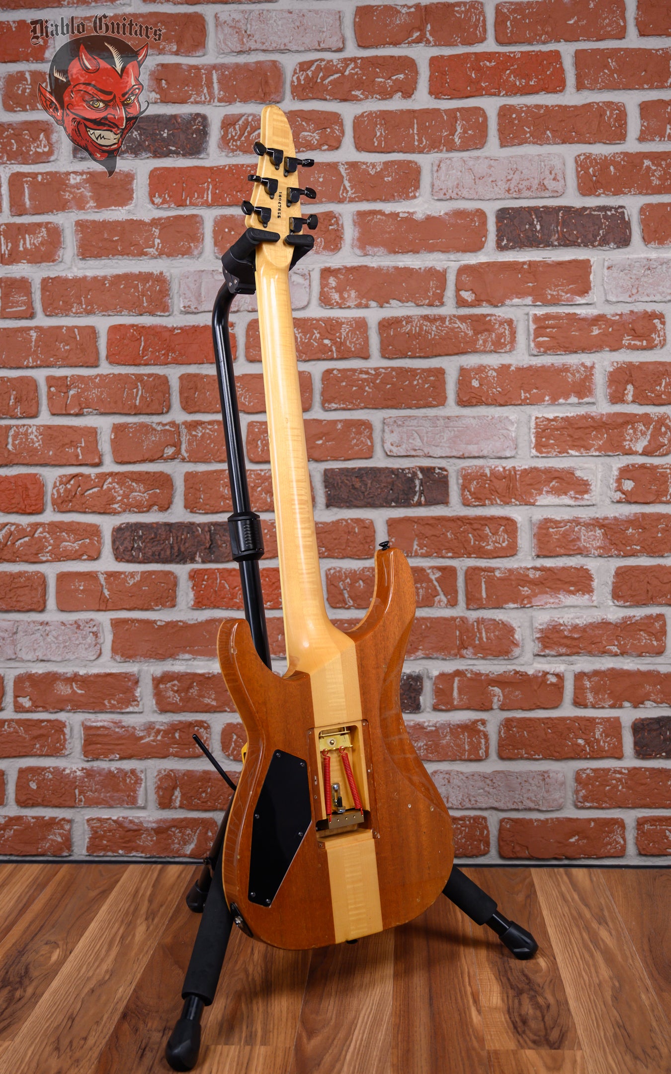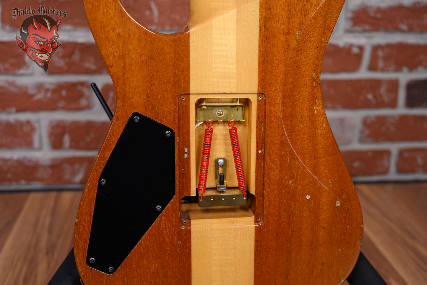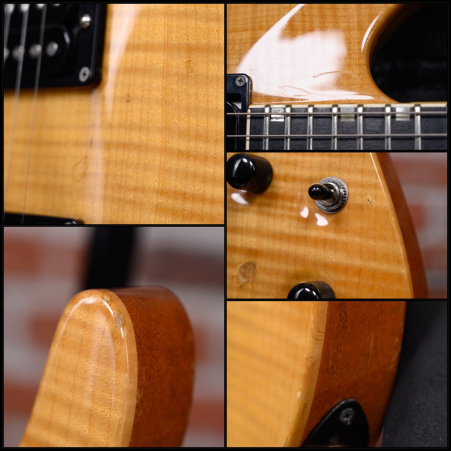 ESP Custom Horizon Flame Maple Top in Natural finish made in 1998 with Gator Hard Shell Case. This guitar features a solid mahogany body with a flamed maple top, 3-Piece maple neck-thru and bound ebony fingerboard with a bound, color matched flame maple overlay headstock. Equipped with a Seymour Duncan ‘59 in the neck position and a Seymour Duncan JB in the bridge position. Controlled by 1 volume, 1 tone pot and a 3-Way toggle switch. The 25.5" scale length neck has pearloid offset block inlays and black oval side markers with 24 extra jumbo frets on a 305mm radius with a thin U profile. The hardware is comprised of black gotoh sealed Die-Cast tuning machines with cloche heads, a Floyd Rose locking nut with gold Titanium bolts, a Floyd Rose original double locking tremolo with upgraded FU-Tone brass black, brass trem claw/screws, silent springs, gold titanium studs and hardware, and black knurled dome knobs.
