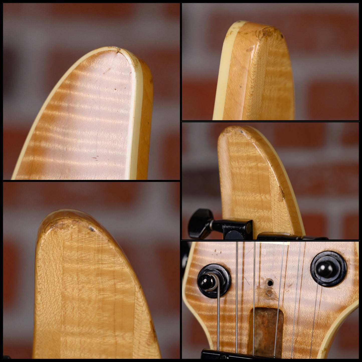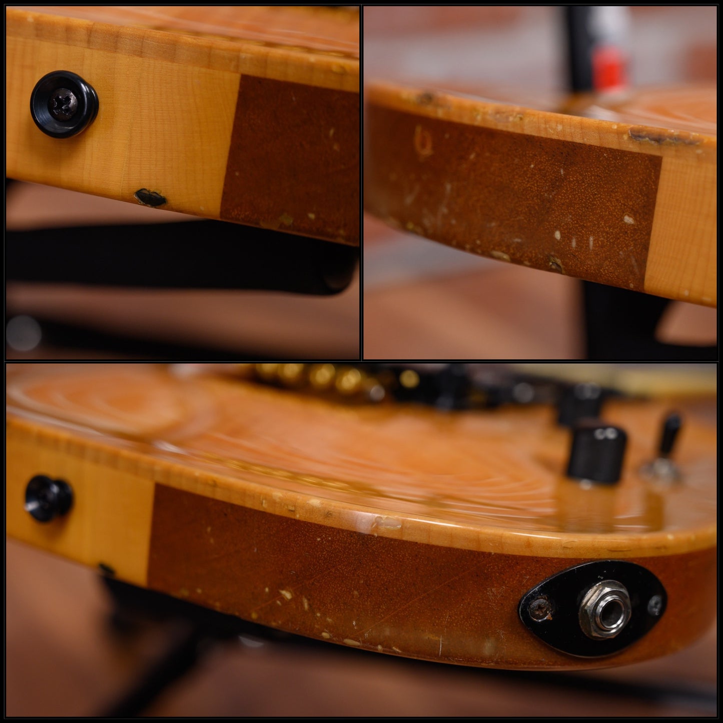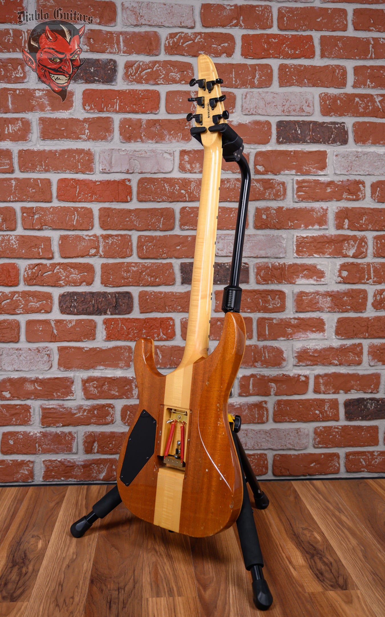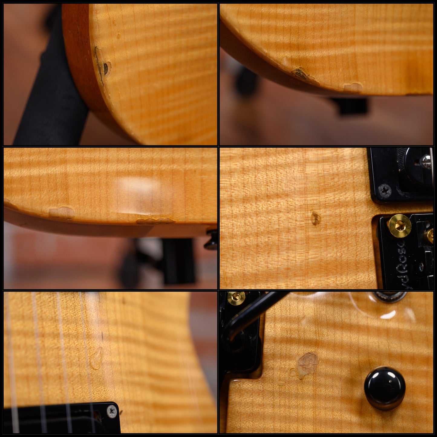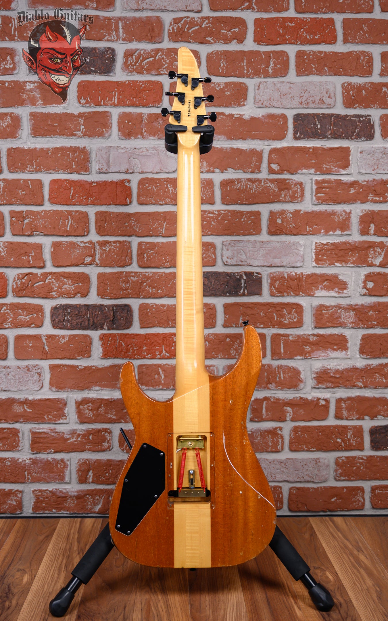 ESP Custom Horizon Flame Maple Top in Natural finish made in 1998 with Gator Hard Shell Case. This guitar features a solid mahogany body with a flamed maple top, 3-Piece maple neck-thru and bound ebony fingerboard with a bound, color matched flame maple overlay headstock. Equipped with a Seymour Duncan ‘59 in the neck position and a Seymour Duncan JB in the bridge position. Controlled by 1 volume, 1 tone pot and a 3-Way toggle switch. The 25.5" scale length neck has pearloid offset block inlays and black oval side markers with 24 extra jumbo frets on a 305mm radius with a thin U profile. The hardware is comprised of black gotoh sealed Die-Cast tuning machines with cloche heads, a Floyd Rose locking nut with gold Titanium bolts, a Floyd Rose original double locking tremolo with upgraded FU-Tone brass black, brass trem claw/screws, silent springs, gold titanium studs and hardware, and black knurled dome knobs.