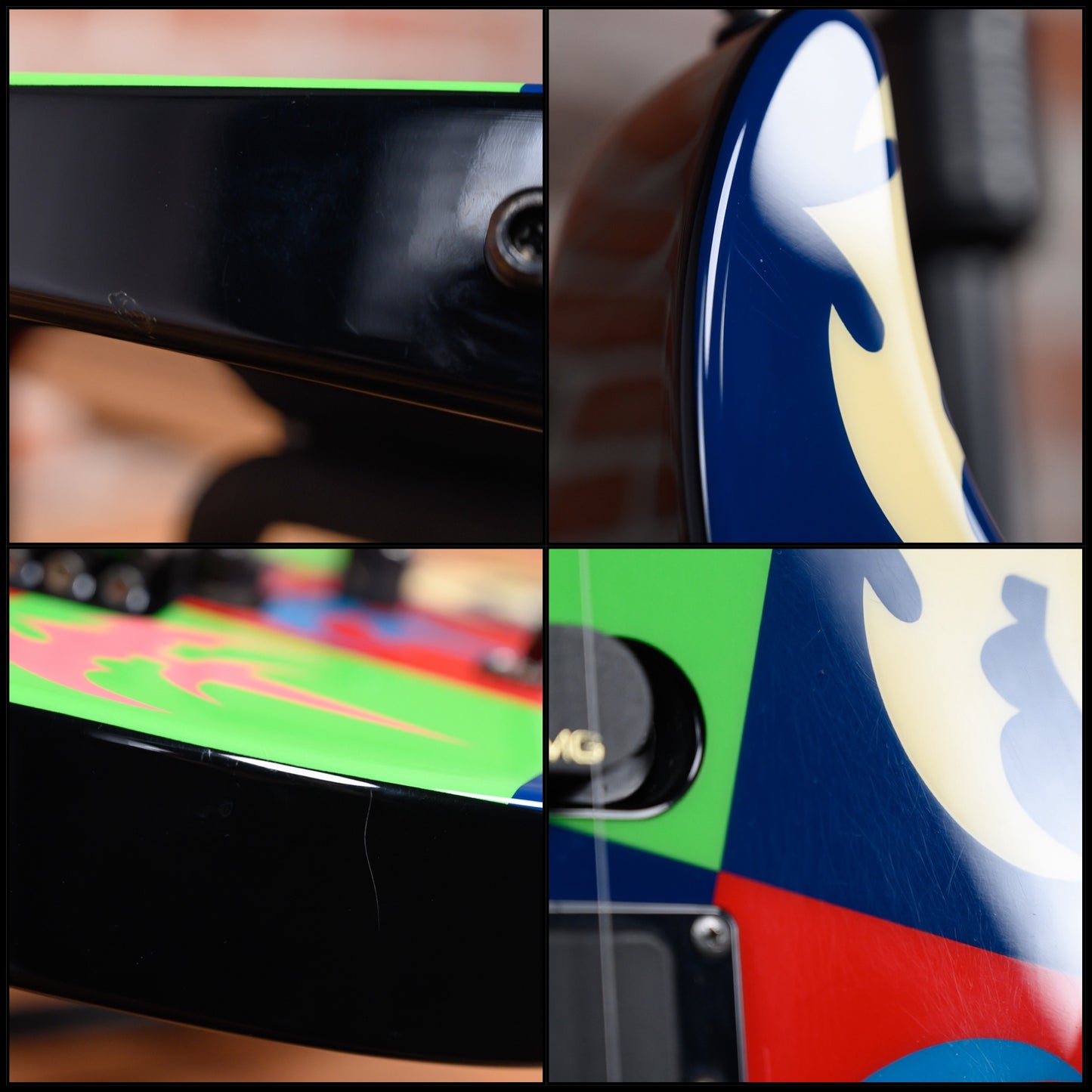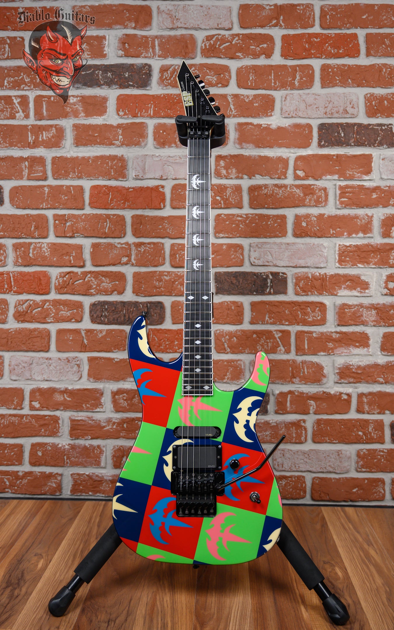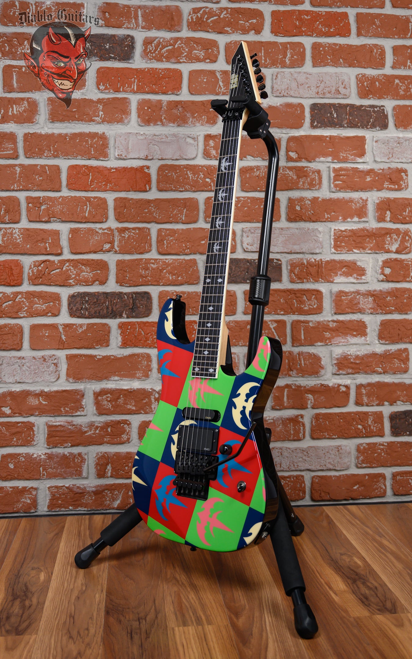 ESP Custom Shop Chris Degarmo Signature in Warhol Graphic finish made in 2005 with Original Hard Shell Case. This guitar features a solid alder body, 3-Piece maple neck and bound ebony fingerboard with a reverse, bound headstock. Equipped with a EMG SA in the middle position and a EMG 81 in the bridge position. Controlled by one master volume pot and a 3-Way toggle switch. The 25.5" scale length neck has mother of pearl triryche / diamond inlays and black side markers with extra jumbo frets on a 305mm radius with a extra thin U profile. The hardware is comprised of black Gotoh Sealed Die-Cast tuning machines with cloche heads, a Floyd Rose Locking nut, a Floyd Rose Original Double Locking Tremolo bridge and black knurled dome knob.
