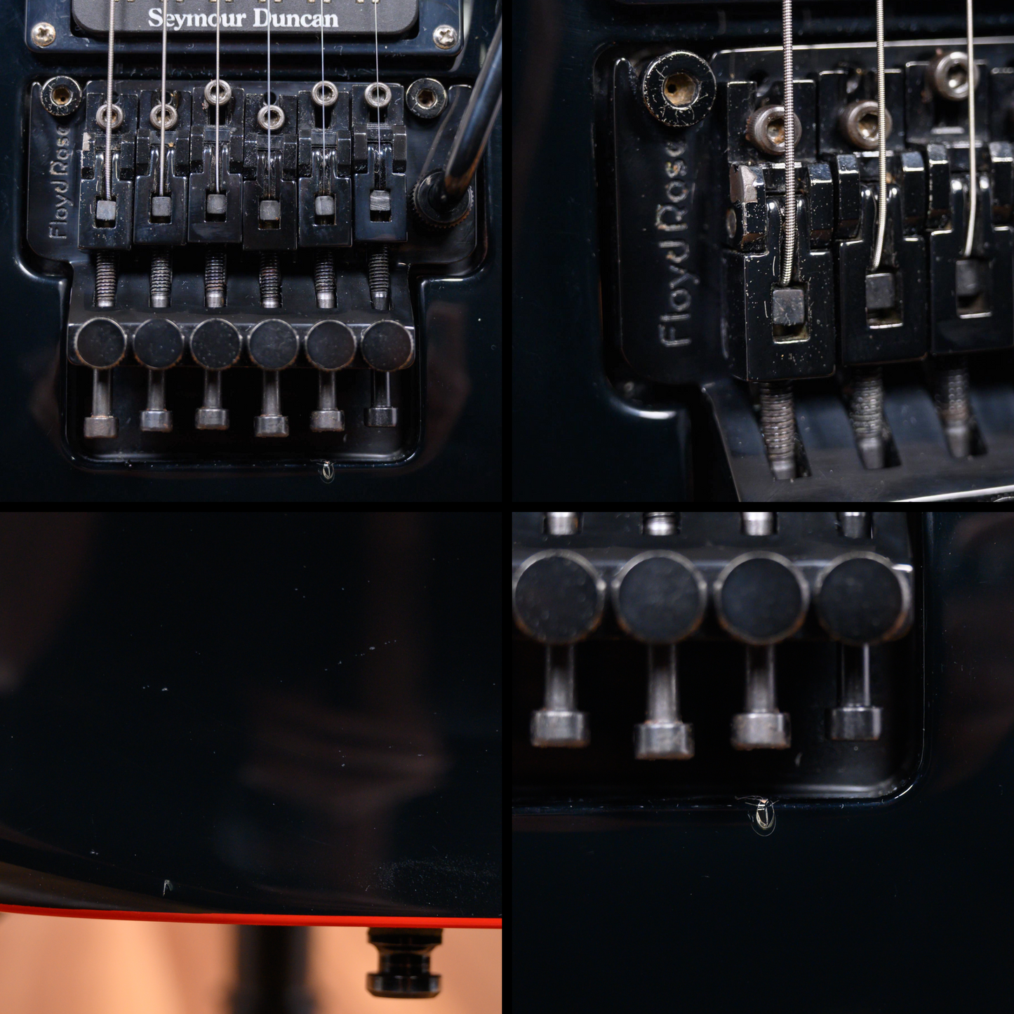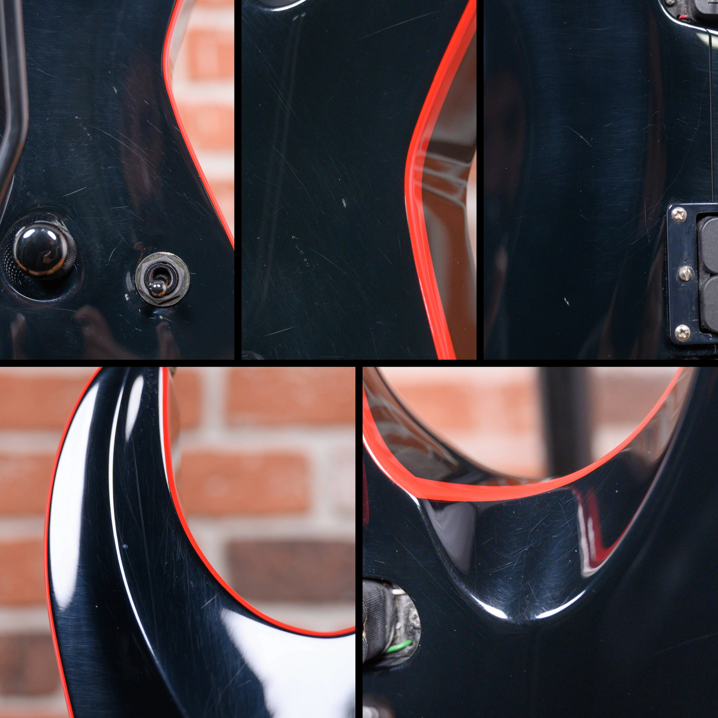 ESP Custom Shop Horizon One-Off in Black finish made in 2004 with Original Hard Shell Case. This guitar features a bound solid mahogany body, maple neck and bound ebony fingerboard with a bound headstock. Equipped with a Seymour Duncan SHR-1n in the neck position and a Seymour Duncan Parallel Axis PA-TB1N Original (neck model) in the bridge position. Controlled by one master volume pot, a 3-way toggle switch and a 2-way coil tap toggle switch. The 25.5" scale length neck has red ring w/ red LEDs offset dot inlays and black side markers with 24 jumbo frets on a 305mm radius with a Thin U profile. The hardware is comprised of black Gotoh sealed die-cast tuning machines with cloche heads, a Floyd Rose Locking nut, a Floyd Rose Original Double Locking Tremolo bridge with Schaller SureClaw and a black knurled dome knob.