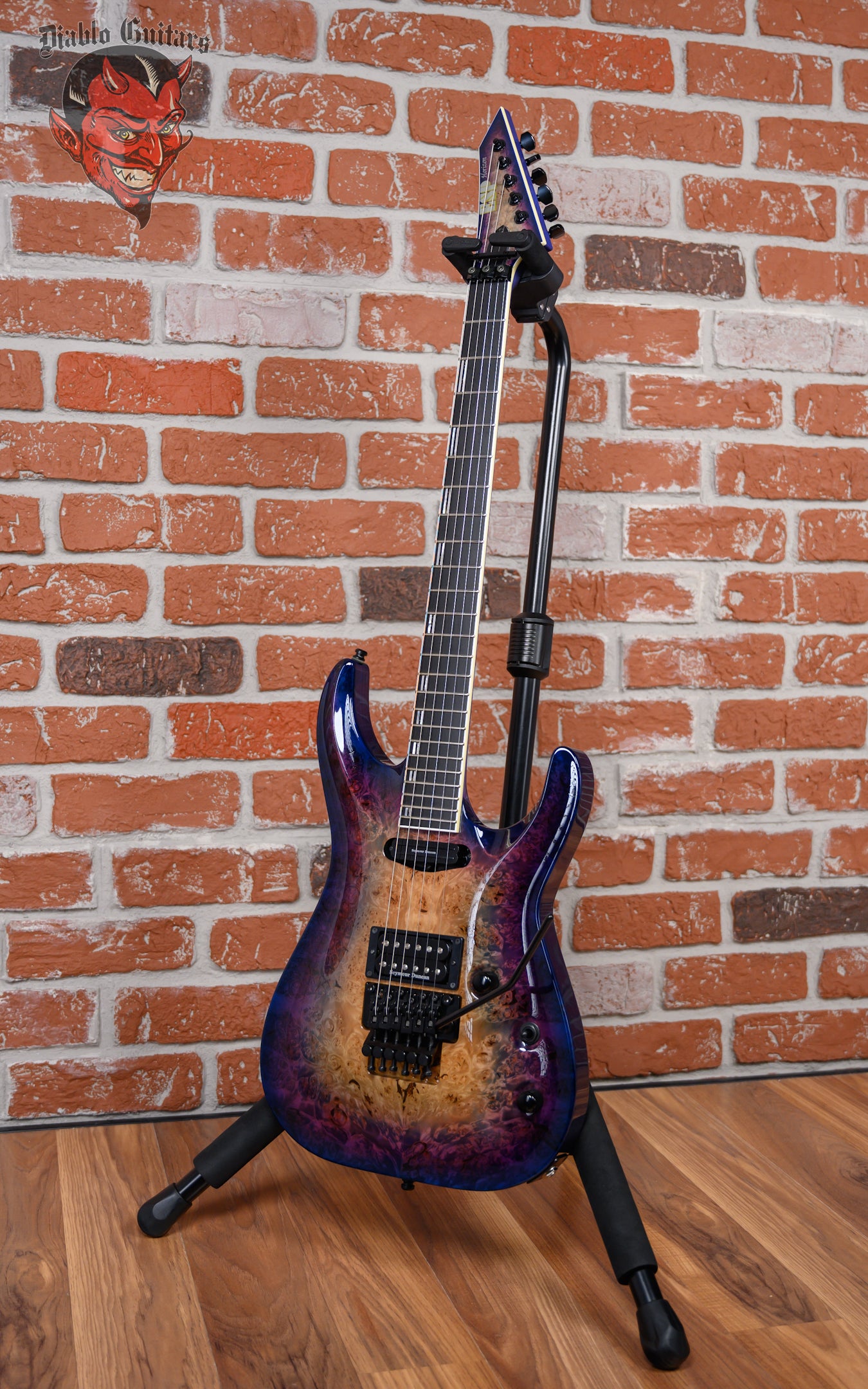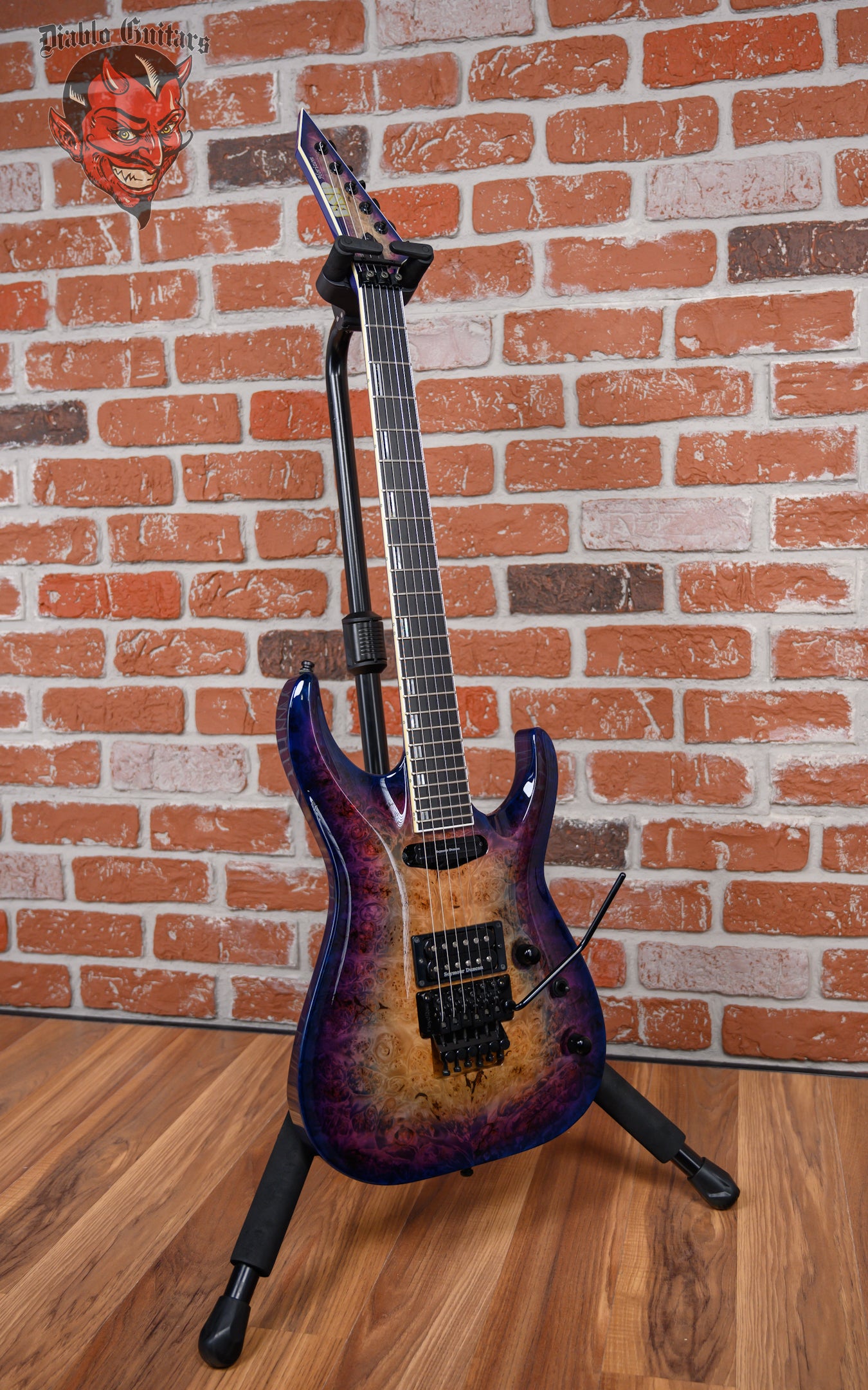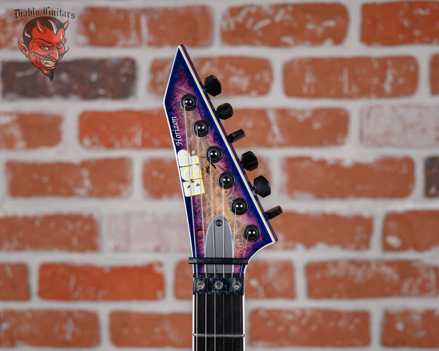 ESP Custom Shop Horizon Burl Poplar Top in Nebula Pink Purple Burst finish made in 2023 with Original Hard Shell Case. This guitar features a solid ash body with a burl poplar top, 3-Piece maple neck-thru and bound ebony fingerboard with a Reverse bound, color matched Burl Poplar overlay headstock. Equipped with a Seymour Duncan SHR-1N Hot Rails in the neck position and a Seymour Duncan TB6 Distortion in the bridge position. Controlled by 1 volume, 1 tone pot and a 3-Way toggle switch. The 25.5" scale length neck has mother of pearl /recon stone Multi-Stripe inlays and luminlay side markers with 24 extra jumbo frets on a 305mm radius with a thin U profile. The hardware is comprised of black Gotoh Magnum Lock-Trad tuning machines with cloche heads, a Floyd Rose Locking nut, a Floyd Rose Original Double Locking Tremolo bridge and black knurled dome knobs.