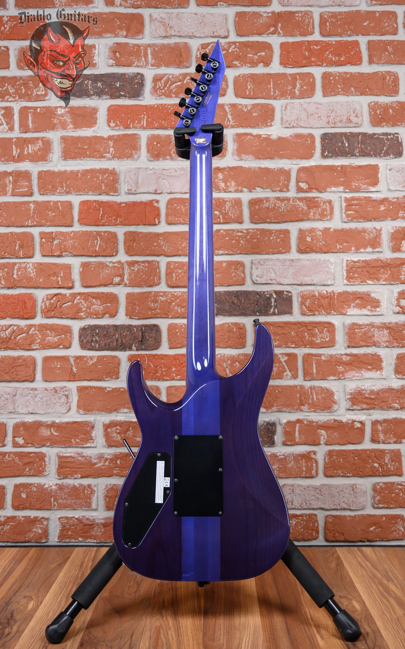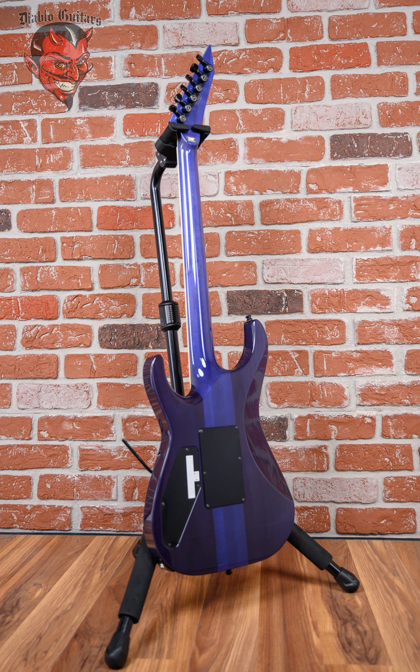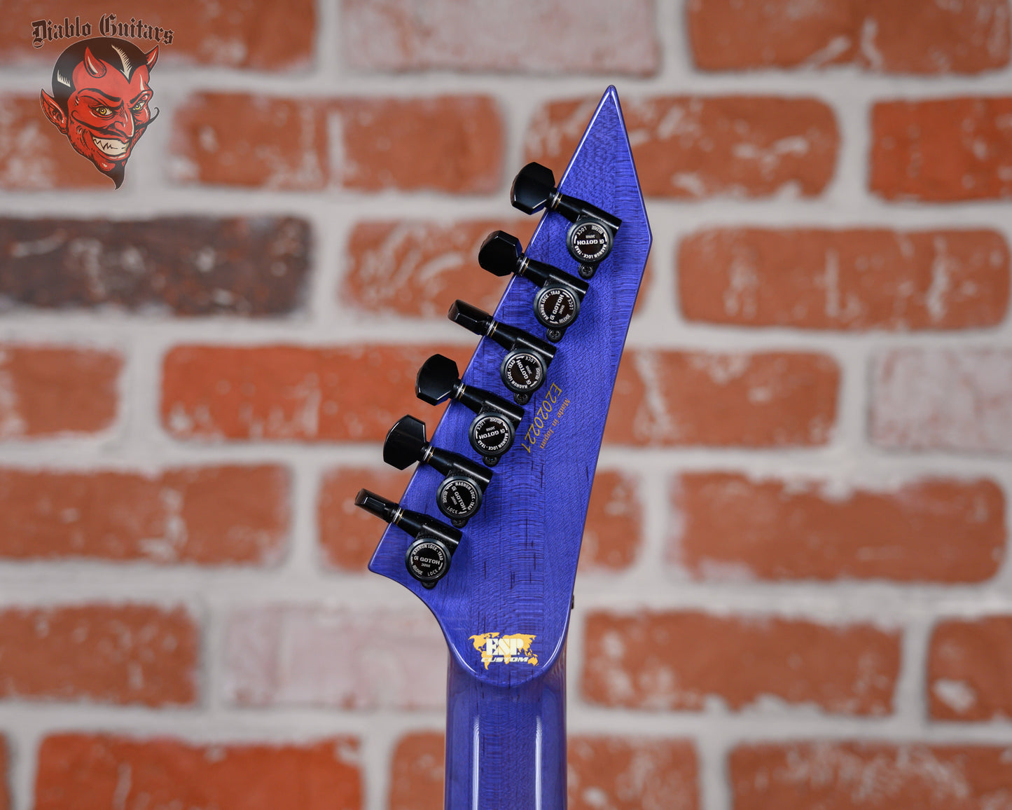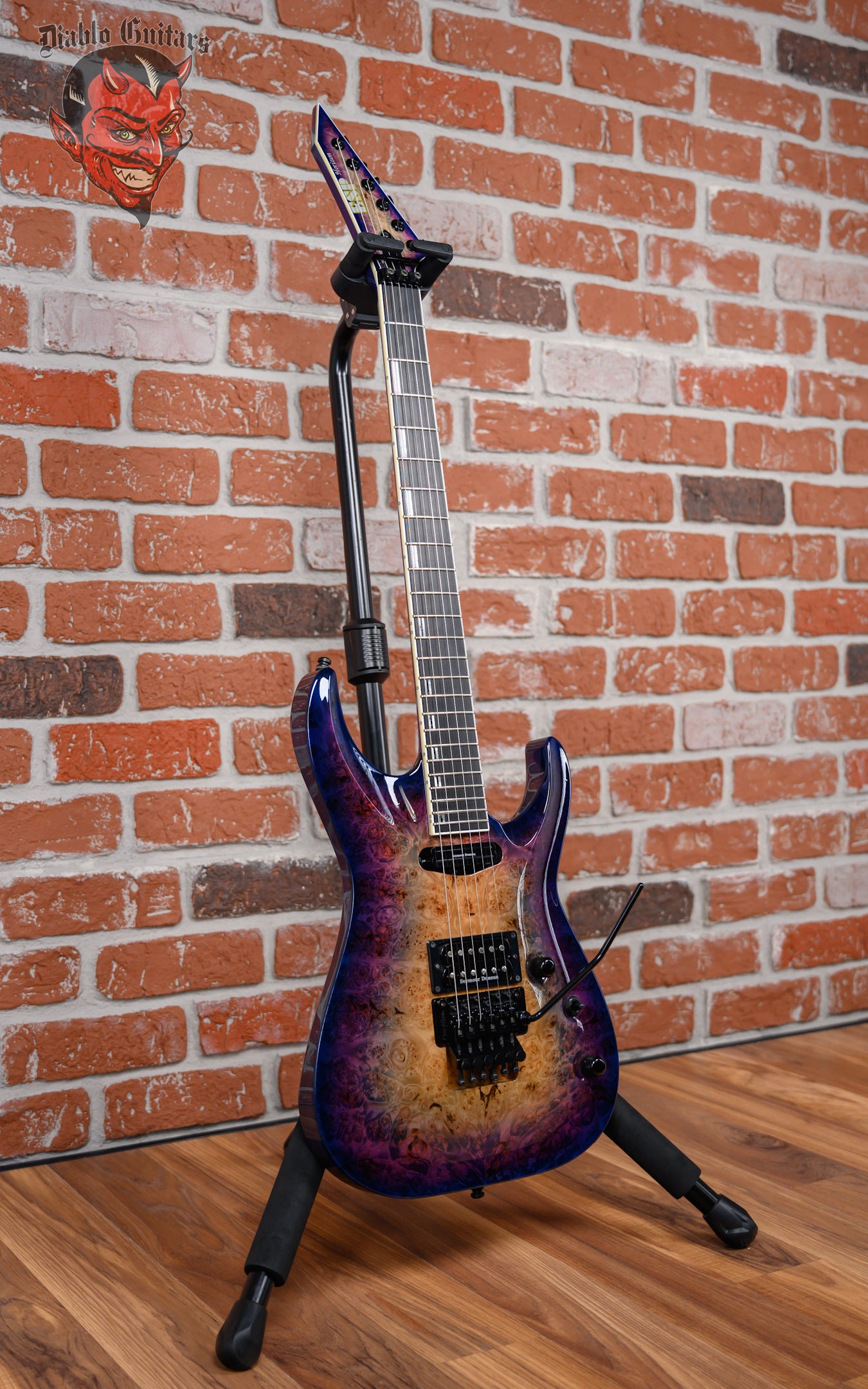 ESP Custom Shop Horizon Burl Poplar Top in Nebula Pink Purple Burst finish made in 2023 with Original Hard Shell Case. This guitar features a solid ash body with a burl poplar top, 3-Piece maple neck-thru and bound ebony fingerboard with a Reverse bound, color matched Burl Poplar overlay headstock. Equipped with a Seymour Duncan SHR-1N Hot Rails in the neck position and a Seymour Duncan TB6 Distortion in the bridge position. Controlled by 1 volume, 1 tone pot and a 3-Way toggle switch. The 25.5" scale length neck has mother of pearl /recon stone Multi-Stripe inlays and luminlay side markers with 24 extra jumbo frets on a 305mm radius with a thin U profile. The hardware is comprised of black Gotoh Magnum Lock-Trad tuning machines with cloche heads, a Floyd Rose Locking nut, a Floyd Rose Original Double Locking Tremolo bridge and black knurled dome knobs.