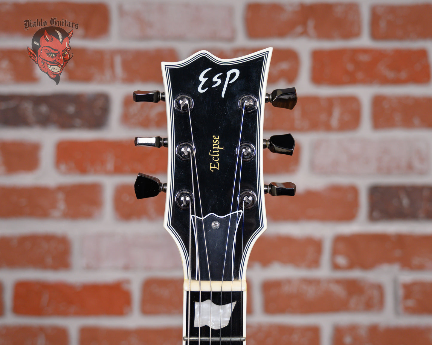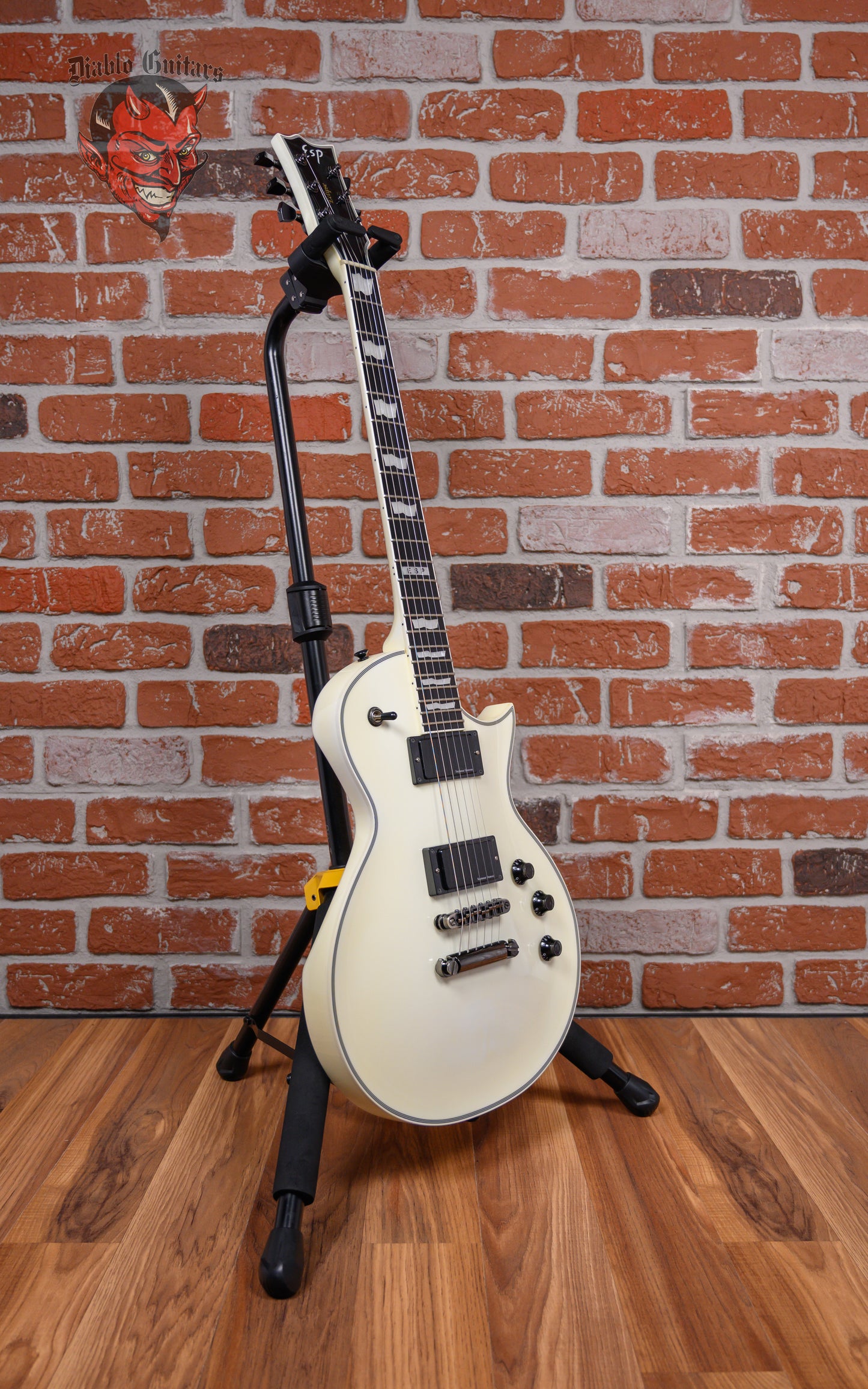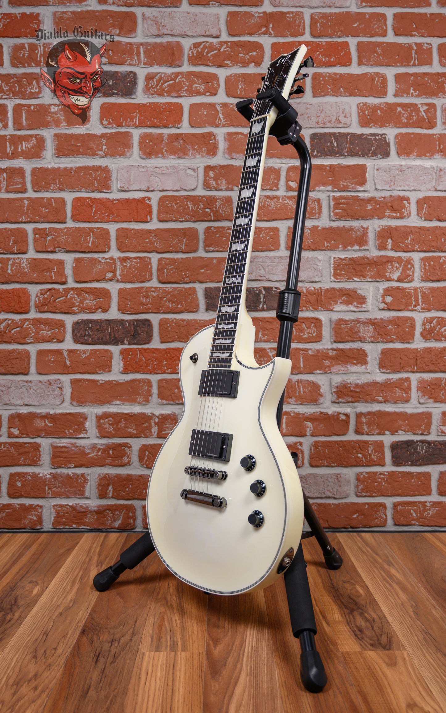 ESP Eclipse-II SW in Snow White finish made in 2010 with Hard Shell Case. This guitar features a solid mahogany body with a bound maple top, mahogany neck and bound ebony fingerboard with a bound headstock. Upgraded with a set of active Seymour Duncan Blackouts in the neck and bridge positions. Controlled by 2 volume pots, 1 tone pot and a 3-Way toggle switch. The 24.75" scale length neck has pearloid flag inlays and black side markers with 22 extra jumbo frets on a 305mm radius with a thin U profile. The hardware is comprised of cosmo black Gotoh sealed die-cast tuning machines with keystone heads, a bone nut, a Gotoh Tune-O-Matic bridge & tailpiece and black top hat knobs.