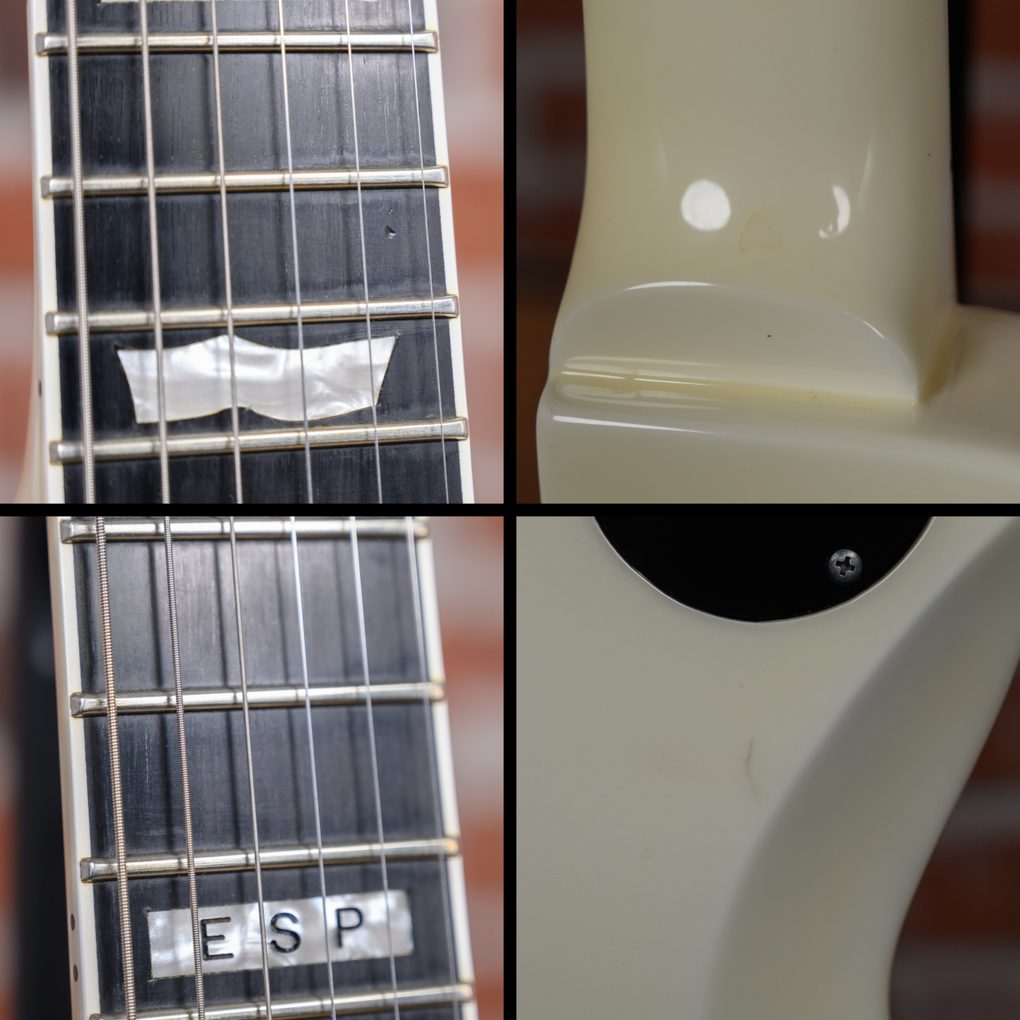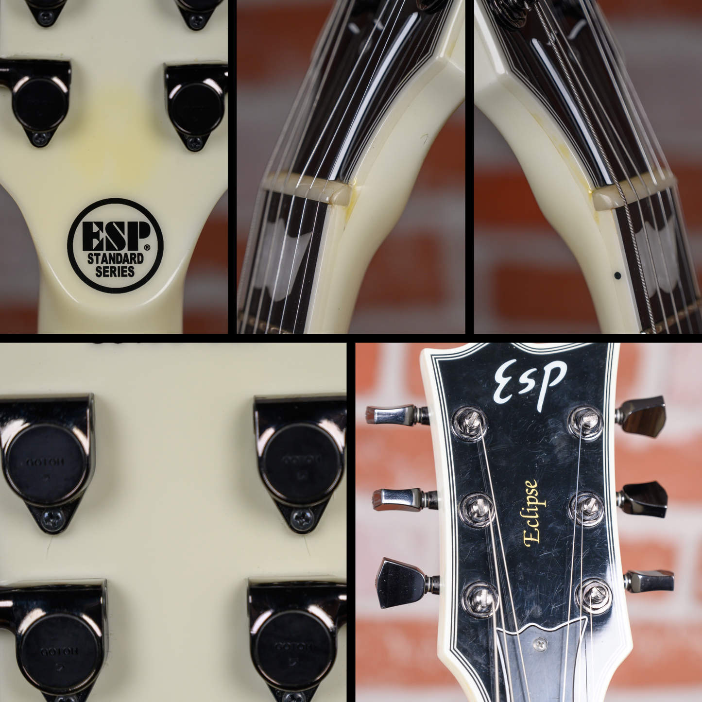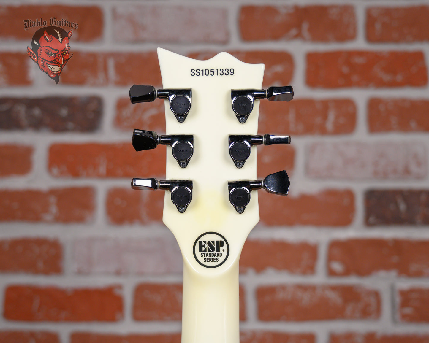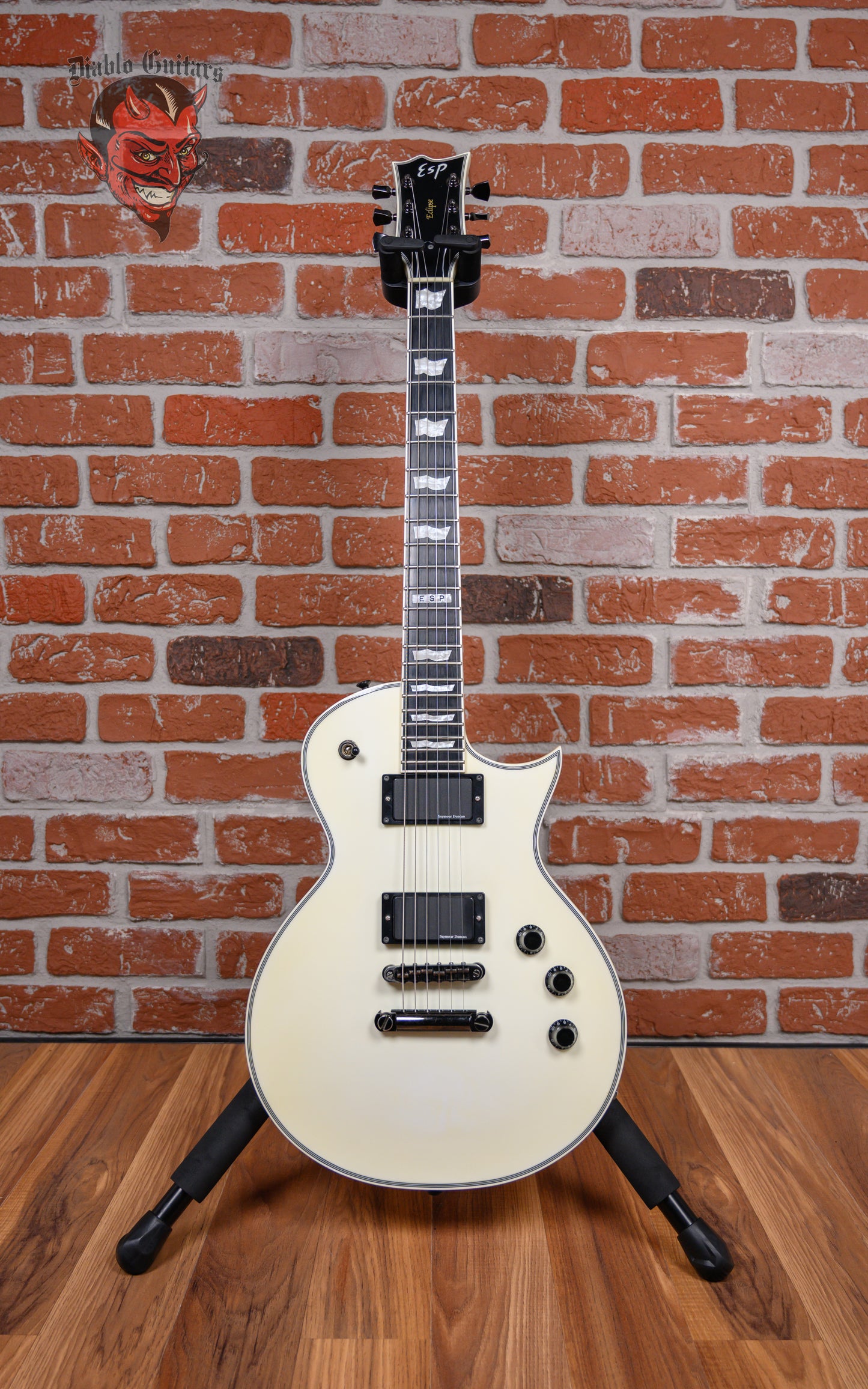 ESP Eclipse-II SW in Snow White finish made in 2010 with Hard Shell Case. This guitar features a solid mahogany body with a bound maple top, mahogany neck and bound ebony fingerboard with a bound headstock. Upgraded with a set of active Seymour Duncan Blackouts in the neck and bridge positions. Controlled by 2 volume pots, 1 tone pot and a 3-Way toggle switch. The 24.75" scale length neck has pearloid flag inlays and black side markers with 22 extra jumbo frets on a 305mm radius with a thin U profile. The hardware is comprised of cosmo black Gotoh sealed die-cast tuning machines with keystone heads, a bone nut, a Gotoh Tune-O-Matic bridge & tailpiece and black top hat knobs.