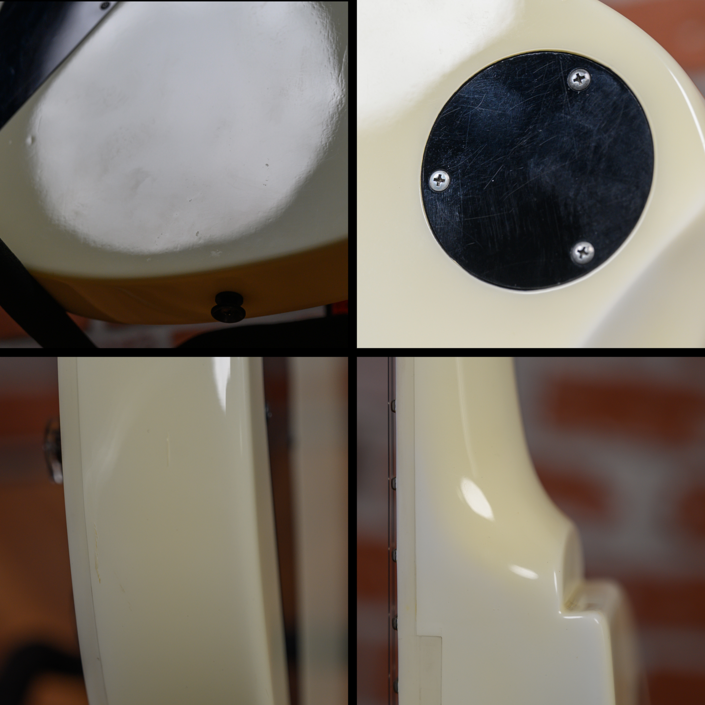 This guitar is in overall very good condition. There is some yellowish discoloration in the finish throughout the guitar, most notably on the back of the headstock and lower bout of the front of the body. There is belt rash on the back of the body along with some small dings. The fretboard has a few light dings in it. The plating on the bridge is slightly worn. (See Pics)