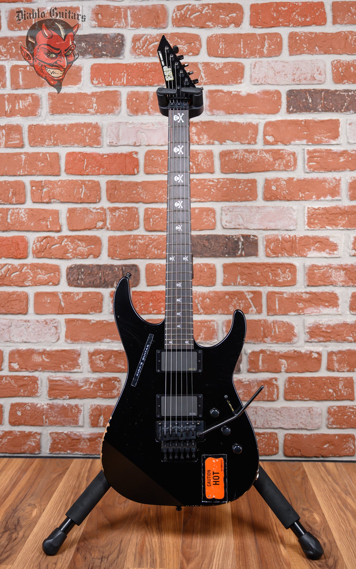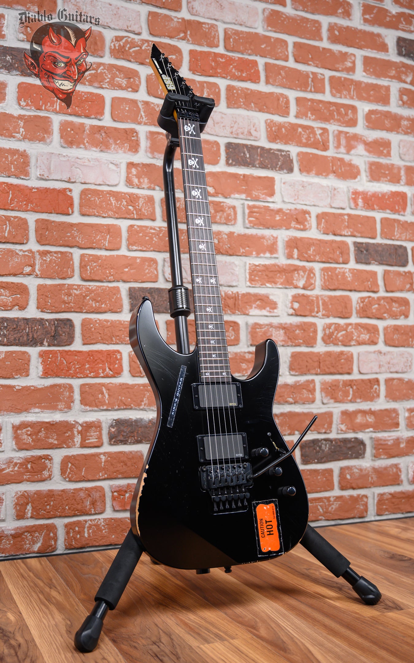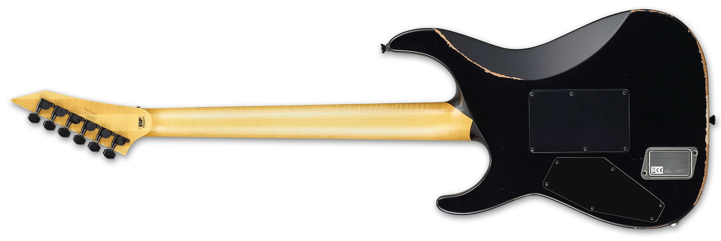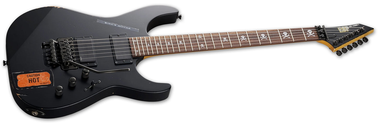 New ESP KH-2 Vintage in Distressed Black finish made in Japan in 2025 with Original Hard Shell Case. This guitar features a solid alder body, 3-piece maple neck-thru, rosewood fingerboard and reverse matching headstock. Equipped with a EMG 60A in the neck position and a EMG 81 in the bridge position. Controlled by 2-volume, 1-tone knob and a 3-way blade switch. The 25.5" scale length neck has skull & cross bone inlays and 24 extra jumbo frets on a 305mm radius with an extra thin-u neck profile. The hardware is comprised of black Gotoh tuning machines, an R2 Floyd Rose locking nut, a Floyd Rose original double locking tremolo bridge and knurled black dome knobs.