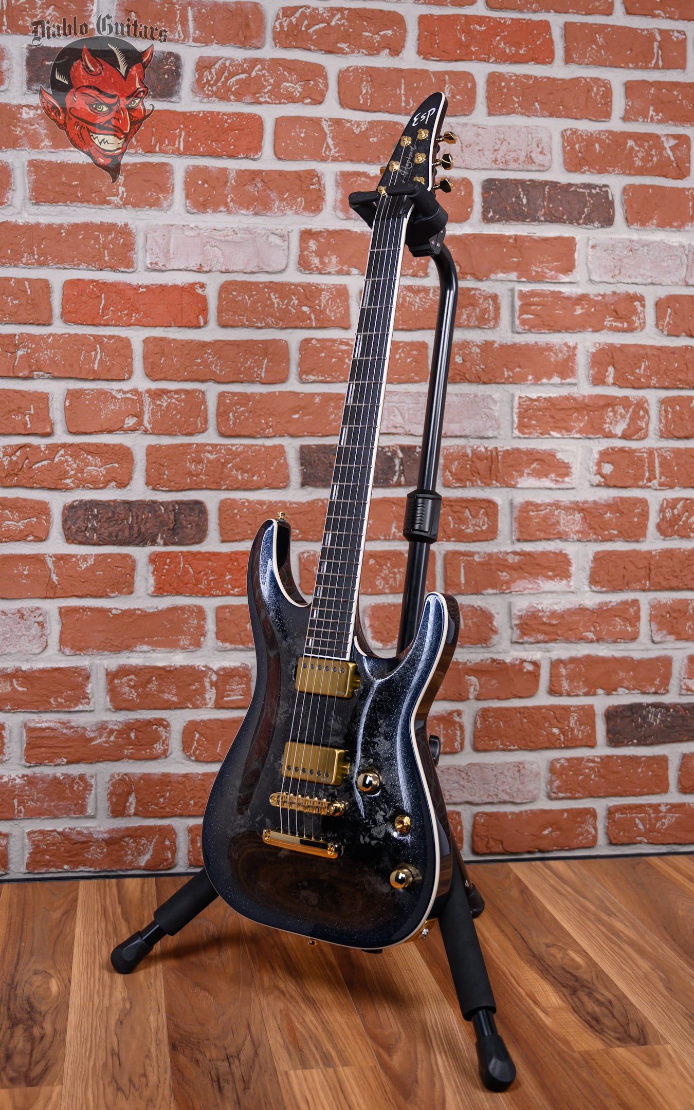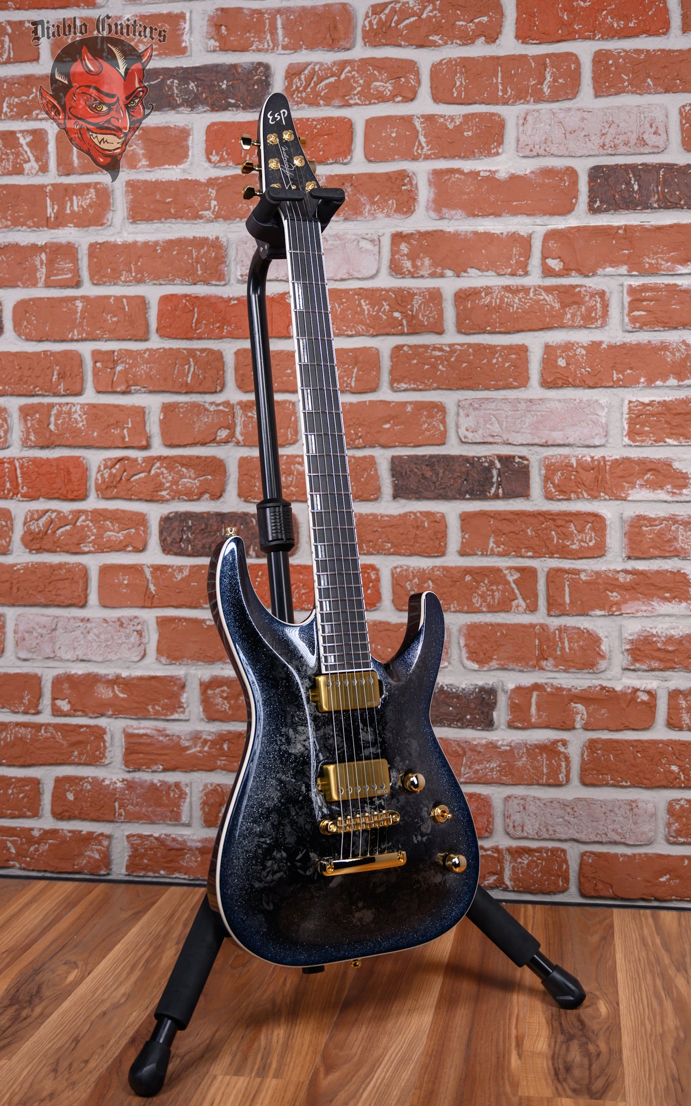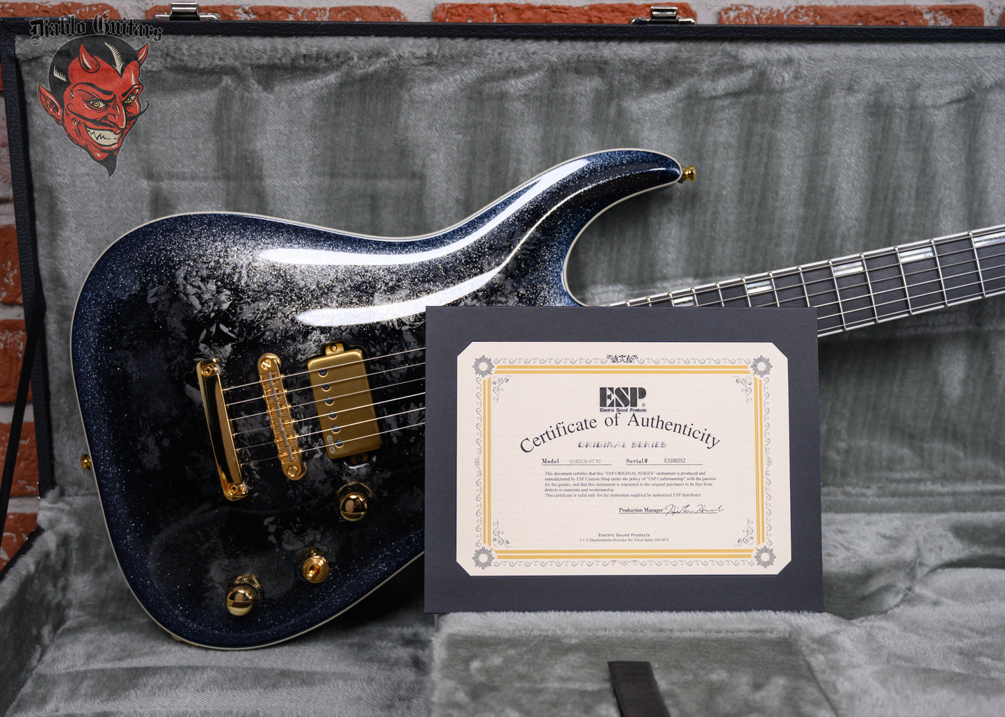 Regular price $6,030.00ESP Original Series Horizon PT/ NT in Obsidian finish made in 2025 with Original Hard Shell Case. This guitar features a Solid Mahogany body with a bound Maple top, 3-Piece Maple neck-thru and bound Ebony fingerboard with a Bound/Color Matched headstock. Equipped with a pair of brushed gold EMG Het Set humbuckers in the neck position and bridge position. Controlled by 1 Volume, 1 Tone pot and a 3-Way Toggle Switch. The 25.5" scale length neck has Mother of Pearl/ Recon Stone Double Stripes inlays and Luminlay side markers with 24 Extra Jumbo Stainless Steel frets on a 305mm radius with a Thin U profile. The hardware is comprised of Gold Gotoh Magnum Lock-Trad tuning machines with Cloche heads, a Carbon Fiber nut, a Tone Pros Tone Pros T3BT bridge with Gotoh 510FA tailpiece and Gold Knurled Dome knobs.