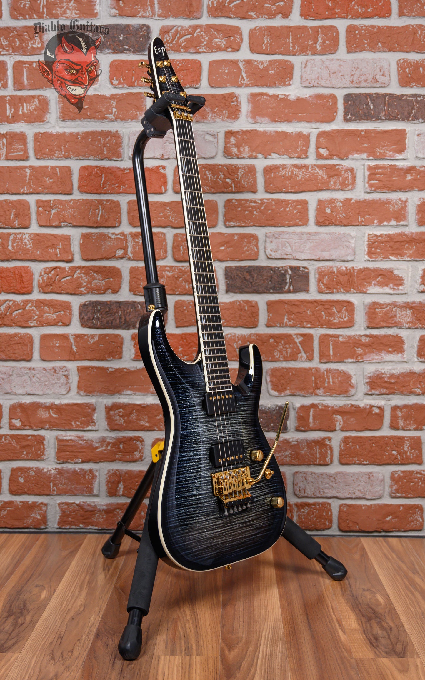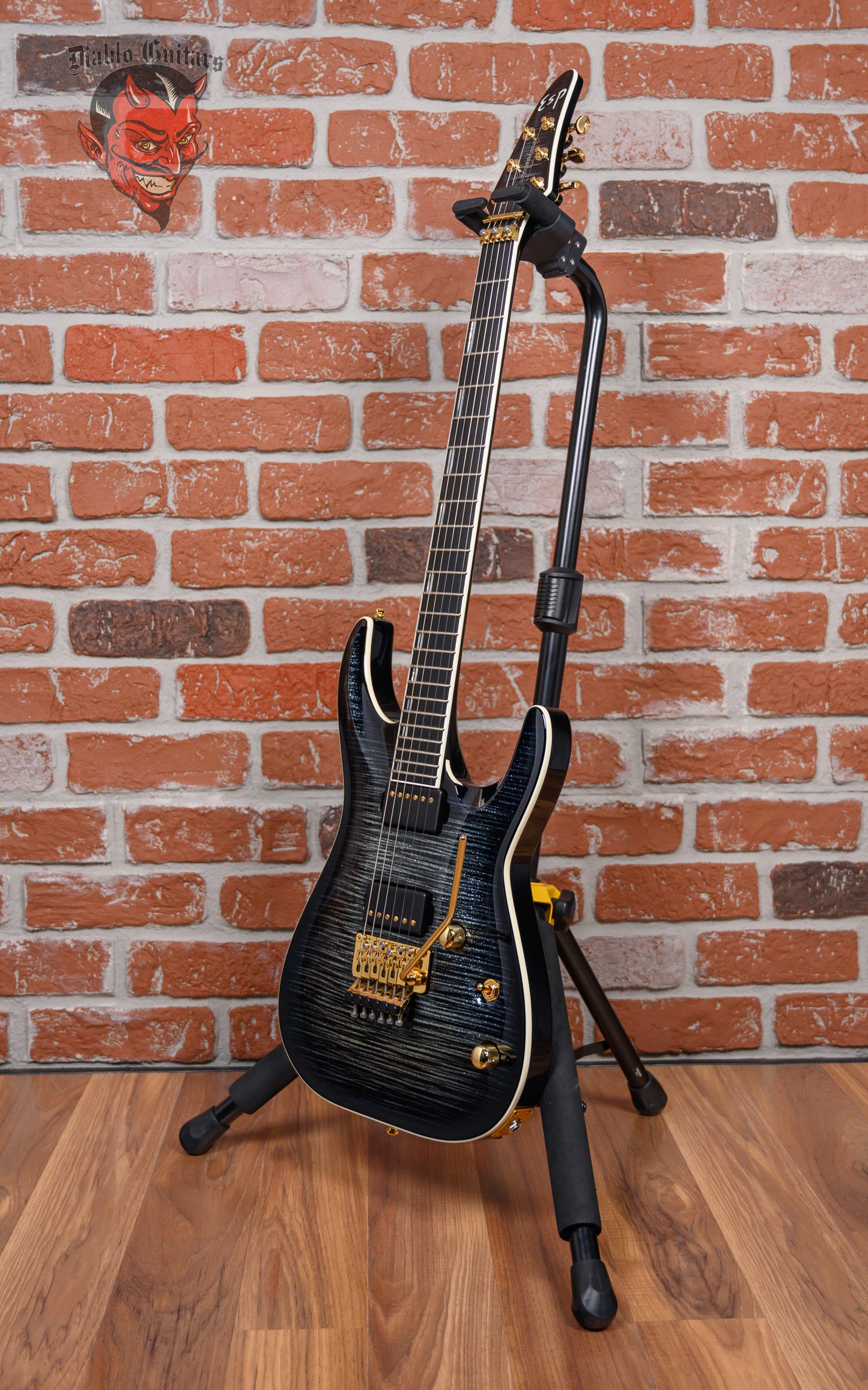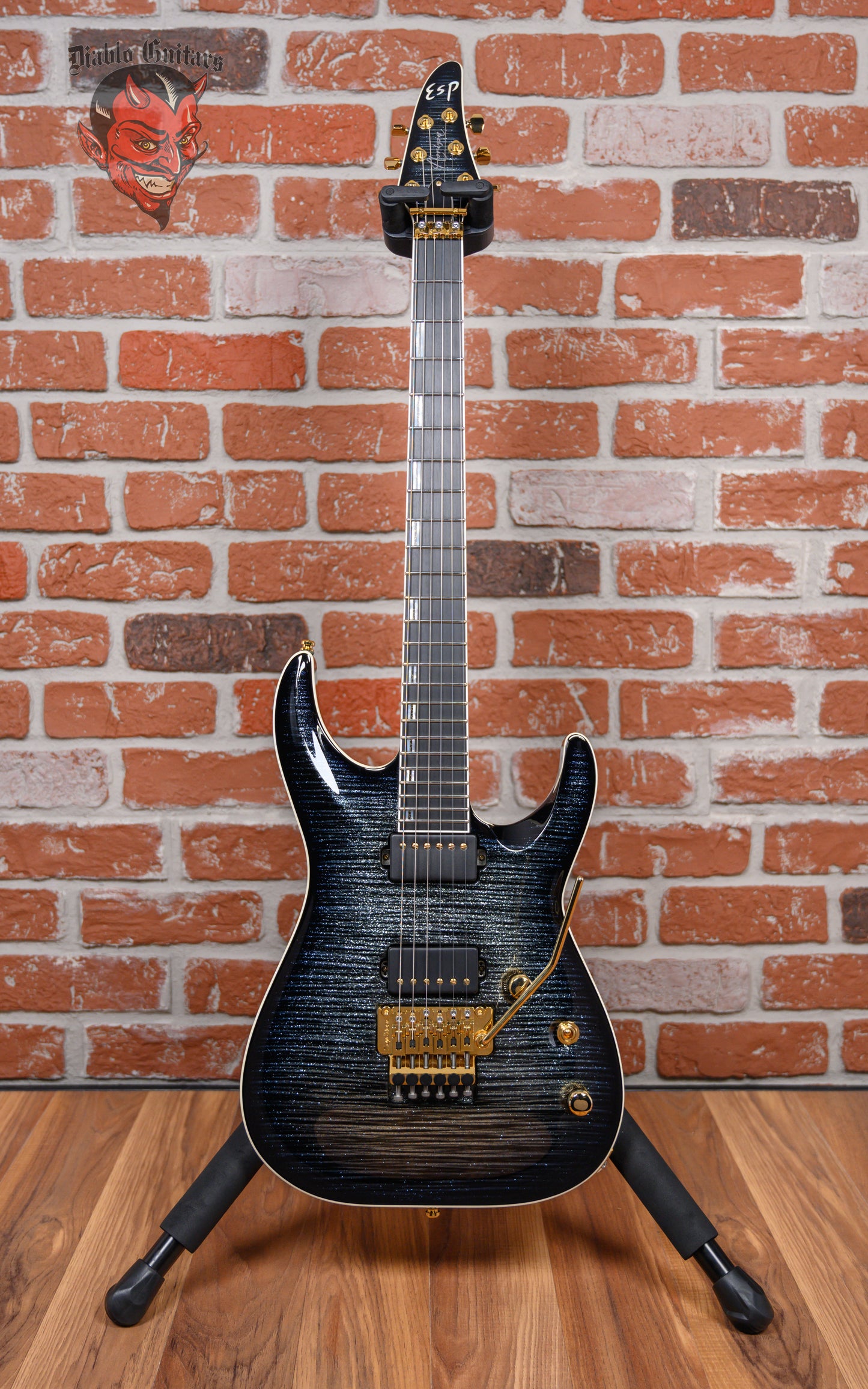 ESP Original Series Horizon-PT FR in Glitter Storm Black finish made in 2025 with Original Hard Shell Case. This guitar features a solid Honduran mahogany body with a bound maple top, 3-piece set-thru maple neck, a bound ebony fingerboard with a bound, color matched headstock. Equipped with a Seymour Duncan '59/Jazz Hybrid in the neck position and a Seymour Duncan JB/Custom S Hybrid in the bridge position. Controlled by 1 volume pot, 1 tone pot and a 3-way toggle switch. The 25.5" scale length neck has mother of pearl/recon stone offset double stripe inlays, Luminlay side markers with 24 Jescar jumbo frets on a 305mm radius with a thin U profile. The hardware is comprised of gold Gotoh Magnum Lock-Trad tuning machines with cloche heads, a Floyd Rose locking nut with stainless steel bolts, a Floyd Rose Original Double Locking Tremolo bridge with stainless steel bolts and gold knurled dome knobs.