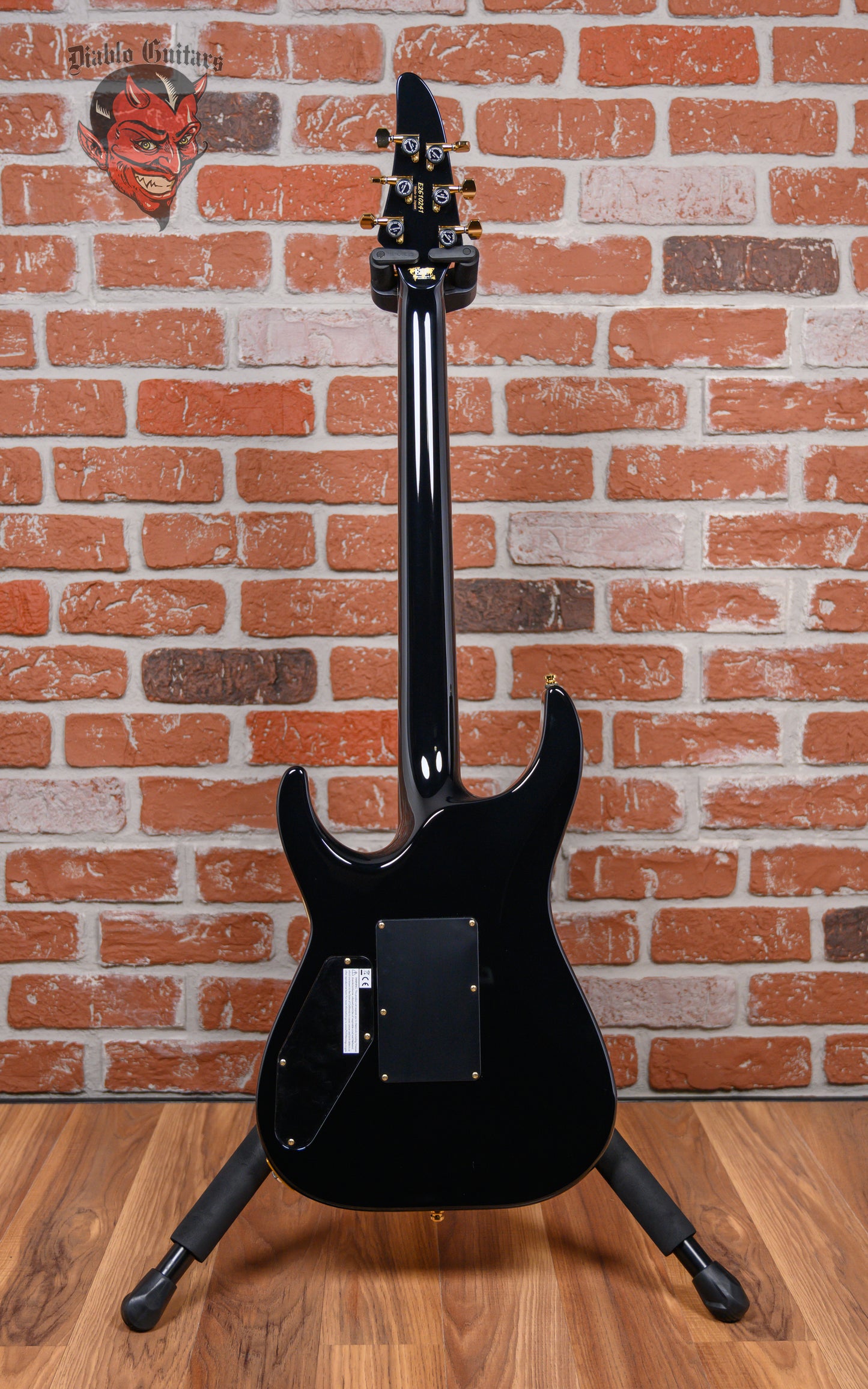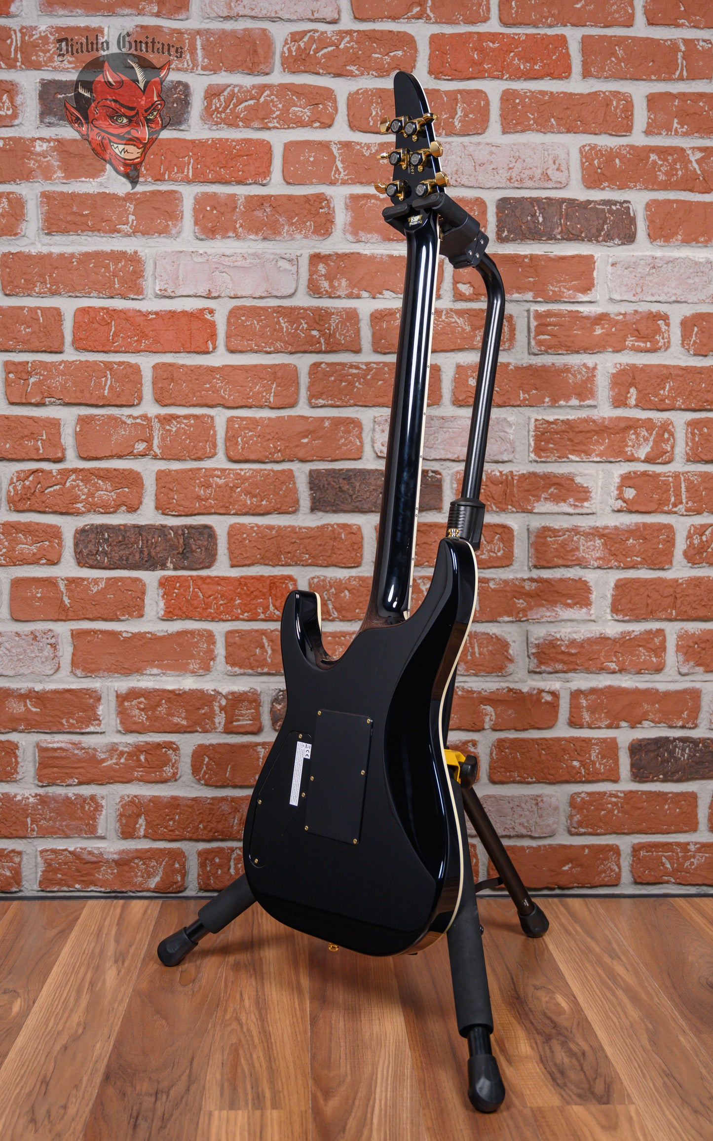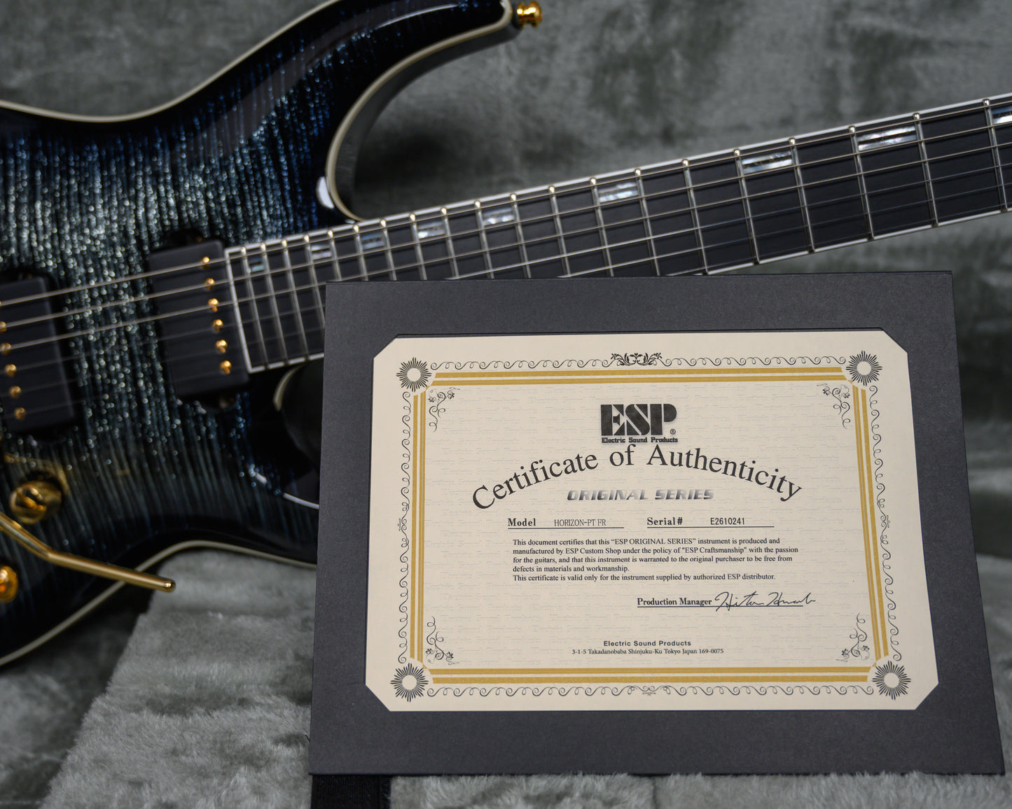 ESP Original Series Horizon-PT FR in Glitter Storm Black finish made in 2025 with Original Hard Shell Case. This guitar features a solid Honduran mahogany body with a bound maple top, 3-piece set-thru maple neck, a bound ebony fingerboard with a bound, color matched headstock. Equipped with a Seymour Duncan '59/Jazz Hybrid in the neck position and a Seymour Duncan JB/Custom S Hybrid in the bridge position. Controlled by 1 volume pot, 1 tone pot and a 3-way toggle switch. The 25.5" scale length neck has mother of pearl/recon stone offset double stripe inlays, Luminlay side markers with 24 Jescar jumbo frets on a 305mm radius with a thin U profile. The hardware is comprised of gold Gotoh Magnum Lock-Trad tuning machines with cloche heads, a Floyd Rose locking nut with stainless steel bolts, a Floyd Rose Original Double Locking Tremolo bridge with stainless steel bolts and gold knurled dome knobs.