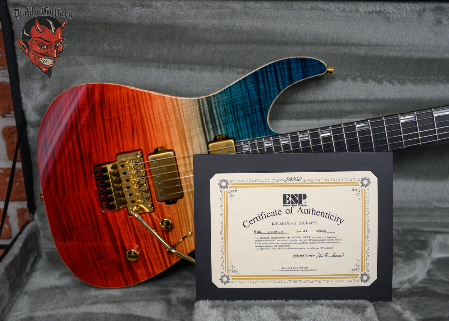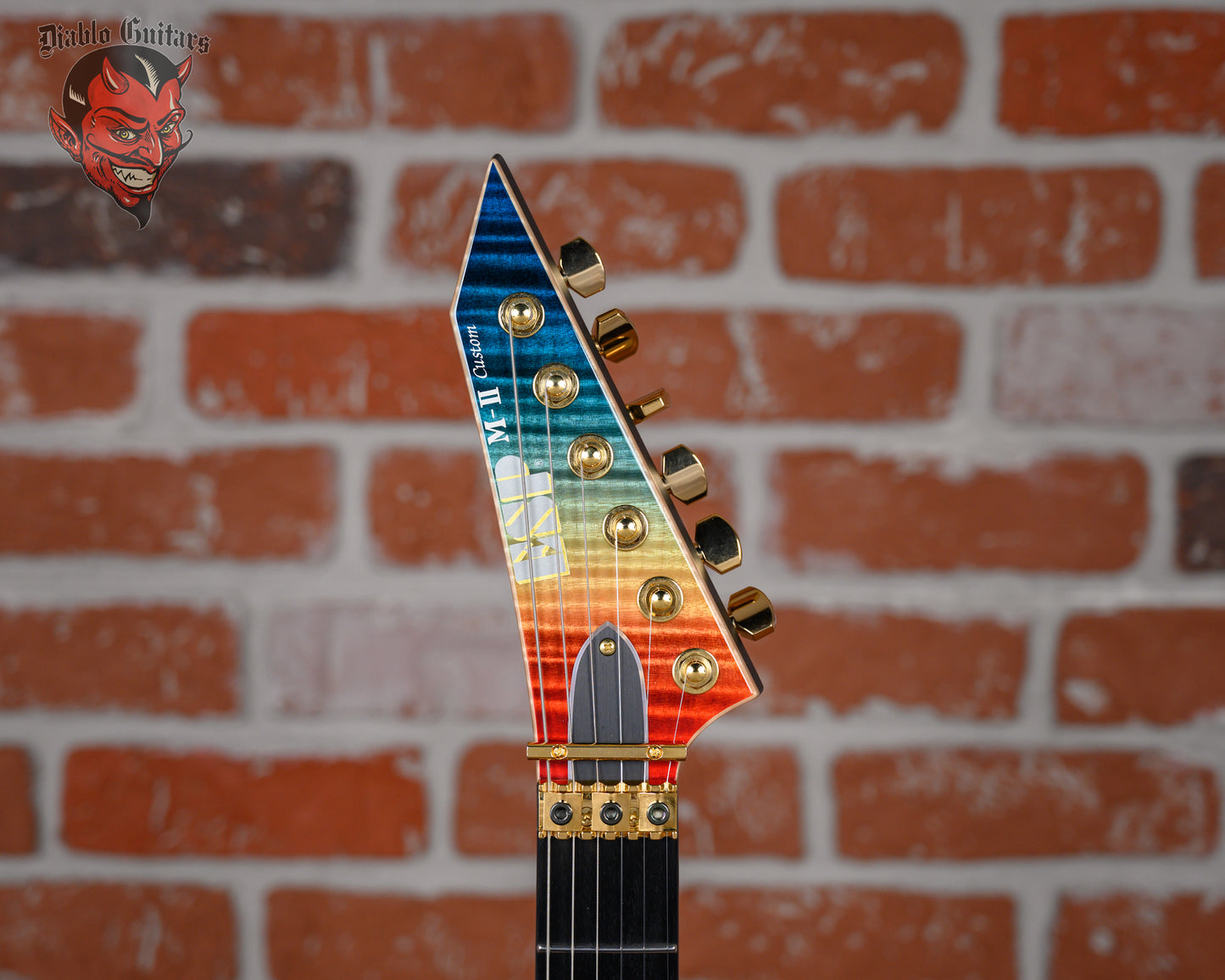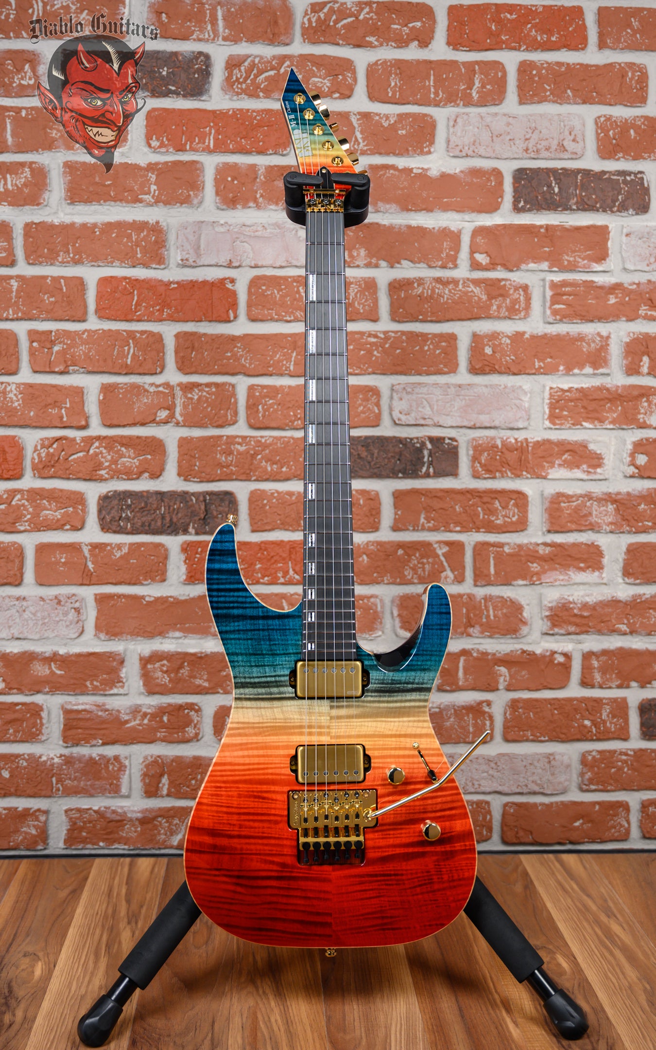 ESP Original Series M-II Custom FM FR in Blue Red Gradation Finish made in 2025 with Original Hard Shell Case. This guitar features a solid alder body, natural bound flame maple top, 3-Piece maple neck-thru and bound ebony fingerboard with a reverse, natural bound and color matched flame maple overlay headstock. Equipped with a pair of Brushed gold EMG 66TW in the neck position and a EMG 57TW in the bridge position. Controlled by 1 volume with push/pull coil tap, 1 tone pot with push/pull coil tap and a 3-Way blade switch. The 25.5" scale length neck has mother of pearl/ recon stone offset double stripe inlays, luminlay side markers with 24 extra jumbo frets on a 305mm radius with a thin U profile. The hardware is comprised of gold Gotoh magnum Lock-Trad tuning machines with cloche heads, a Floyd Rose locking nut, a Floyd Rose original double locking tremolo bridge and gold knurled Dome knobs.
