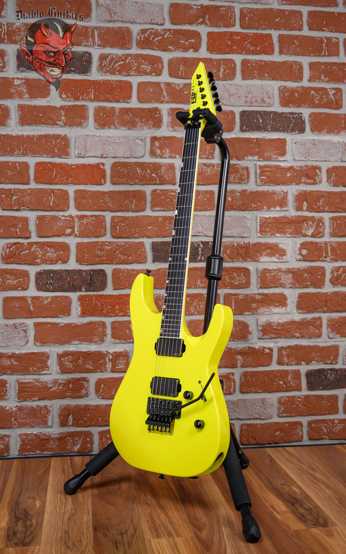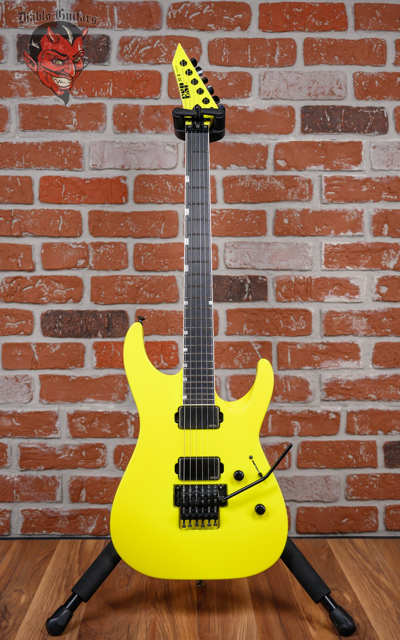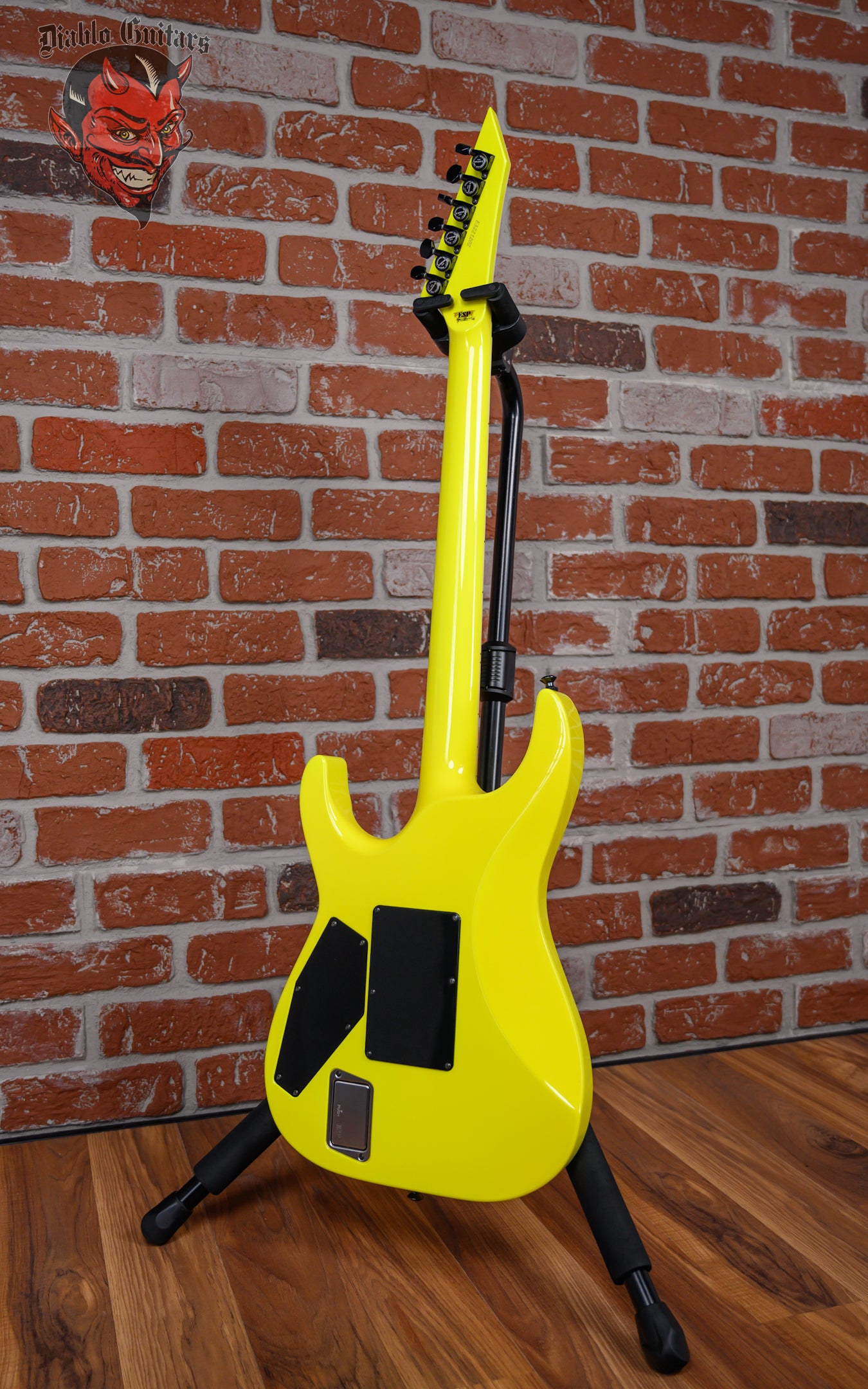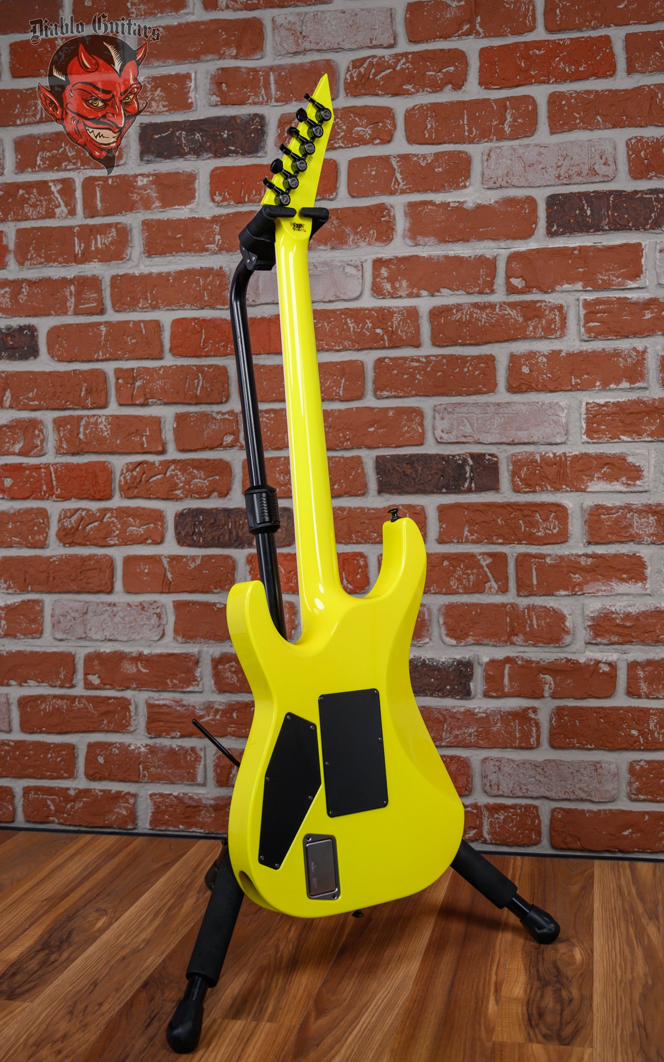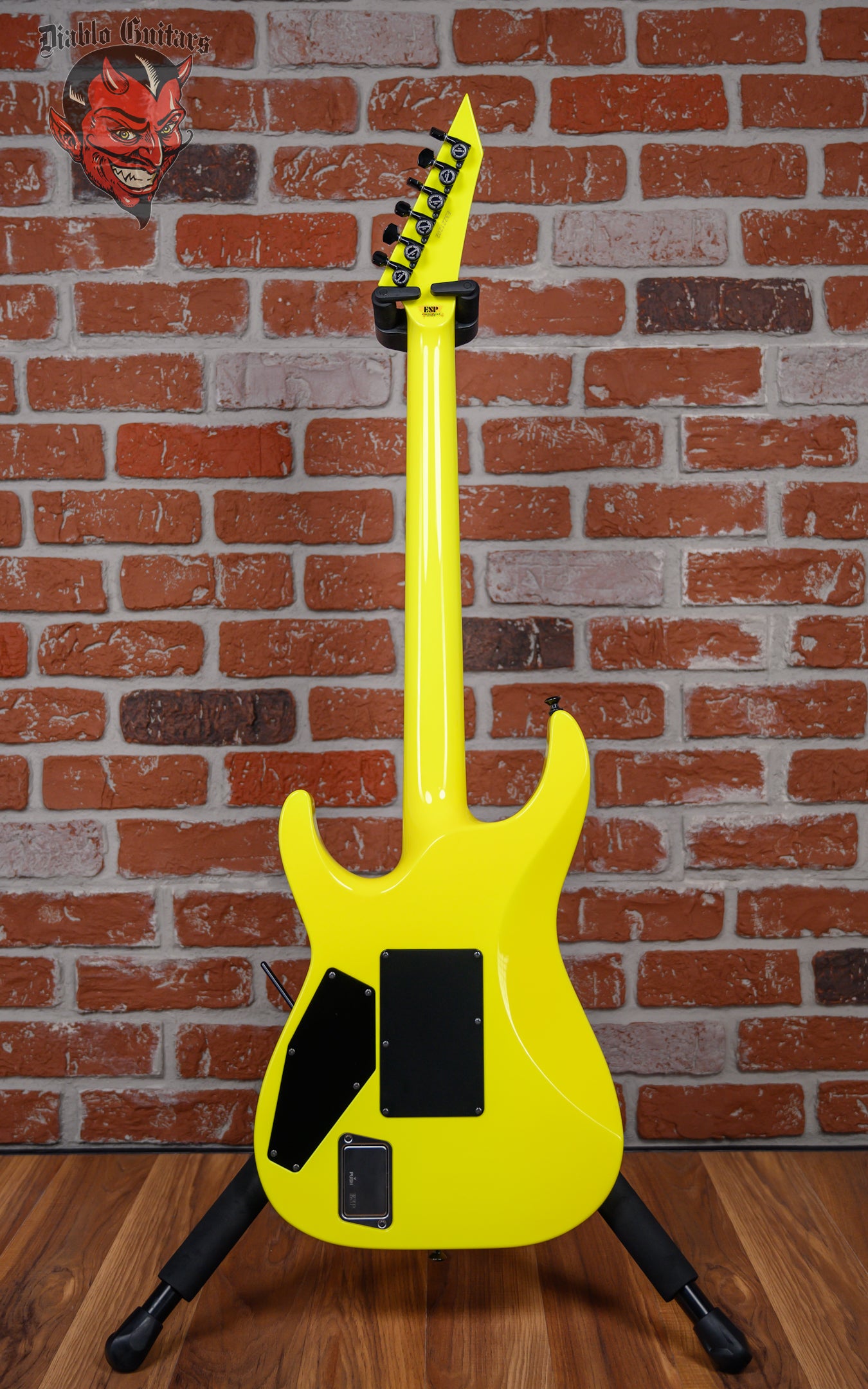 ESP Original Series M-II Custom in Neon Yellow finish made in 2020 with Original Hard Shell Case. This guitar features a solid alder body, 3-Piece maple neck-thru and bound ebony fingerboard with a reverse, bound and color matched headstock. Equipped with a EMG 85TW in the neck position and a EMG 81TW in the bridge position. Controlled by 1 volume, 1 tone pot and a 3-Way blade switch. The 25.5" scale length neck has pearloid offset blocks inlays, black side markers with 24 extra jumbo frets on a 305mm radius with a thin U profile. The hardware is comprised of black gotoh magnum Lock-Trad tuning machines with cloche heads, a Floyd Rose locking nut, a Floyd Rose original double locking tremolo bridge and black knurled dome knobs.