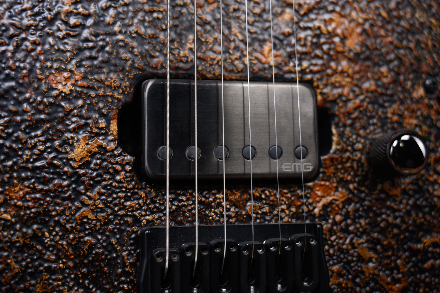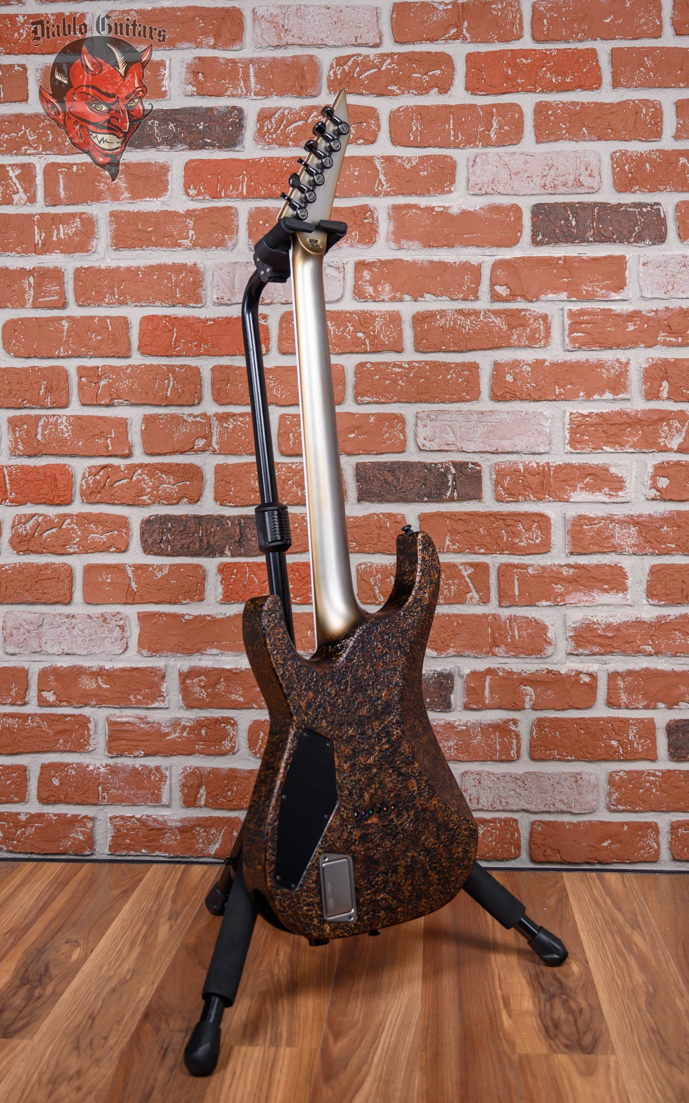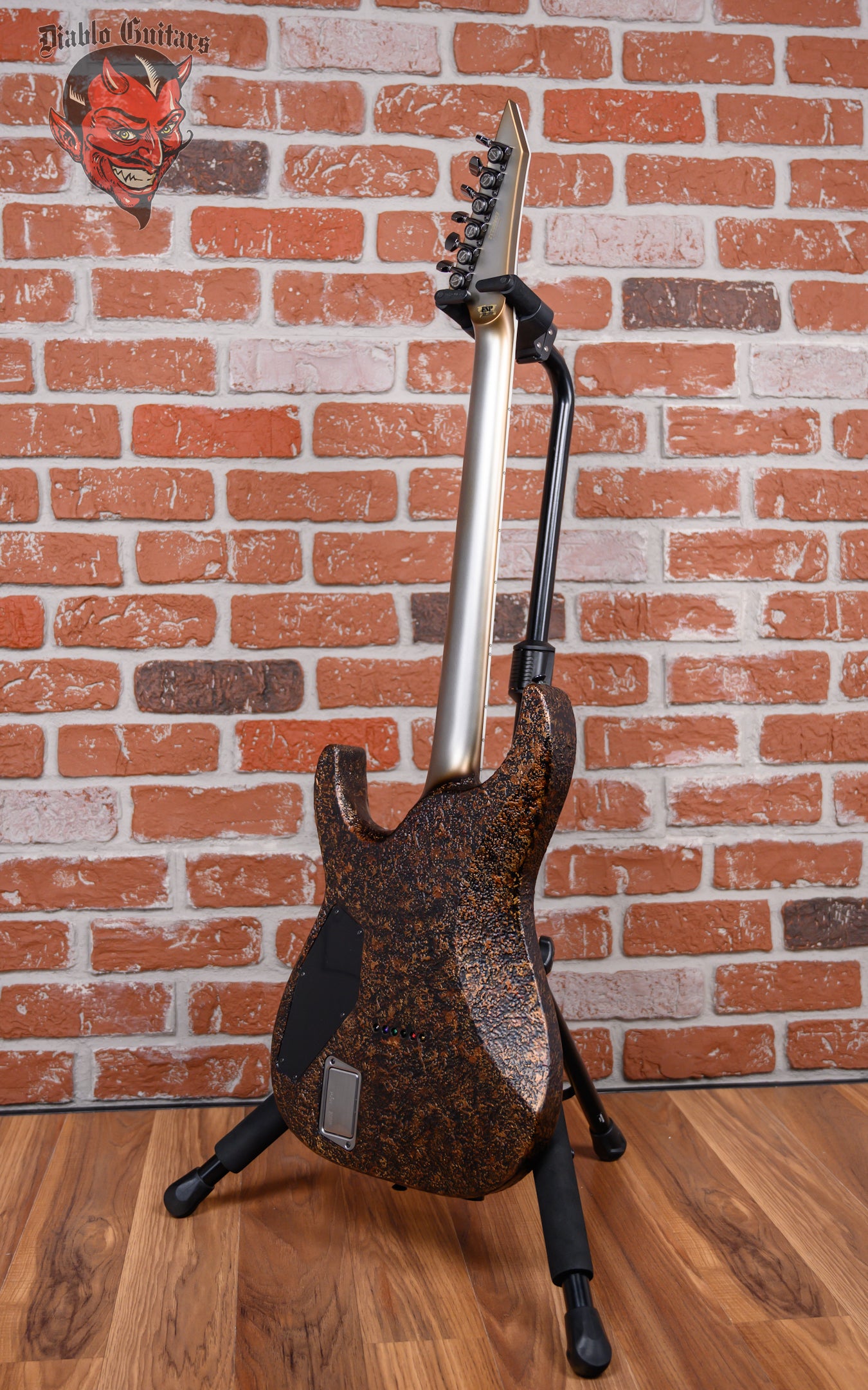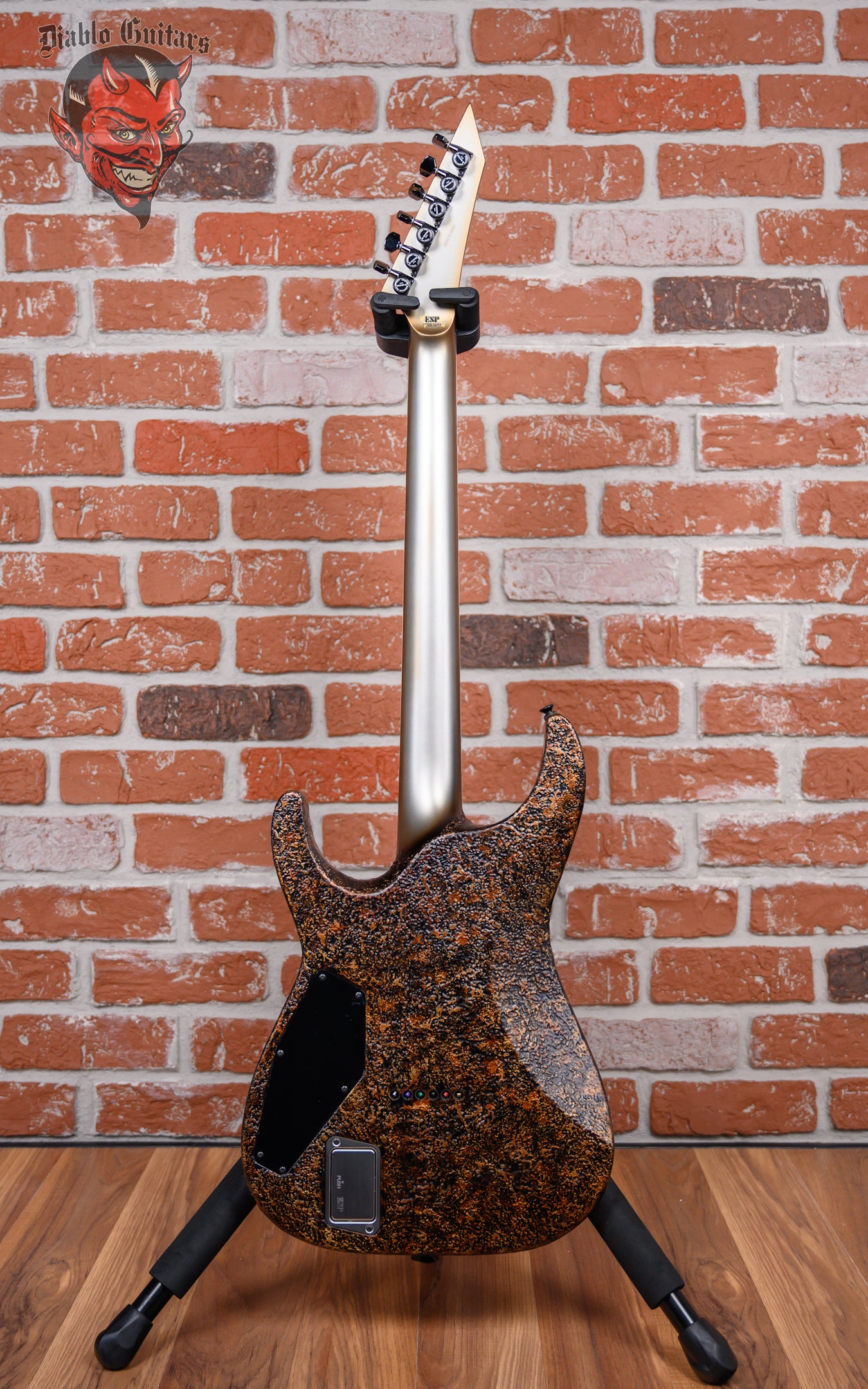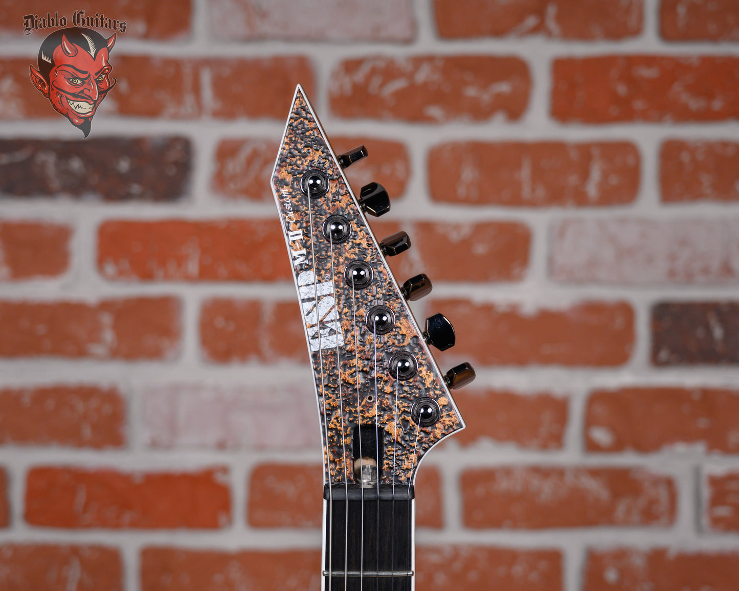 ESP Original Series M-II Custom NT in Cast Metal Rusty Iron finish made in 2023 with Original Hard Shell Case. This guitar features a solid alder body, 3-Piece maple neck-thru and bound ebony fingerboard with a reverse, bound and color matched headstock. Equipped with a EMG brushed black chrome 66TW in the neck position and a EMG brushed black chrome 57TW in the bridge position. Controlled by 1 volume with push/pull coil tap, 1 tone pot with push pull coil tap and a 3-Way blade switch. The 25.5" scale length neck has pearloid offset block inlays and luminlay side markers with 24 extra jumbo frets on a 305mm radius with a thin U profile. The hardware is comprised of black nickel /black gotoh magnum Lock-Trad tuning machines with cloche heads, a carbon fiber nut, a hipshot hardtail 6 bridge and black nickel knurled dome knobs.