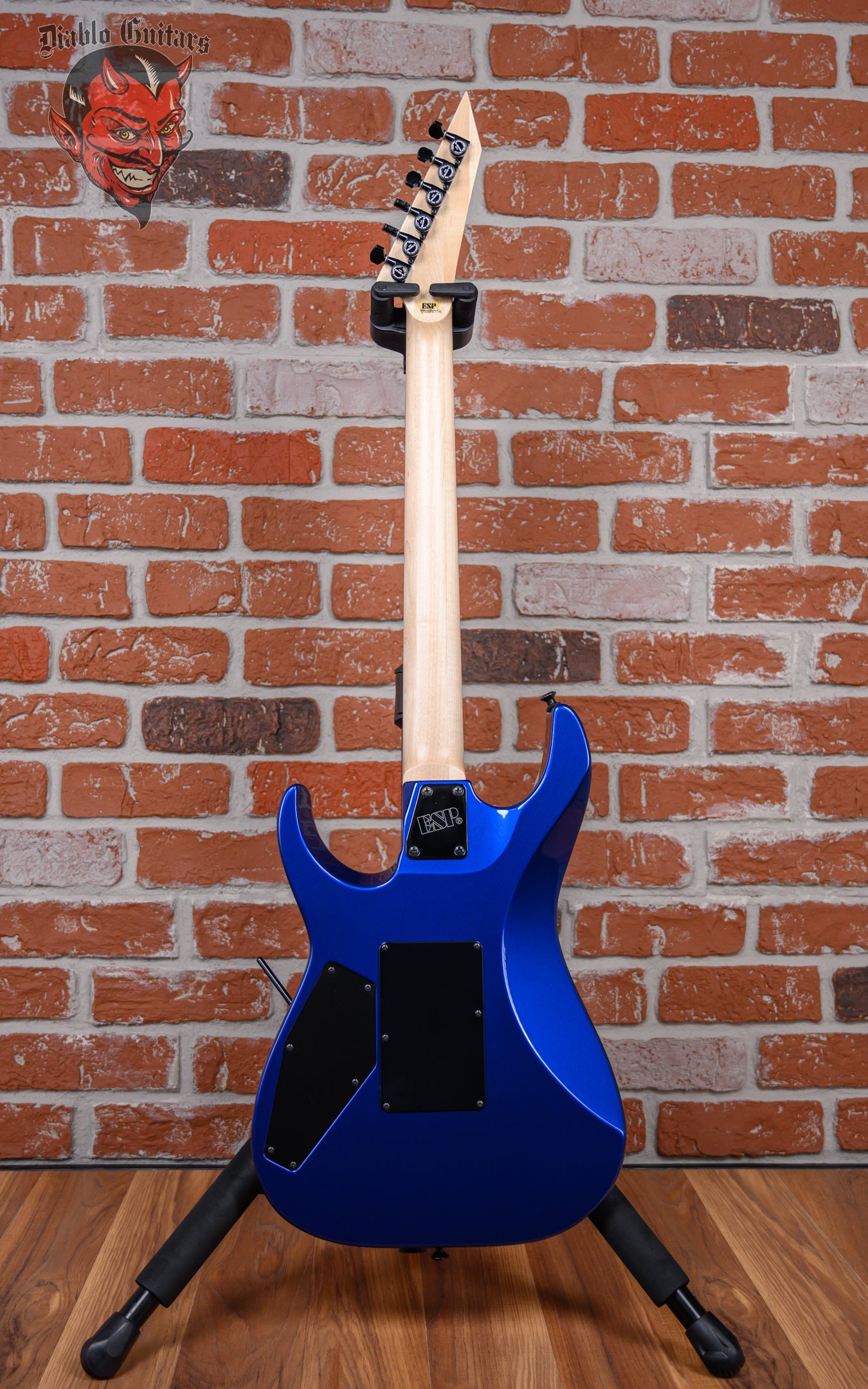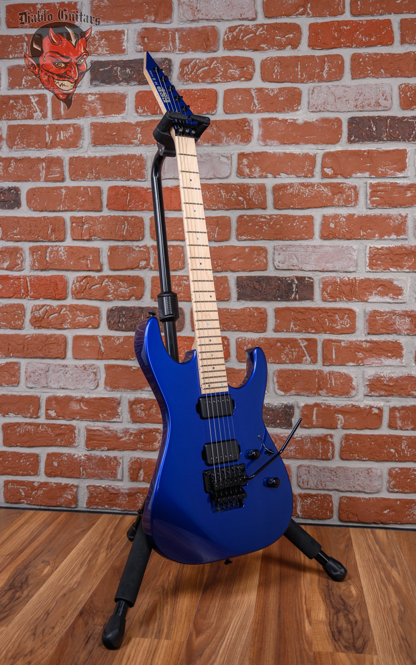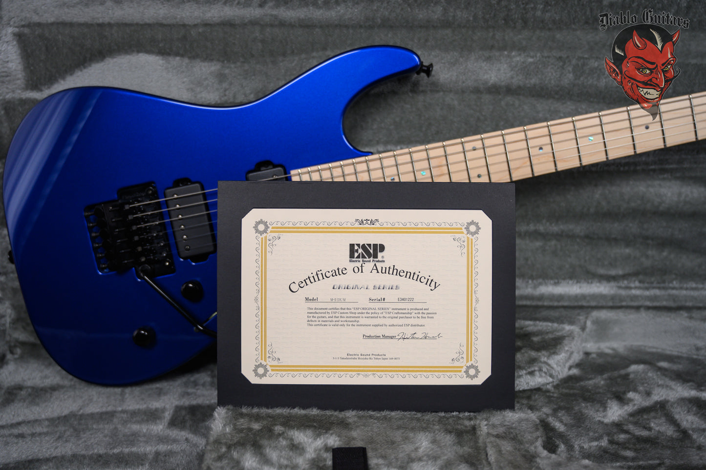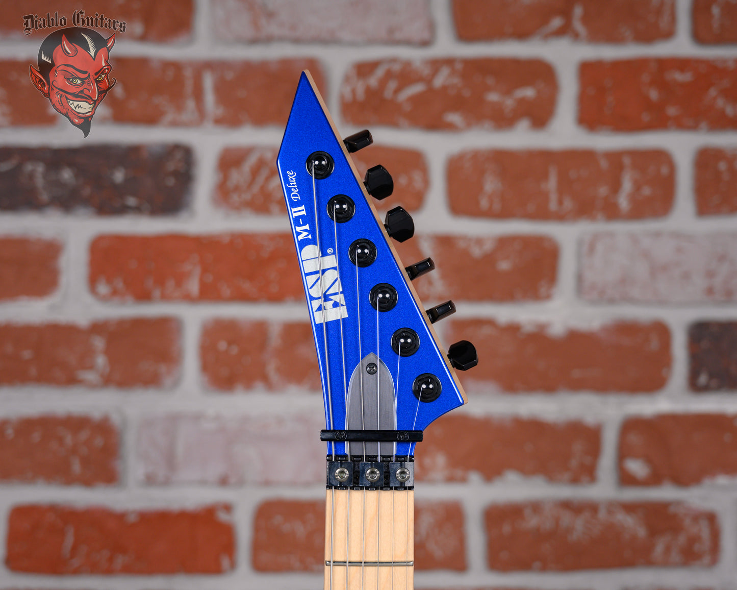 ESP Original Series M-II DX in Portimao Blue finish made in 2022 with Original Hard Shell Case. This guitar features a solid alder body, 3-Piece maple neck and maple fingerboard with a reverse, color matched headstock. Equipped with a Seymour Duncan Sentient in the neck position and a Seymour Duncan Pegasus in the bridge position. Controlled by 1 volume, 1 tone pot with push/push coil tap and a 3-Way blade switch. The 25.5" scale length neck has abalone dot inlays and black side markers with 24 extra jumbo frets on a 305mm radius with a thin U profile. The hardware is comprised of black Gotoh Magnum Lock-Trad tuning machines with cloche heads, a Floyd Rose Locking nut, a Floyd Rose Original Double Locking Tremolo bridge and black knurled dome knobs.