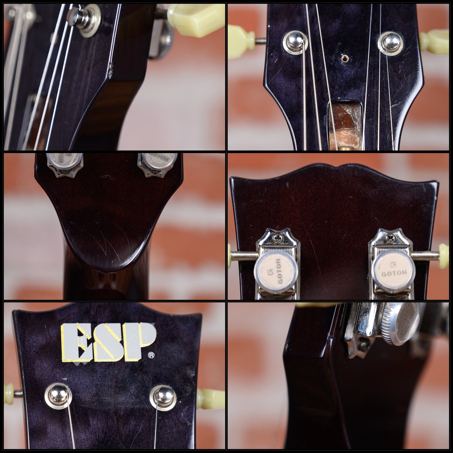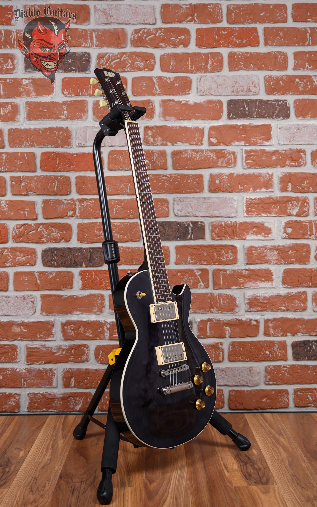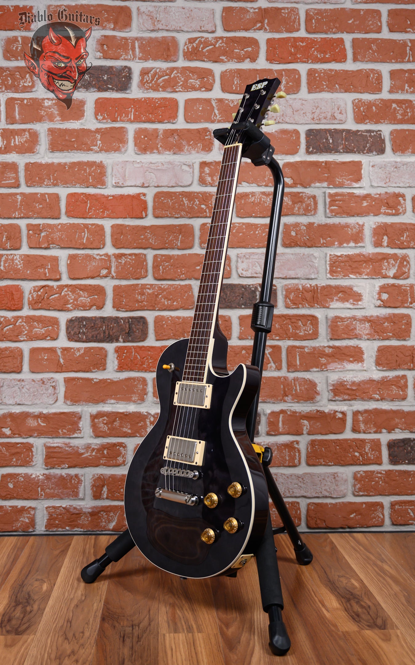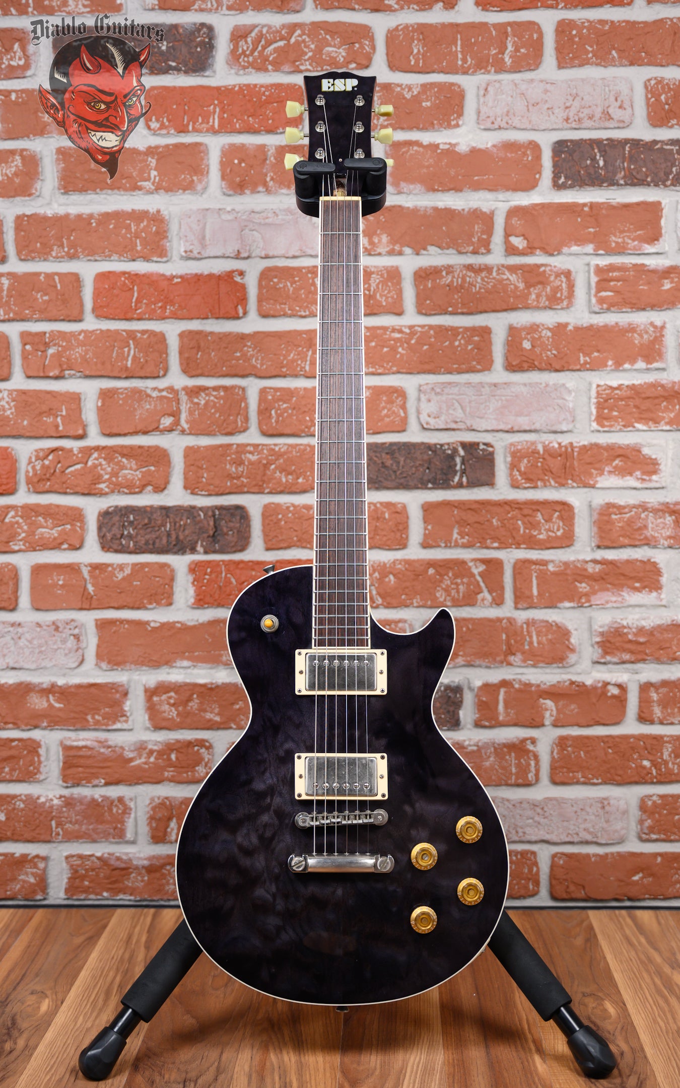 ESP Pre Lawsuit Era LPS500 Custom Order Quilted Maple Top in Transparent Black finish made in Early 1990s with Hard Shell Case. This guitar features a solid mahogany body with a bound quilted maple top, mahogany neck and bound rosewood fingerboard with a color matched quilted maple overlay headstock. Equipped with a Seymour Duncan SH55 seth lover in the neck position and a Seymour Duncan SH55 seth lover in the bridge position. Controlled by 2 volume, 2 tone pots and a 3-Way toggle switch. The 24.75" scale length neck has no inlays, black side markers with 22 medium jumbo frets on a 305mm radius with a thin U profile. The hardware is comprised of nickel/chrome gotoh MG-T locking tuning machines with keystone heads, a bone nut, a gotoh Tune-o-matic bridge and gold top hat knobs.