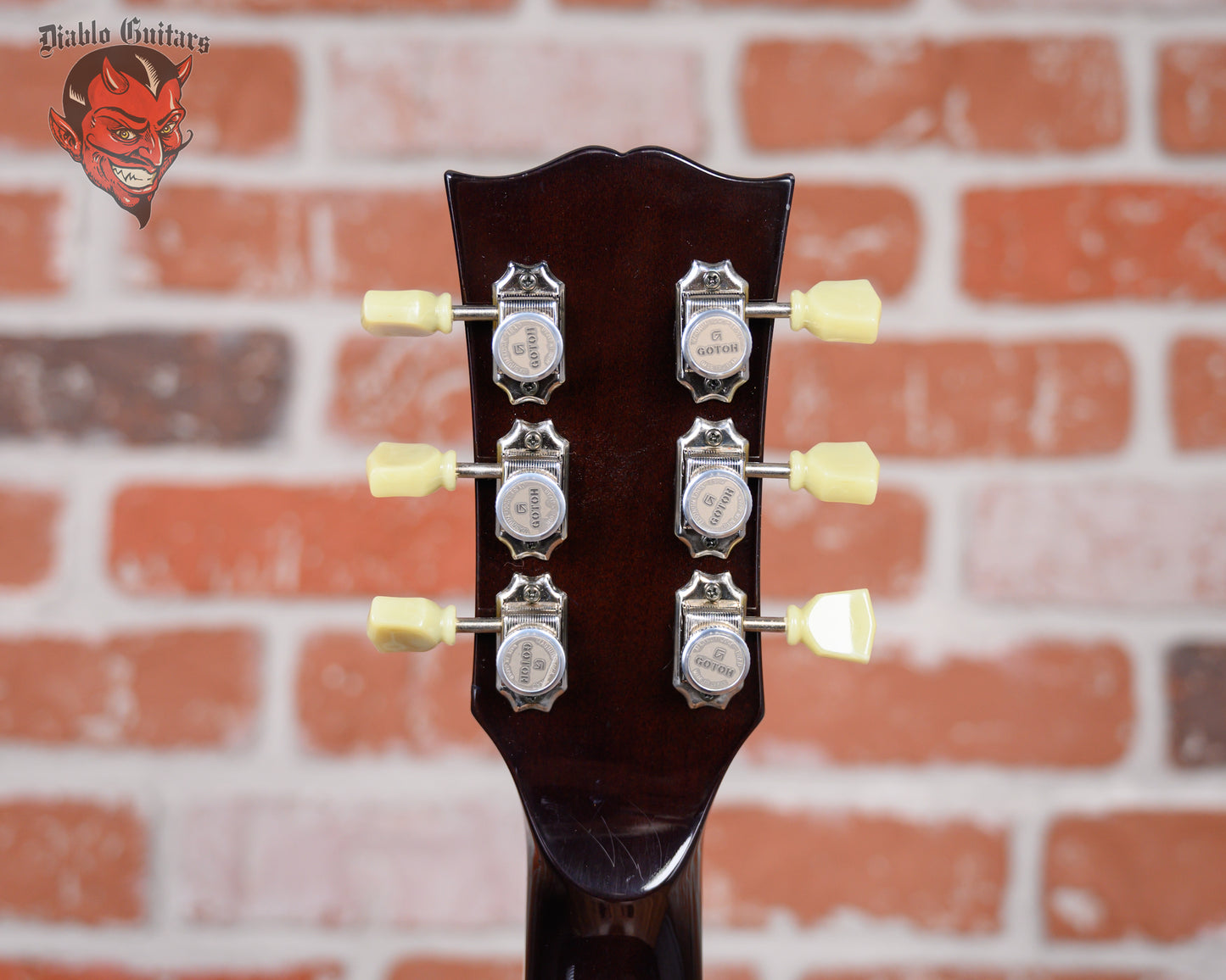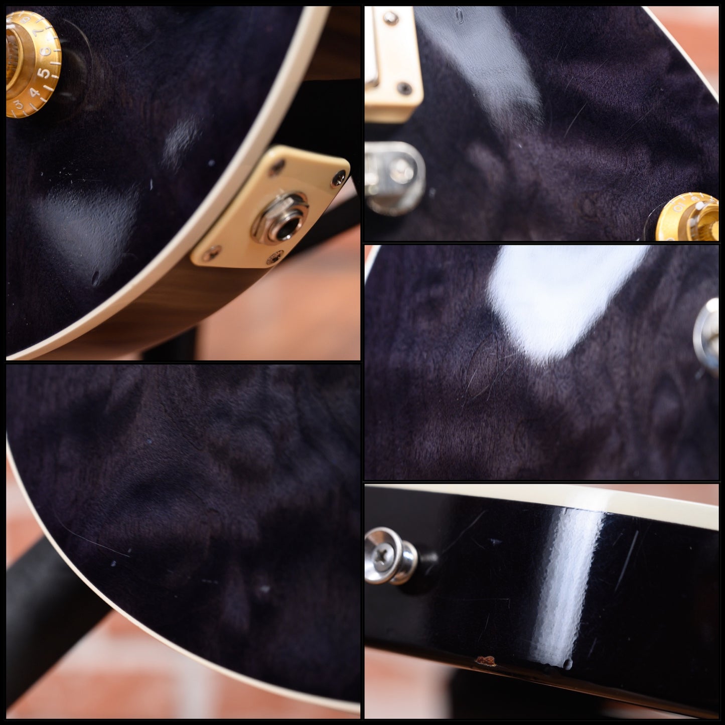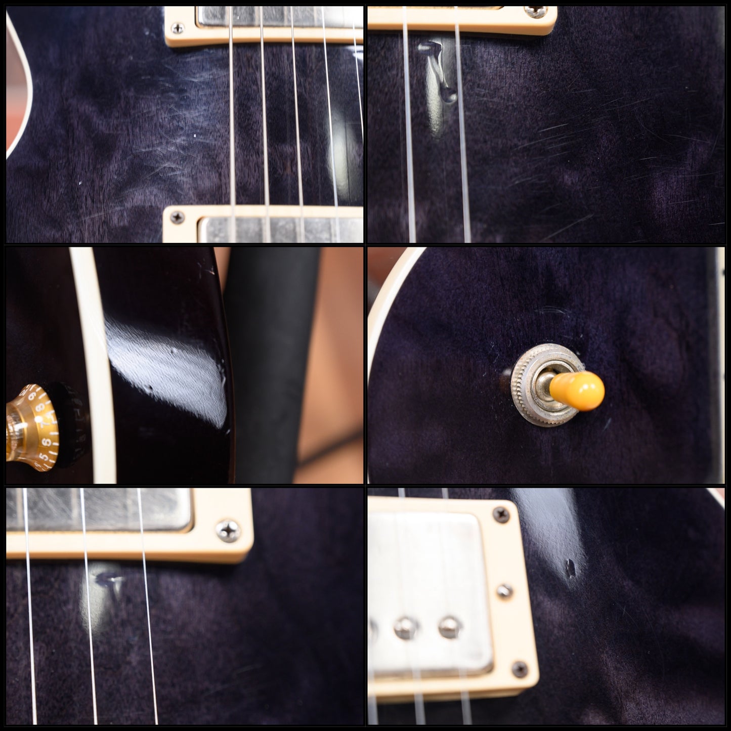 This Guitar has no visible serial number and we believe this is an early 90's custom order. Based on its pre lawsuit 4 knob layout and pre Eclipse, Gibson les paul standard headstock and body cuts pre date the Eclipse's modified shape as we know it from 1995 and on. The 4- knob layout remained for several more years into the 2000s, but the headstock shape and body shape pre dates the Eclipse.